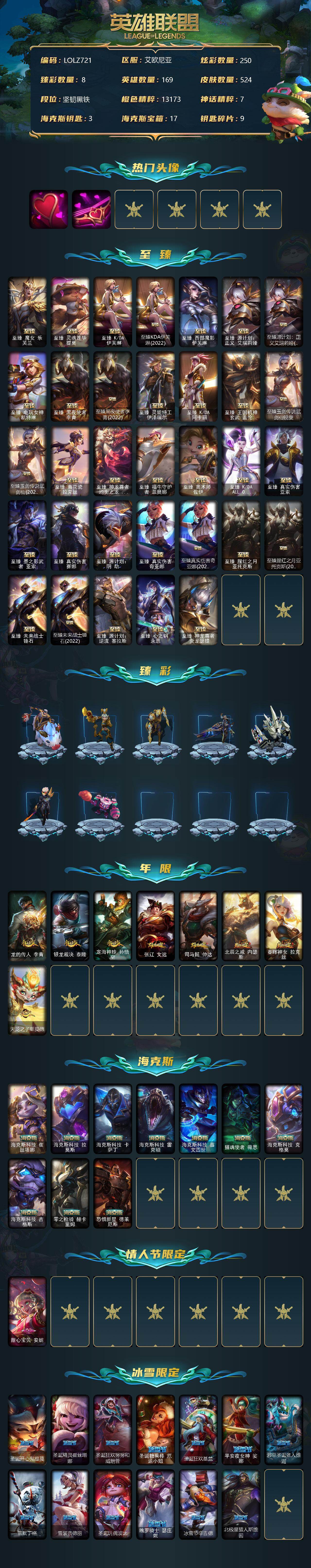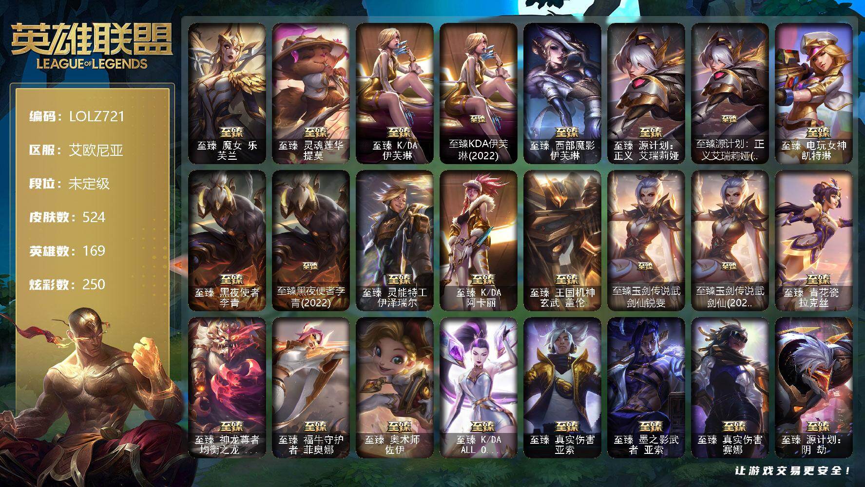 【9784356】【LOLZ721】169英雄/524皮肤/48神话/68限定/8臻彩/250炫彩/52传说/132史诗/未定级/爱意绵绵/爱情之歌/至臻魔女乐芙兰/至臻灵魂莲华提莫/至臻K/DA伊芙琳/至臻KDA伊芙琳(2022)/至臻西部魔影伊芙琳/至臻源计划:正义艾瑞莉娅/至臻源计划:正义艾瑞莉娅(2022)/至臻电玩女神凯特琳/至臻黑夜使者李青/至臻黑夜使者李青(2022)/至臻灵能特工