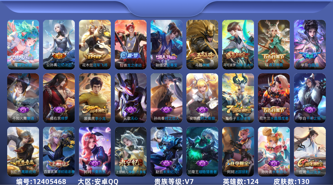 [12405468]贵族等级: V7 英雄数: 124 皮肤数: 130 传说皮: 冠军飞将,记忆之芯 限定皮: 李小龙,白晶晶,神威,至尊宝,高山流水,时之祈愿-瑶,五谷丰年,神器·万象笔,山海·玄木吟