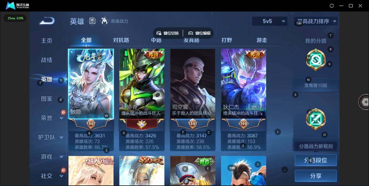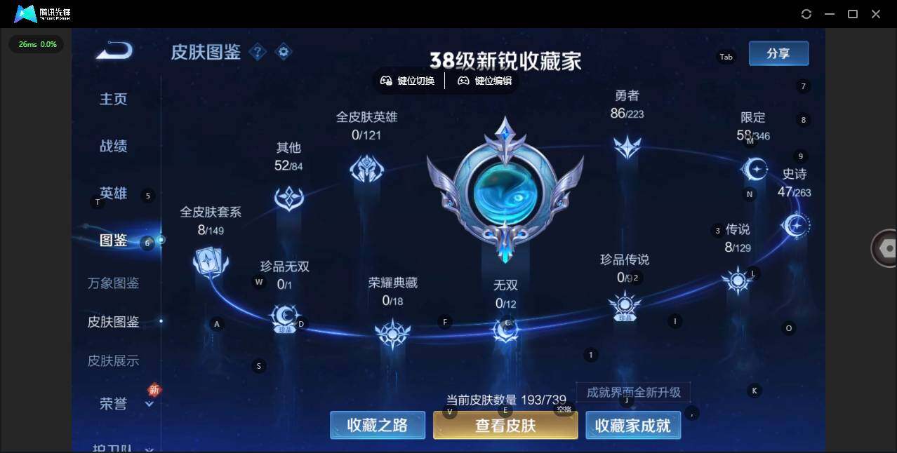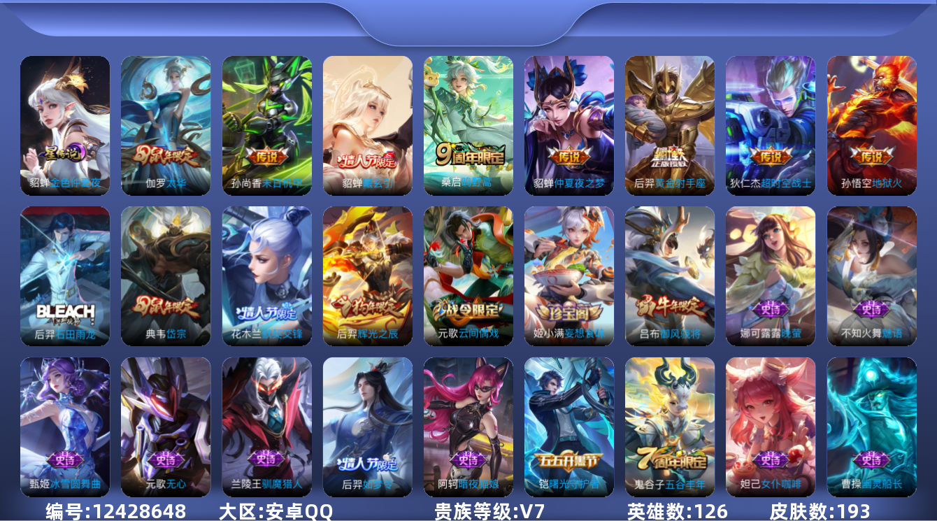 [12428648]贵族等级: V7 英雄数: 126 皮肤数: 193 星传说: 金色仲夏夜 传说皮: 黄金射手座,末日机甲-孙尚香,地狱火,仲夏夜之梦,超时空战士-狄仁杰,貂蝉曦玄引 限定皮: 游园惊梦,御风骁将,辉光之辰,岱宗,太华,寅虎·御盾,如梦令-后羿,默契交锋-花木兰,五谷丰年,鸣野蒿