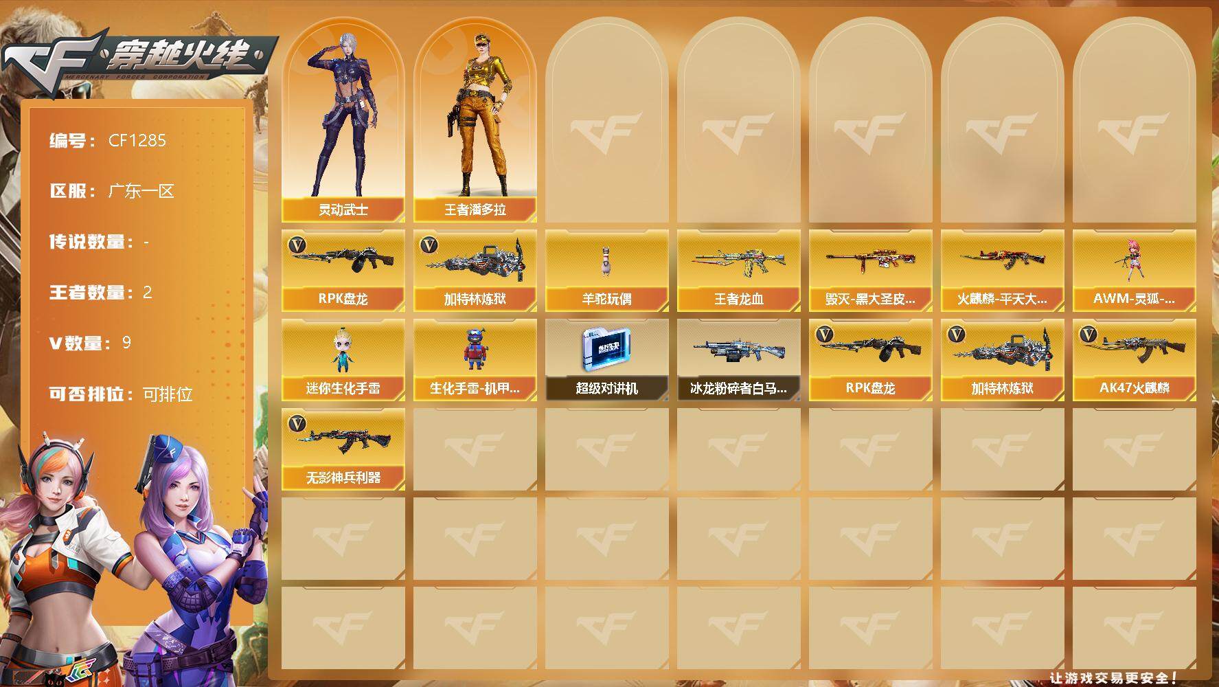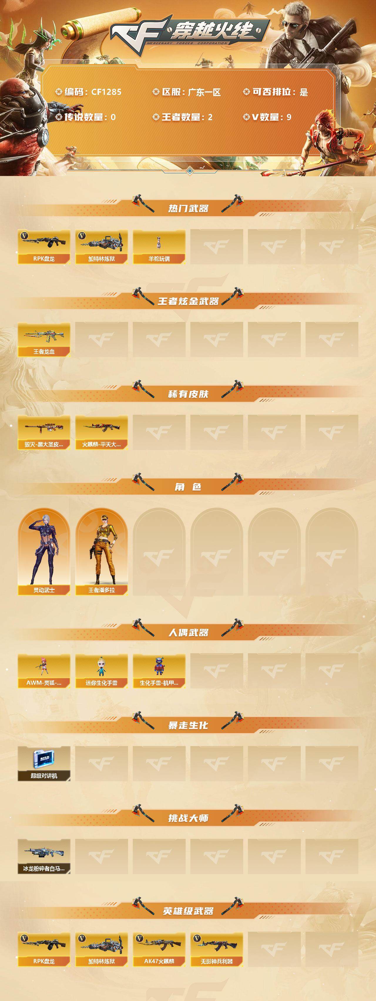 【10961096】【10961096】【CF1285】9V/70级/校官/2王者/RPK-盘龙/加特林-炼狱/羊驼玩偶/王者龙血/火麒麟-平天大圣/巴雷特-