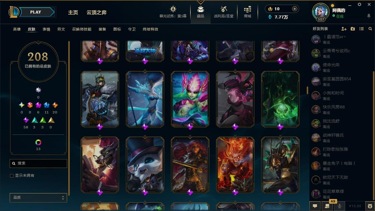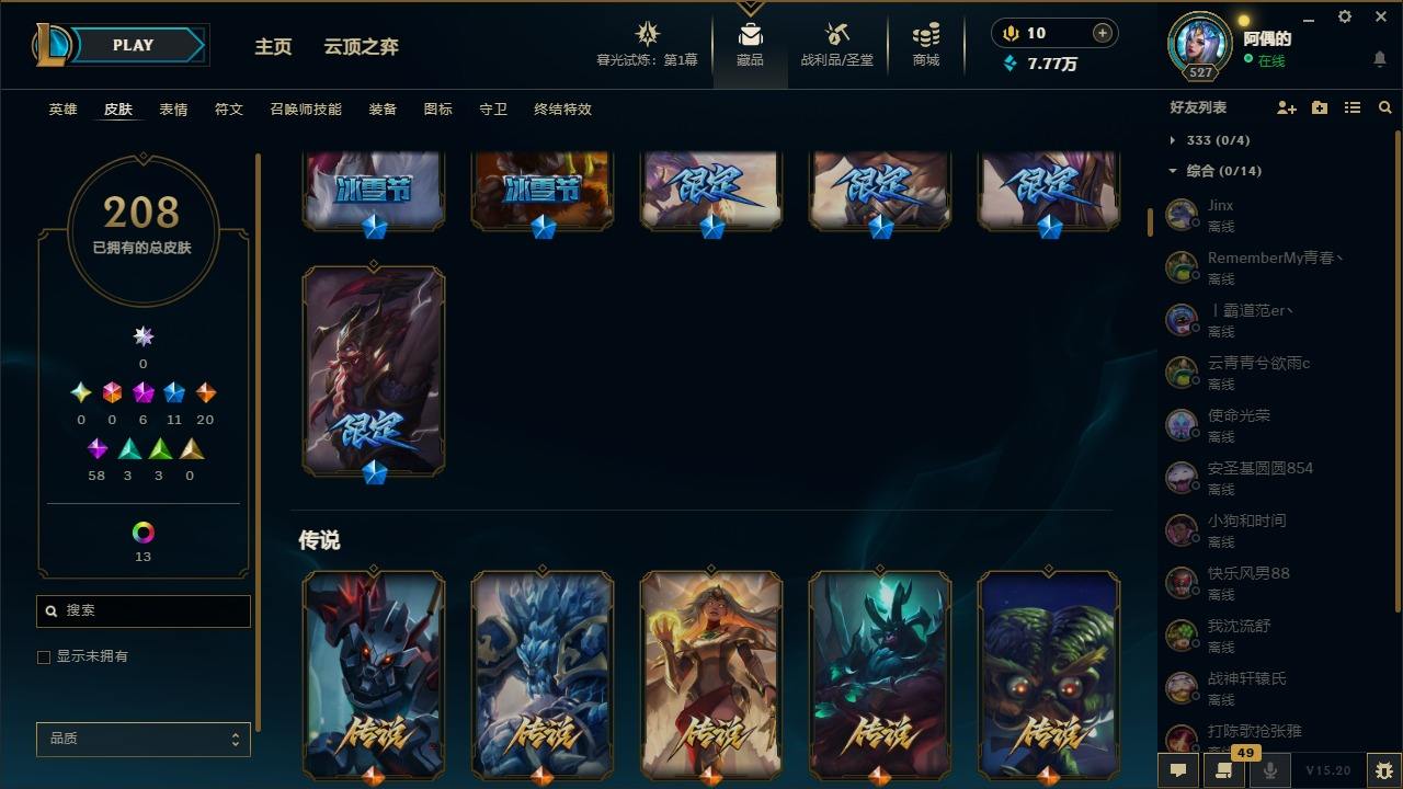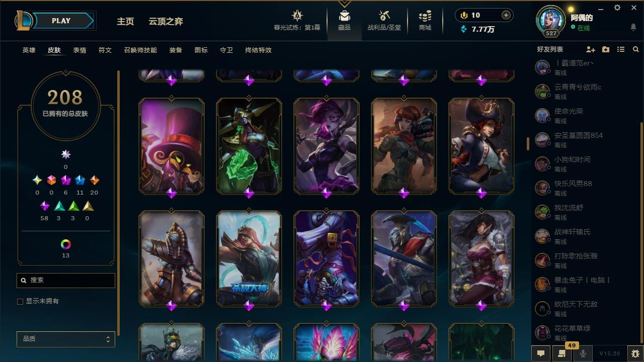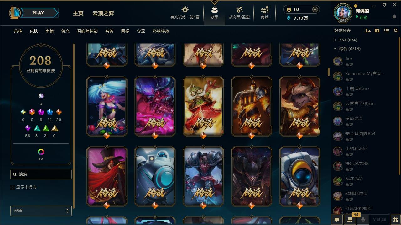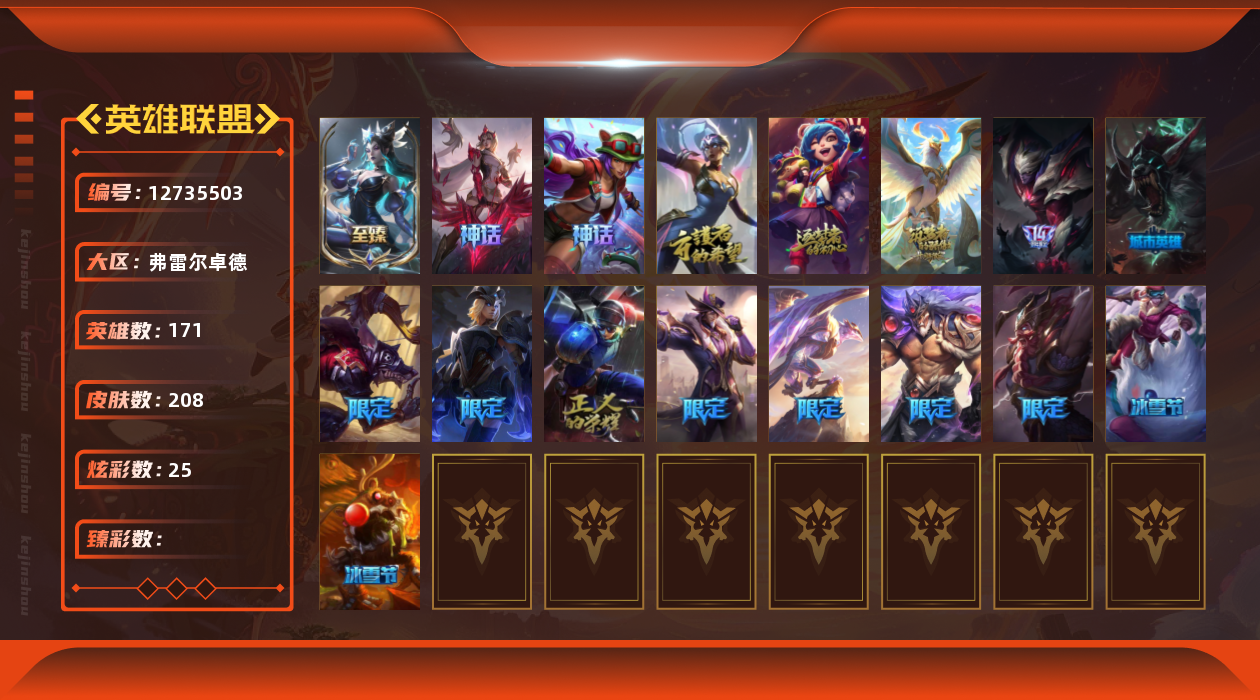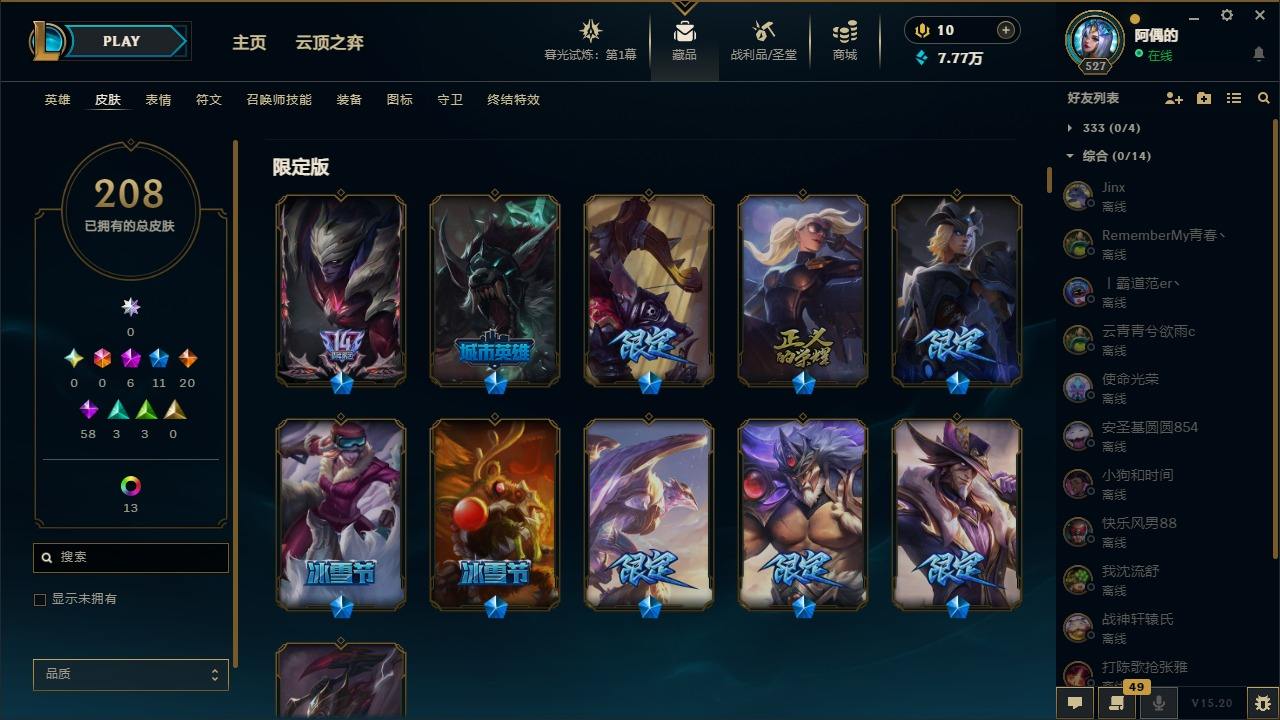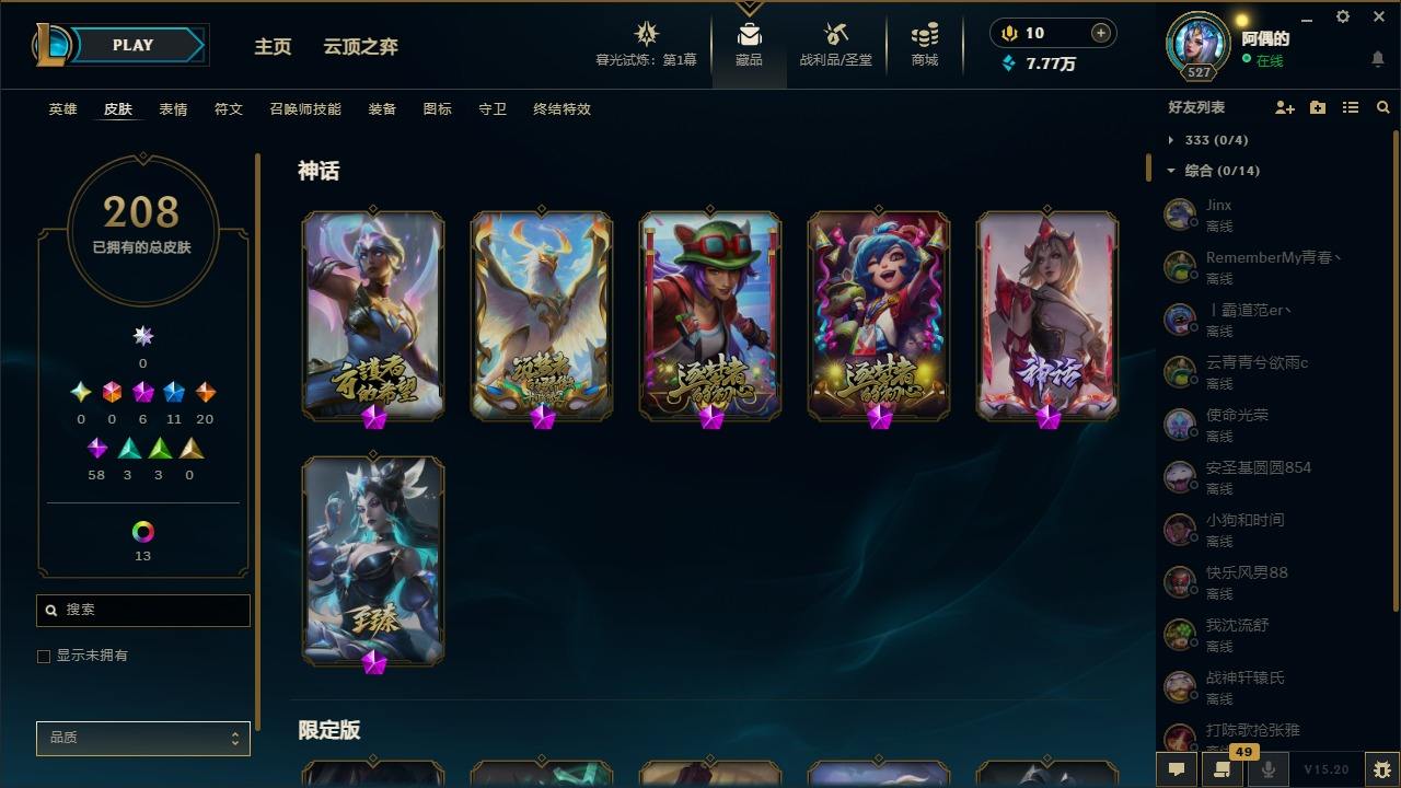 【10975941】[12735503]6神话 11限定 20传说 58史诗 208皮肤 25炫彩 171英雄 可二次 可修改实名 【至臻】:至臻 星之守护者 辛德拉,水晶圣骑 艾希 【赛季限定皮】:胜利凤凰 艾尼维亚,胜利之运 崔斯特,胜利之王 泰达米尔 【冠军限定系列】:S6 SKT T1 奥拉夫 【冰雪节限定】:魄罗骑士 瑟庄妮,圣诞驯鹿 克格莫 【周年】:10周年 安妮,10周年 凤凰