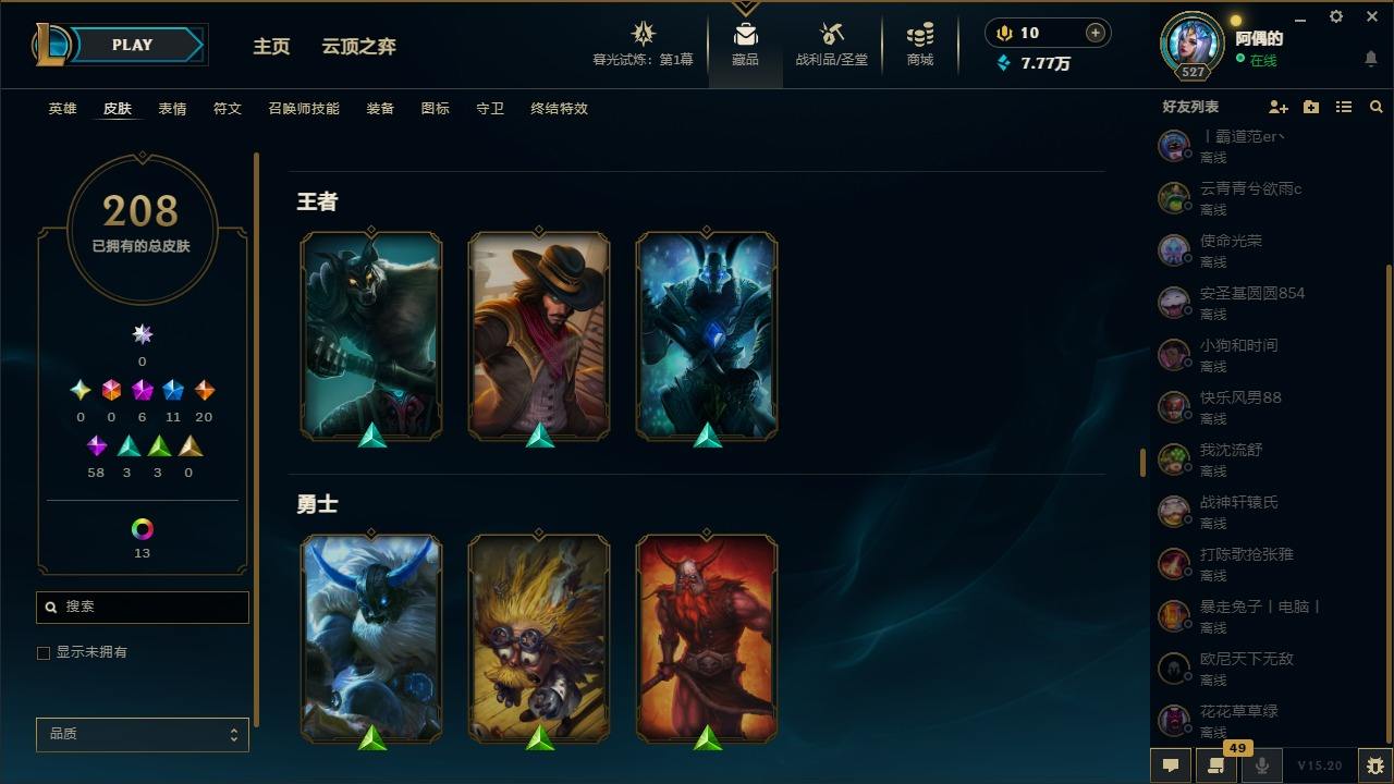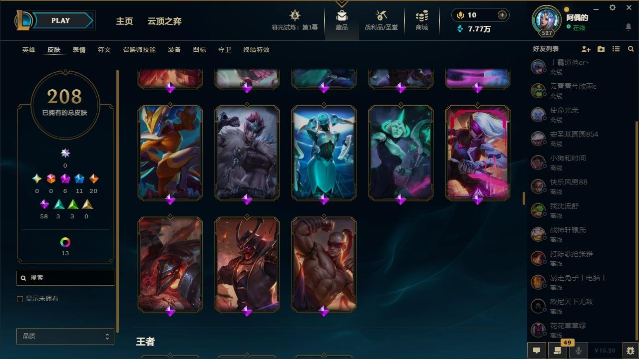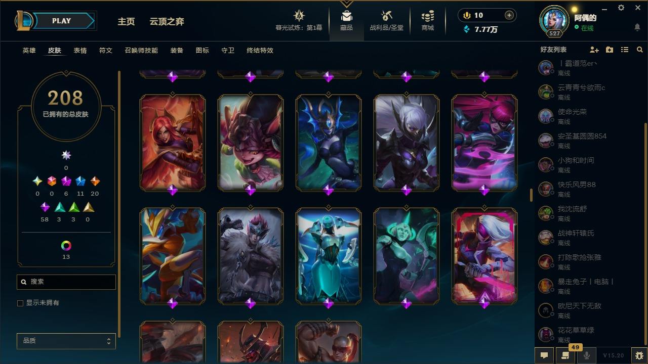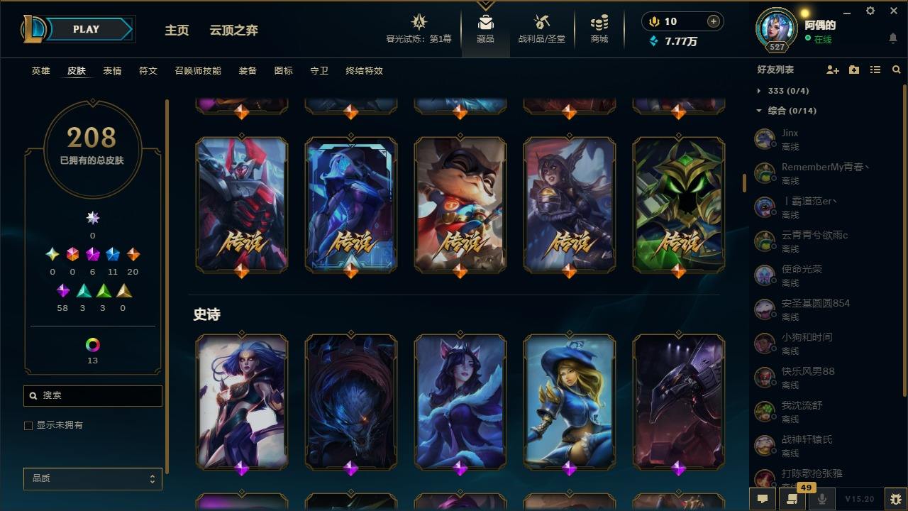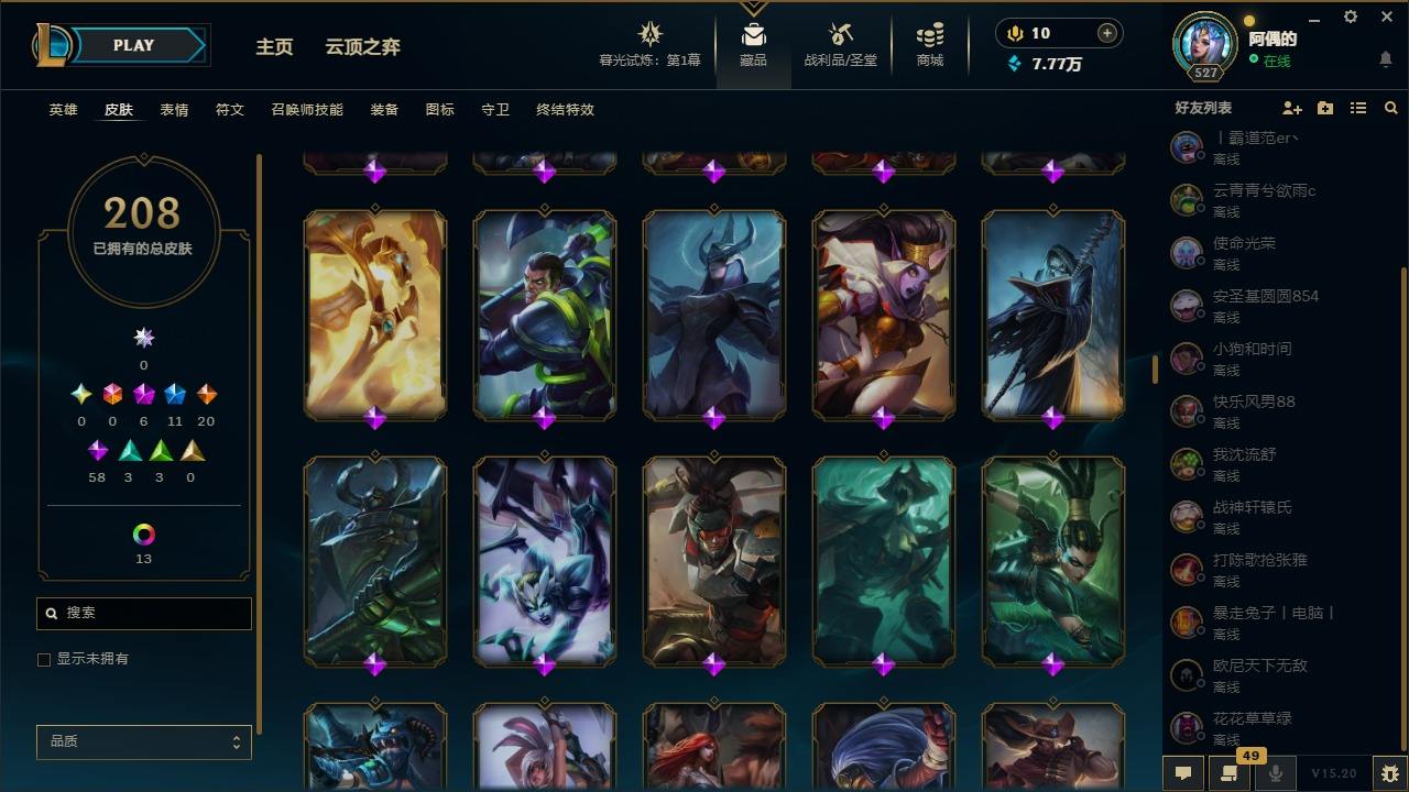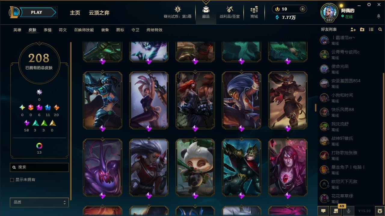 【10975941】[12735503]6神话 11限定 20传说 58史诗 208皮肤 25炫彩 171英雄 可二次 可修改实名 【至臻】:至臻 星之守护者 辛德拉,水晶圣骑 艾希 【赛季限定皮】:胜利凤凰 艾尼维亚,胜利之运 崔斯特,胜利之王 泰达米尔 【冠军限定系列】:S6 SKT T1 奥拉夫 【冰雪节限定】:魄罗骑士 瑟庄妮,圣诞驯鹿 克格莫 【周年】:10周年 安妮,10周年 凤凰