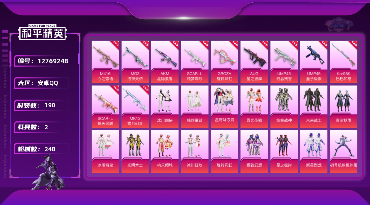 【10983253】【可二次】【安卓QQ】M416-心之恋语 都市猎人 新星烈龙 UMP45-相思残雪 角色-初号机款机体服 MG3-洛神天依 派对舞王 极致幻想 未来战士 紫螳螂 AUG-星之彼岸 暗影哥特