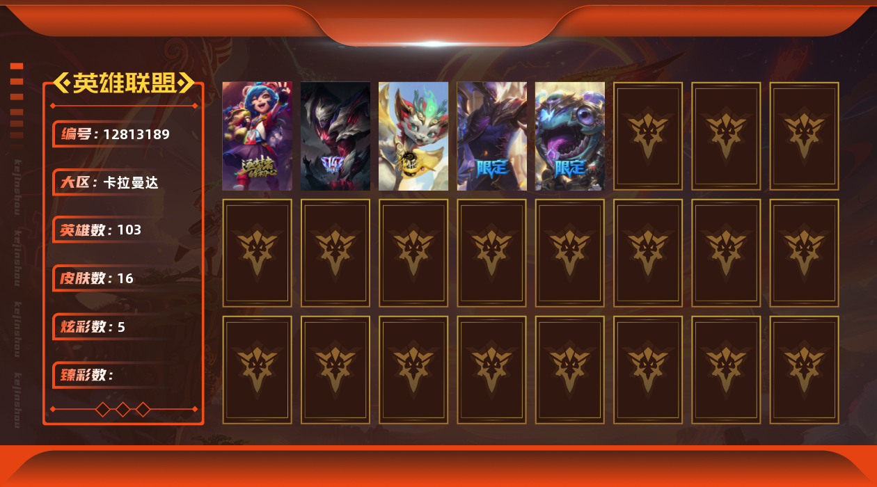 【10992625】[12813189]实名: 不可修改 英雄数: 103 皮肤数: 16 炫彩数: 5 赛季限定皮: 胜利之剑 亚托克斯,胜利巨口 克格莫 年限: 天龙之子 斯莫德 周年: 10周年 安妮 其他限定/神话皮: 暗裔英雄 盖伦