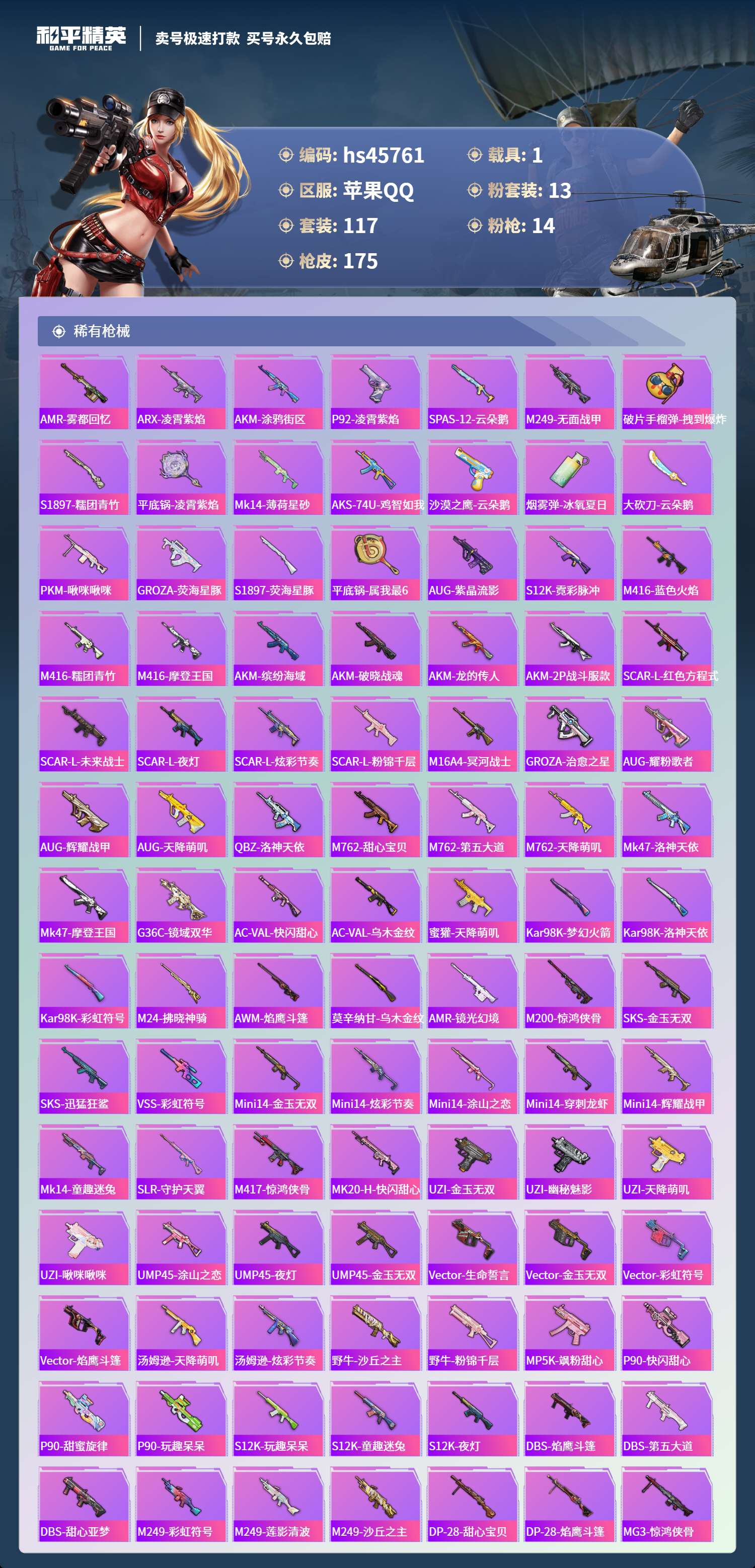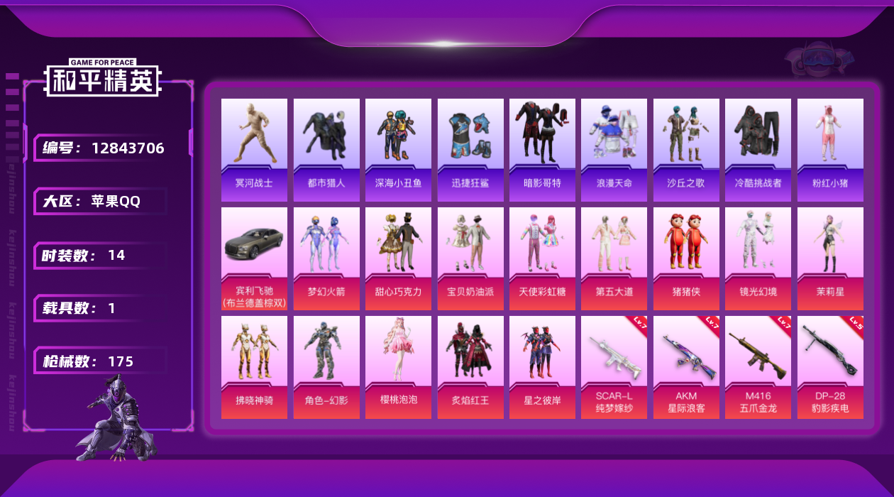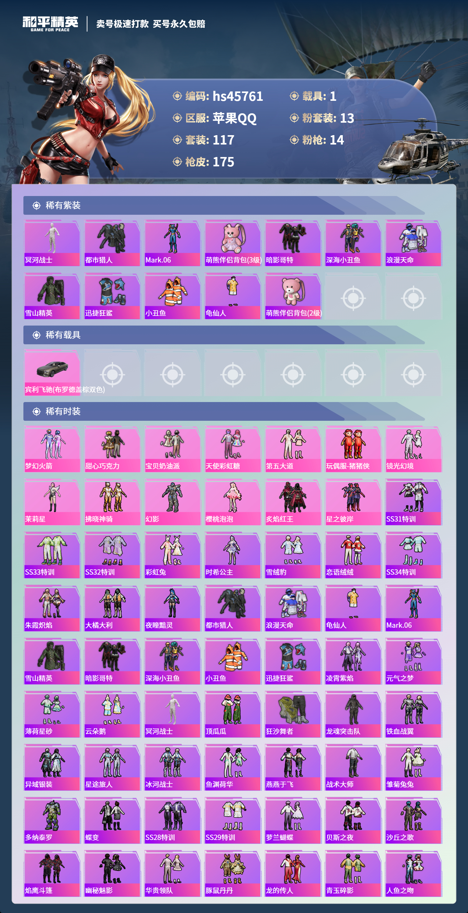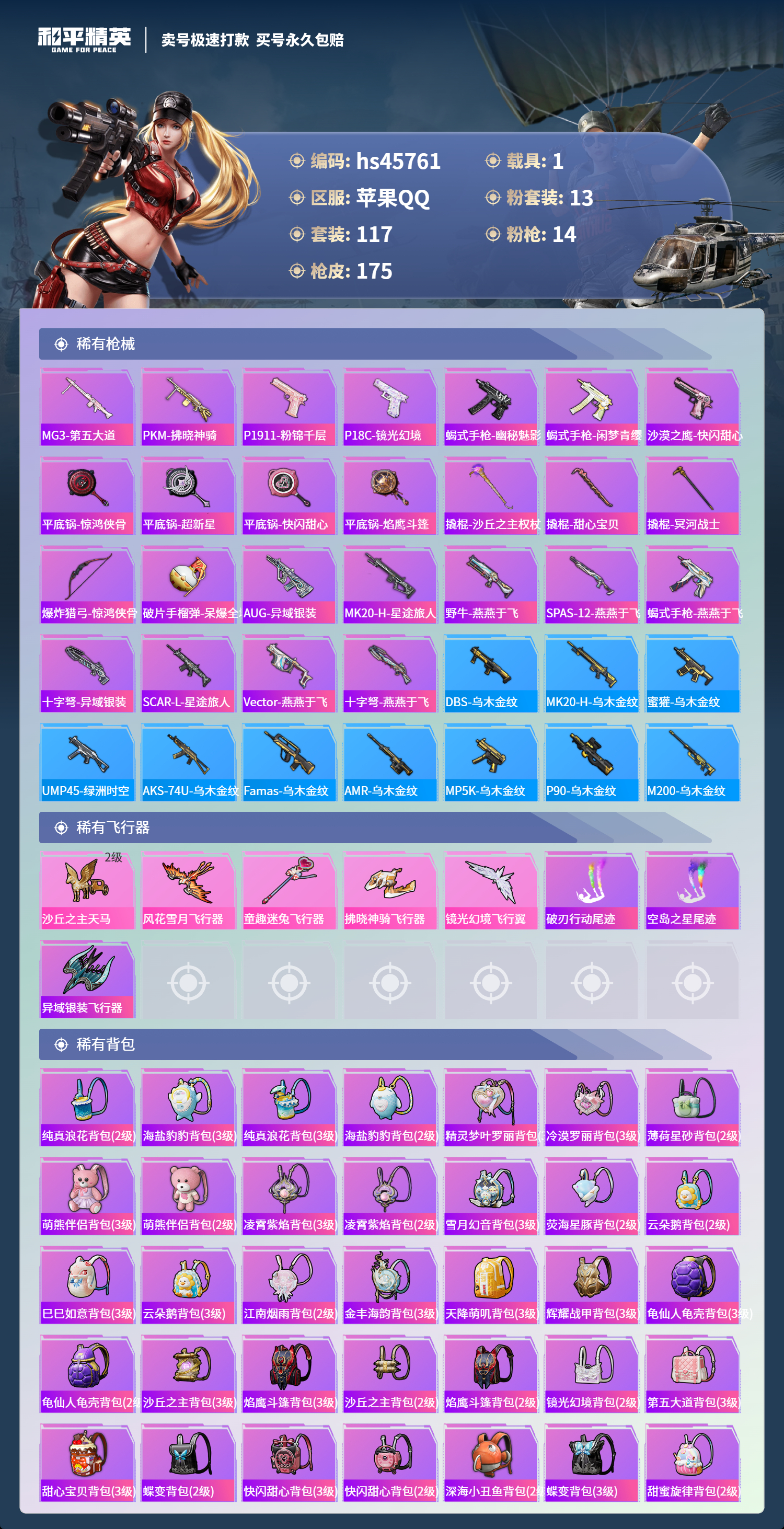 【10998924】【不可二次】【苹果QQ】龟仙人 木乃伊 水银刺客 AKM-星际浪客 M416-五爪金龙 P90-沙丘之主 拂晓神骑飞行器 都市猎人 炙焰红王 豚鼠丹丹 M416-电玩时刻 风花雪月飞行器 UMP45-量子极限 星之彼岸 深海小丑鱼 SCAR-童趣迷兔 童趣迷兔飞行器 AMR-炫光之旅 浪漫天命 猪猪侠 镜光幻境飞行翼 迅捷狂鲨 甜心巧克力 M417射手步枪 狂沙舞者 M416