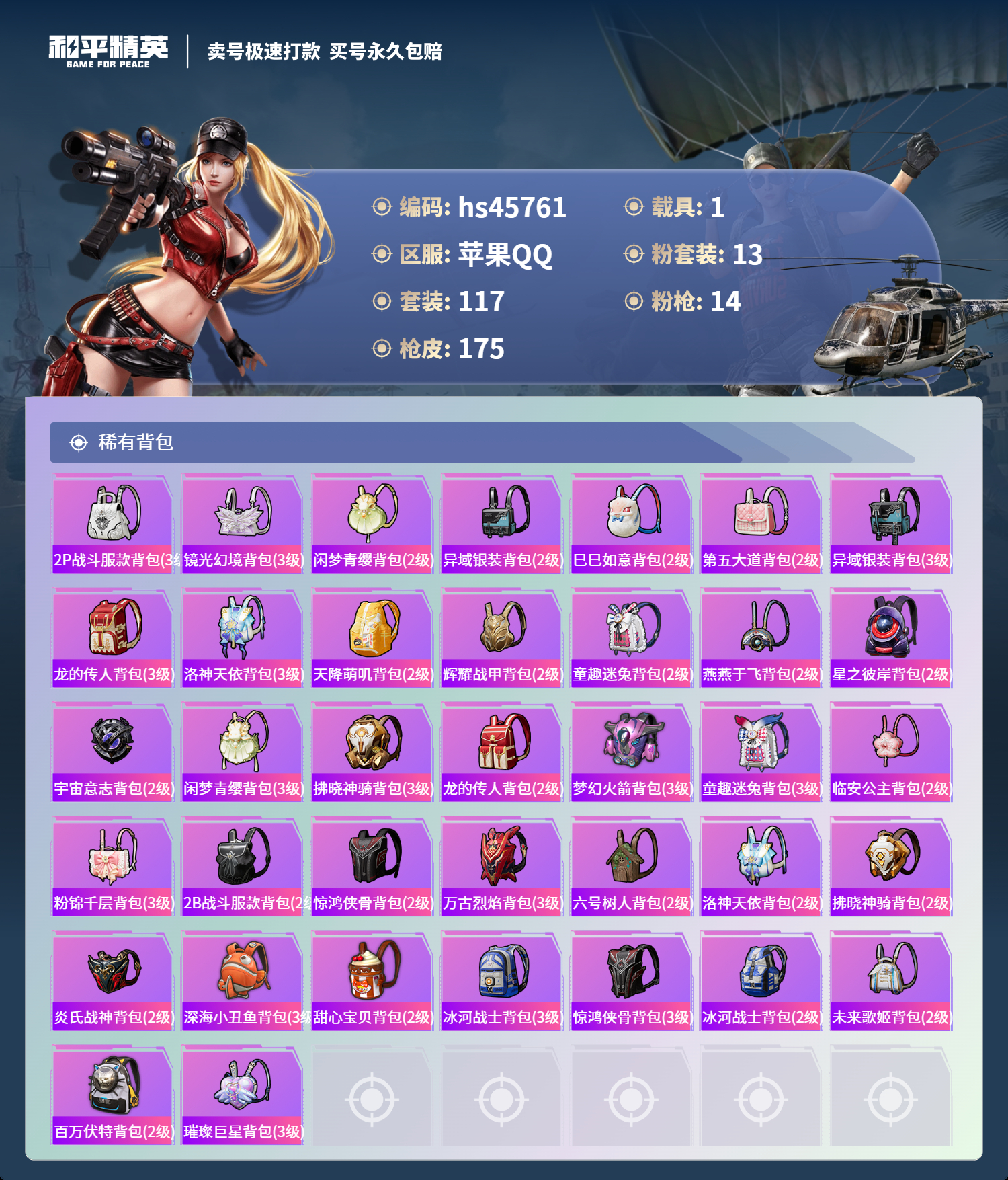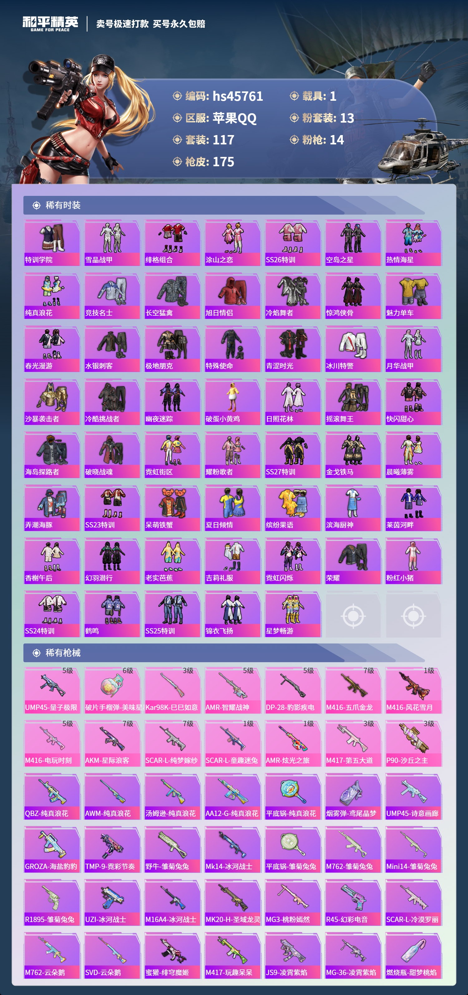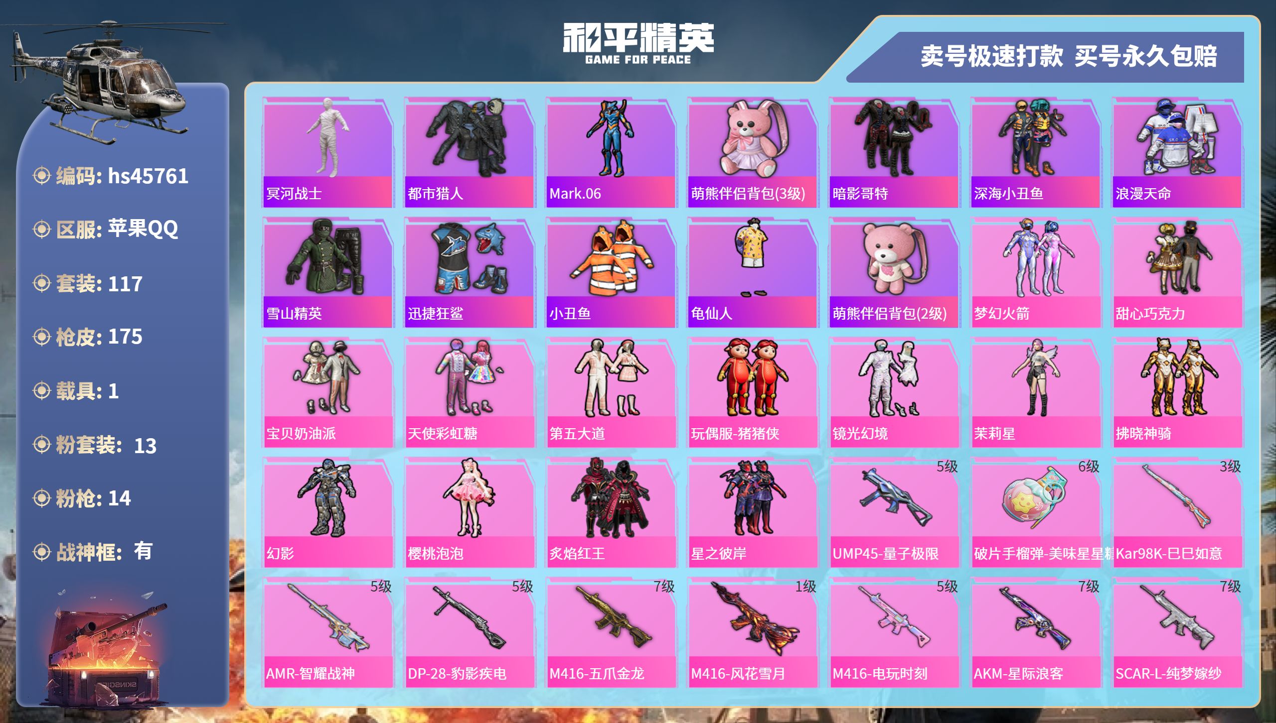 【10998924】【不可二次】【苹果QQ】龟仙人 木乃伊 水银刺客 AKM-星际浪客 M416-五爪金龙 P90-沙丘之主 拂晓神骑飞行器 都市猎人 炙焰红王 豚鼠丹丹 M416-电玩时刻 风花雪月飞行器 UMP45-量子极限 星之彼岸 深海小丑鱼 SCAR-童趣迷兔 童趣迷兔飞行器 AMR-炫光之旅 浪漫天命 猪猪侠 镜光幻境飞行翼 迅捷狂鲨 甜心巧克力 M417射手步枪 狂沙舞者 M416