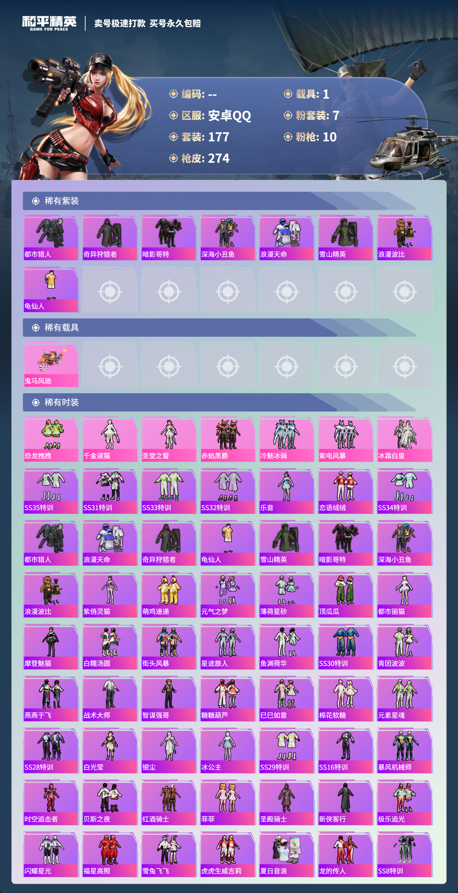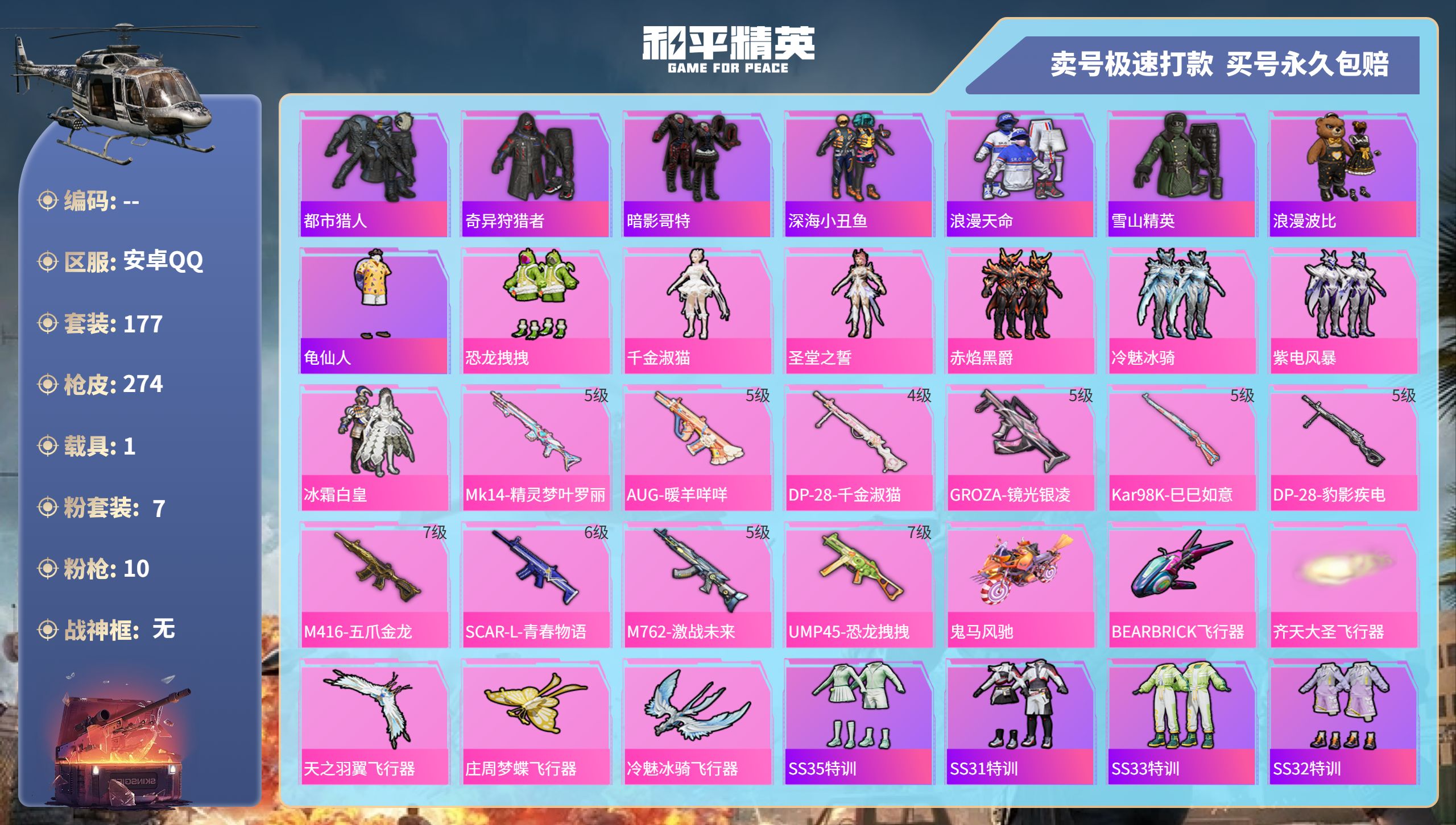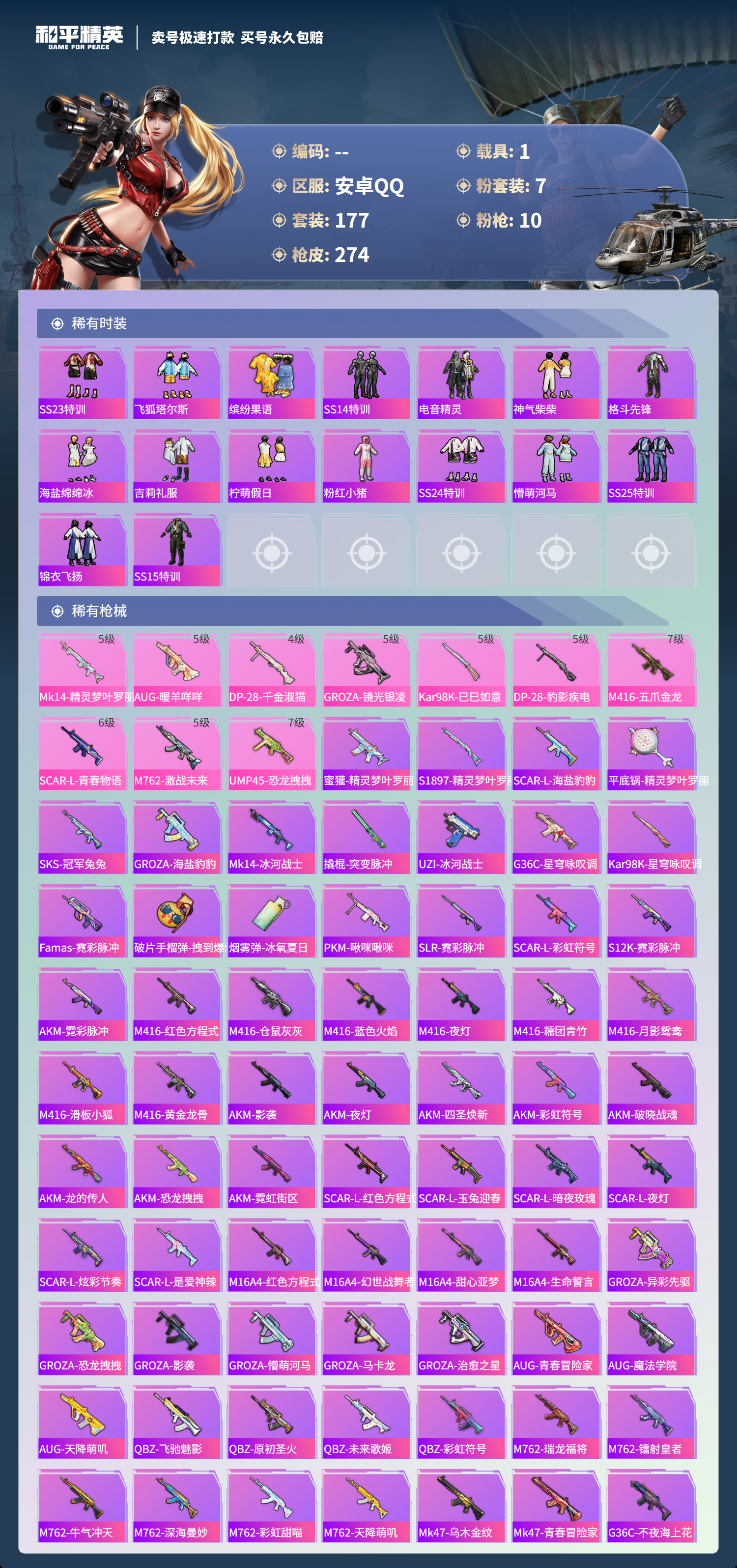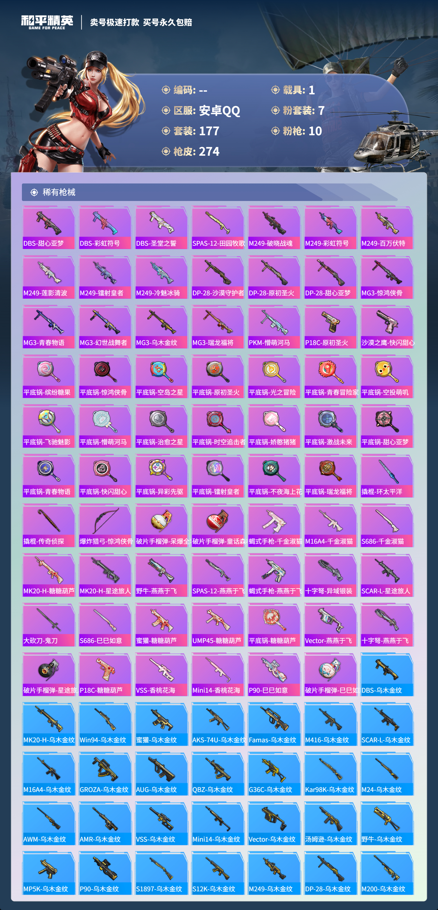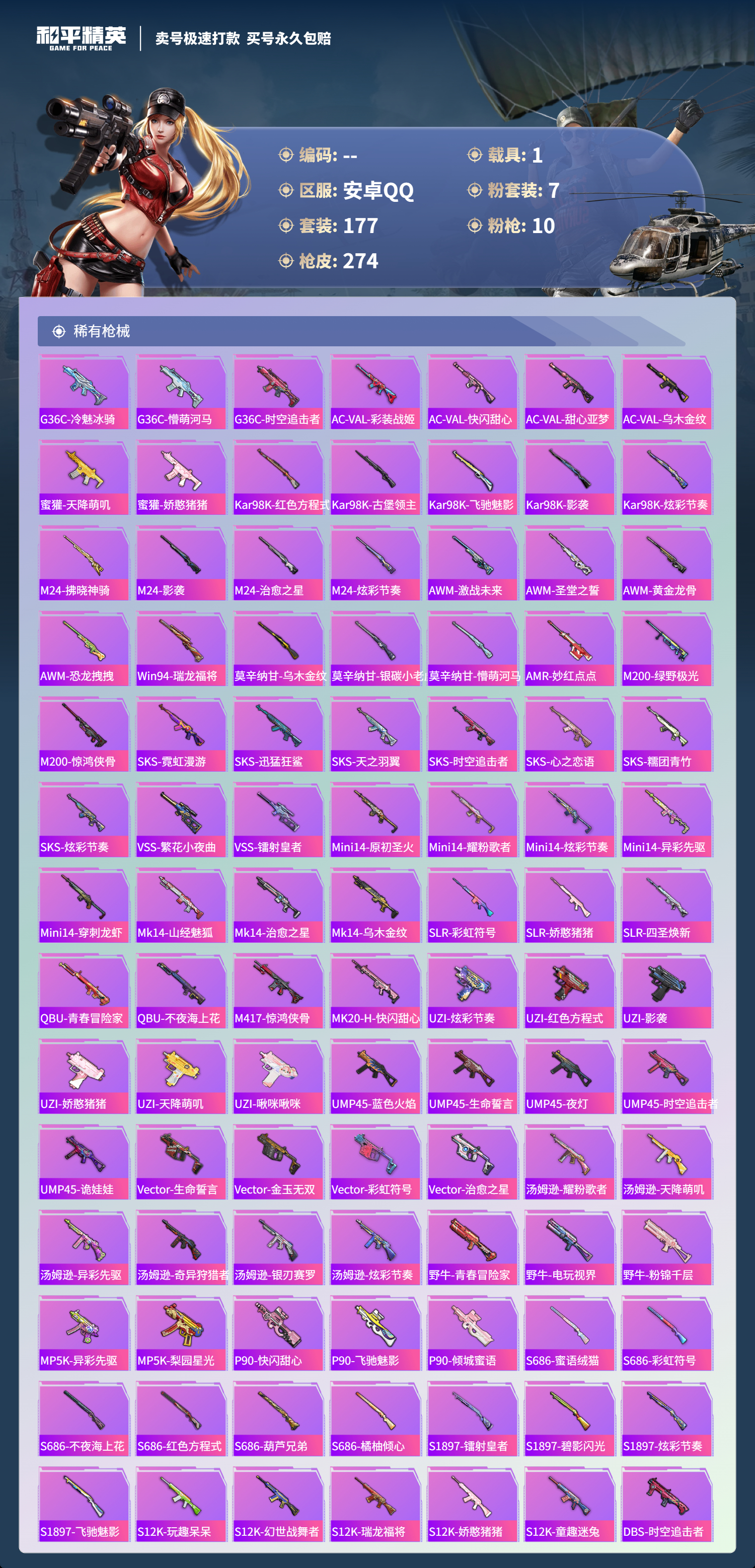 【11004494】【不可二次】【安卓QQ】龟仙人 MK14-精灵梦叶罗丽 恐龙拽拽 M416-五爪金龙 漫步者 粉甜马卡龙 都市猎人 极速红龙 UMP45-恐龙拽拽 庄周梦蝶飞行器 赤焰黑爵 M416-仓鼠灰灰 深海小丑鱼 浪漫波比 瑞龙福将 AWM-激战未来 M416-黄金龙骨 浪漫天命 AWM-黄金龙骨 团圆交子 紫电风暴 M762-激战未来 奇异狩猎者 M762-瑞龙福将 齐天大圣飞行器