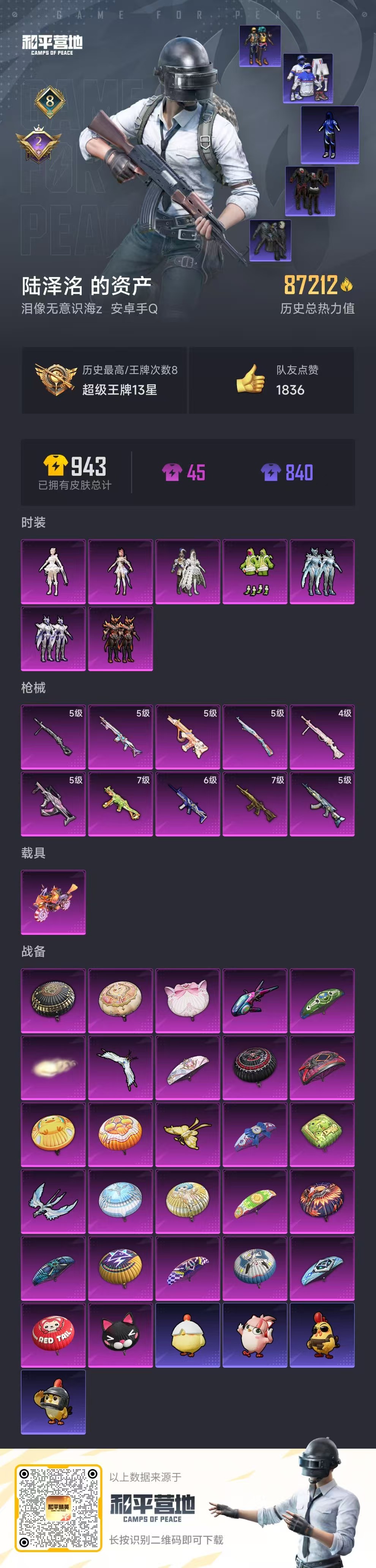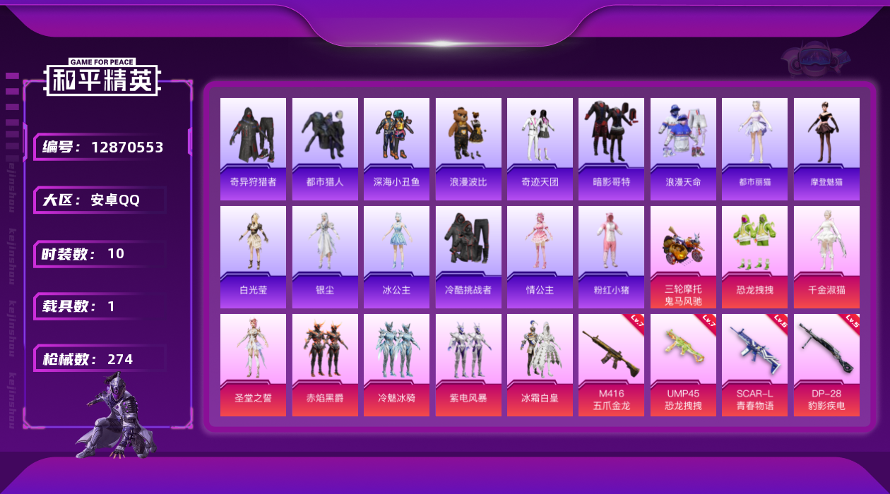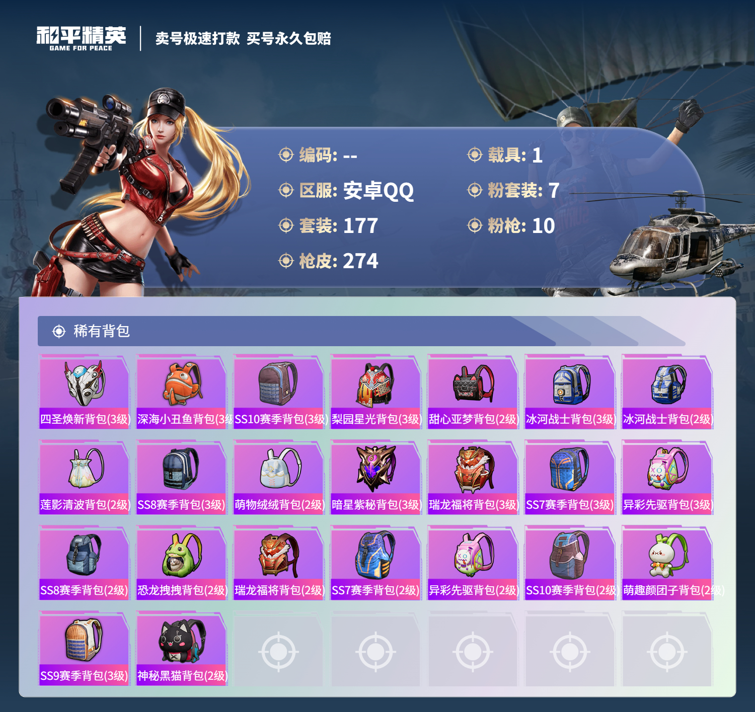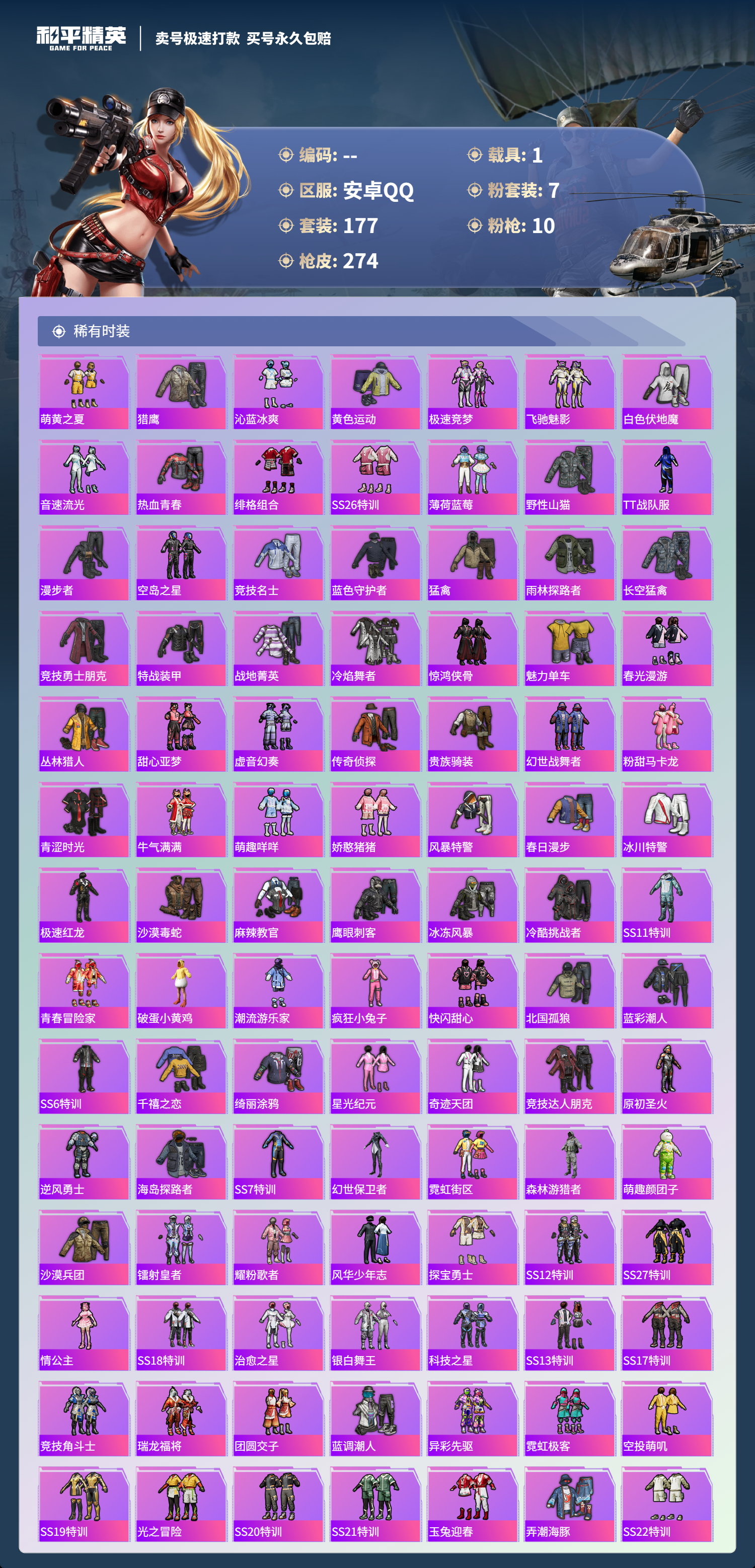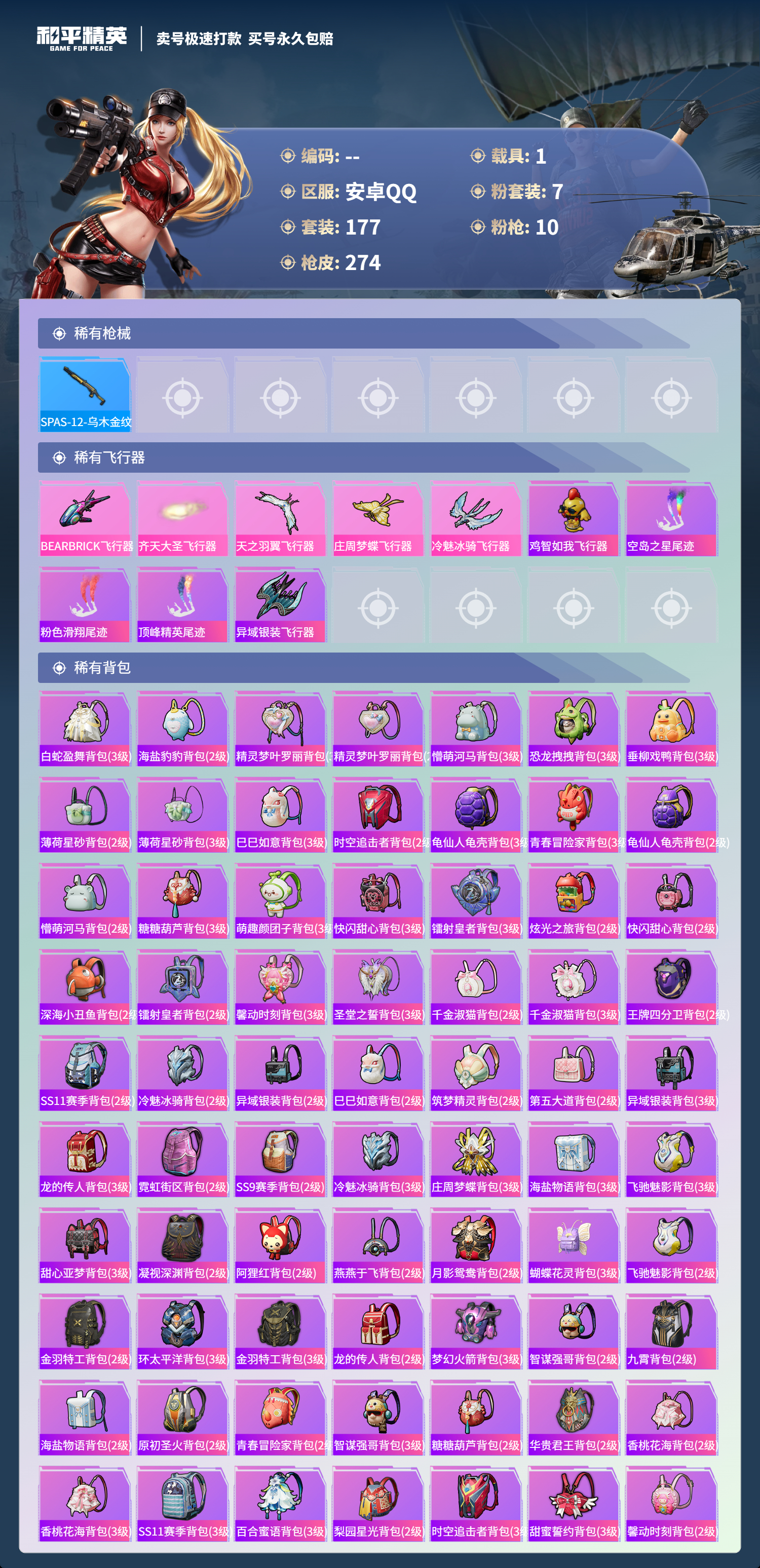 【11004494】【不可二次】【安卓QQ】龟仙人 MK14-精灵梦叶罗丽 恐龙拽拽 M416-五爪金龙 漫步者 粉甜马卡龙 都市猎人 极速红龙 UMP45-恐龙拽拽 庄周梦蝶飞行器 赤焰黑爵 M416-仓鼠灰灰 深海小丑鱼 浪漫波比 瑞龙福将 AWM-激战未来 M416-黄金龙骨 浪漫天命 AWM-黄金龙骨 团圆交子 紫电风暴 M762-激战未来 奇异狩猎者 M762-瑞龙福将 齐天大圣飞行器
