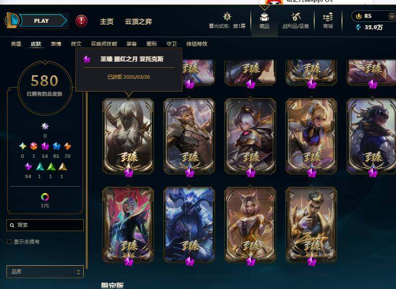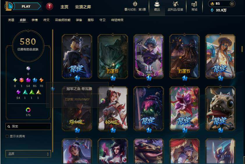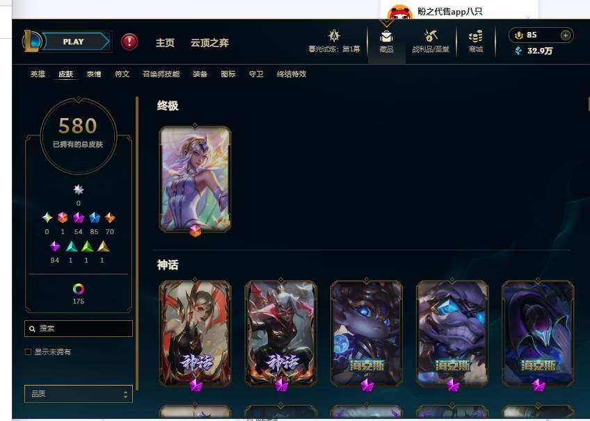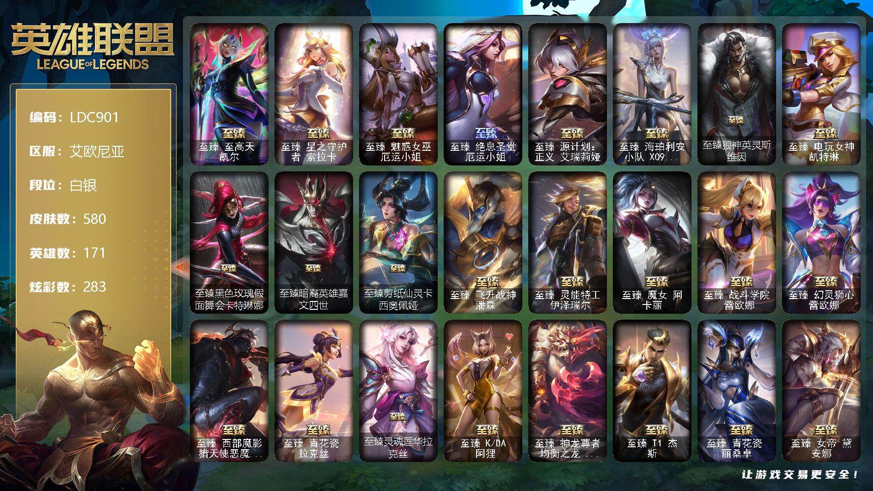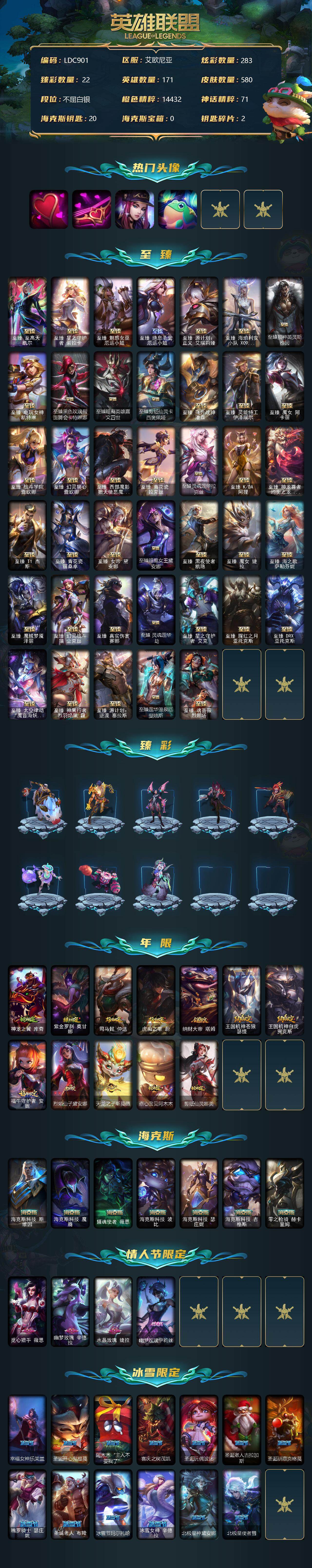 【11007485】【LDC901】171英雄/580皮肤/1终极/54神话/85限定/22臻彩/283炫彩/70传说/94史诗/白银/爱意绵绵/爱情之歌/KDA阿卡丽头像/拓蛙/至臻至高天凯尔/至臻星之守护者索拉卡/至臻魅惑女巫厄运小姐/至臻绝息圣堂厄运小姐/至臻源计划:正义艾瑞莉娅/至臻海珀利安小队X09星环灵风迦娜/至臻狼神英灵斯维因/至臻电玩女神凯特琳/至臻黑色玫瑰假面舞会卡特琳娜/至臻