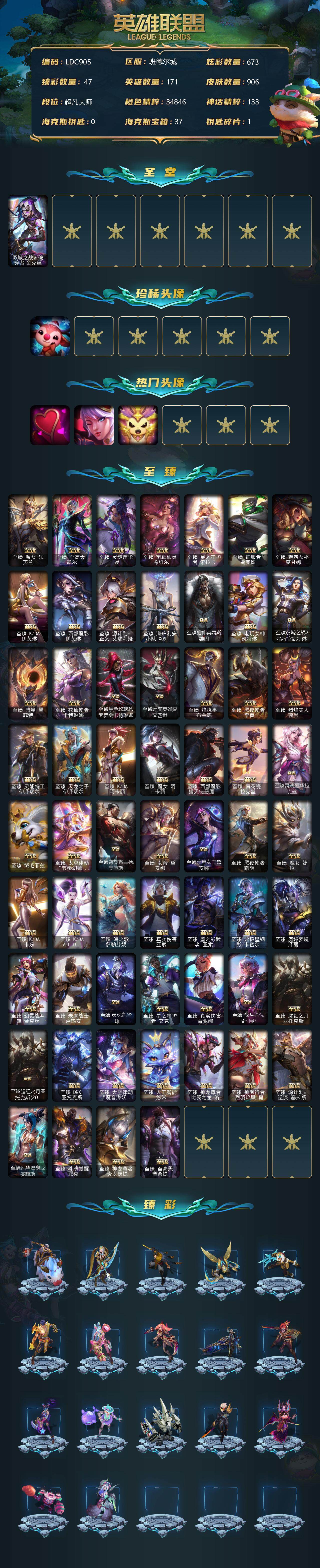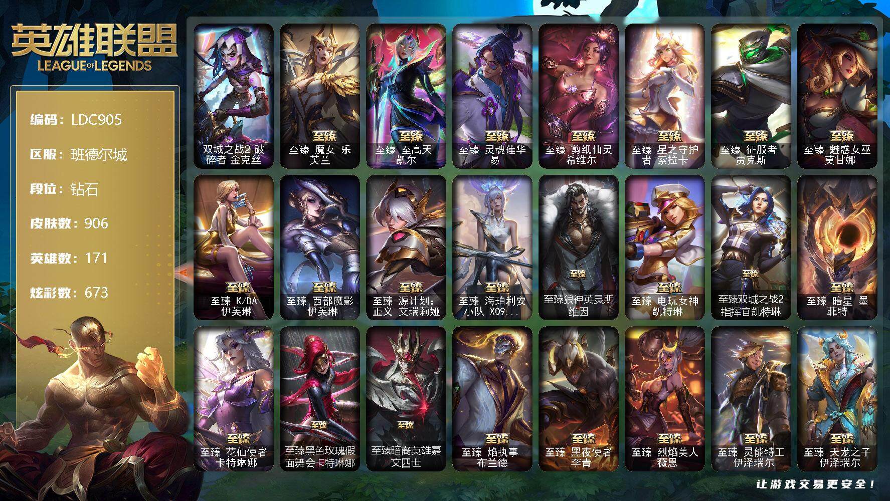 【11007490】【LDC905】171英雄/906皮肤/4终极/84神话/143限定/47臻彩/673炫彩/94传说/153史诗/钻石/双城之战2破碎者金克丝/至爱的鹿/爱意绵绵/觅心之翼奎因/星守索拉卡/至臻魔女乐芙兰/至臻至高天凯尔/至臻灵魂莲华易/至臻剪纸仙灵希维尔/至臻星之守护者索拉卡/至臻征服者贾克斯/至臻魅惑女巫莫甘娜/至臻K/DA伊芙琳/至臻西部魔影伊芙琳/至臻源计划:正义艾瑞