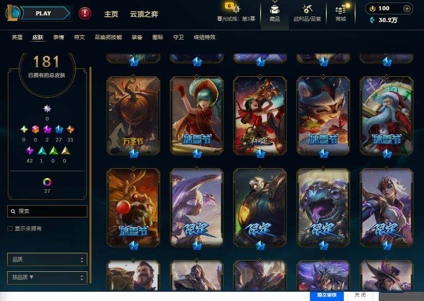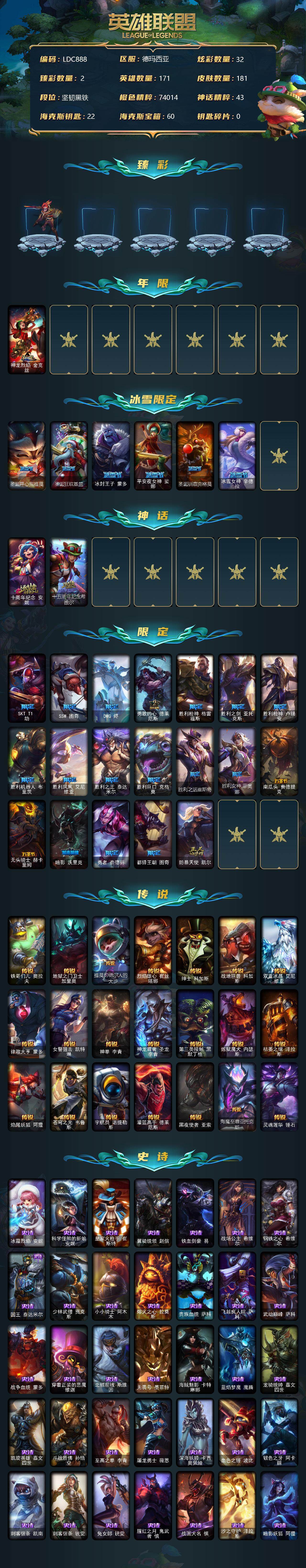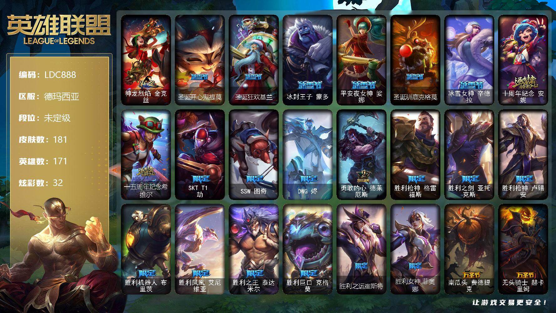 【11007533】【LDC888】171英雄/181皮肤/2神话/27限定/2臻彩/32炫彩/21传说/42史诗/未定级/黎明使者锐雯黑夜使者/魔女阿卡丽虚荣/神龙烈焰金克丝/圣诞开心鬼提莫/圣诞狂欢基兰/冰封王子蒙多/平安夜女神娑娜/圣诞驯鹿克格莫/冰雪女神辛德拉/十周年纪念安妮/十五周年纪念希维尔/SKTT1劫/SSW图奇/DWG烬/勇敢的心德莱厄斯/胜利枪神格雷福斯/胜利之剑亚托克斯/胜