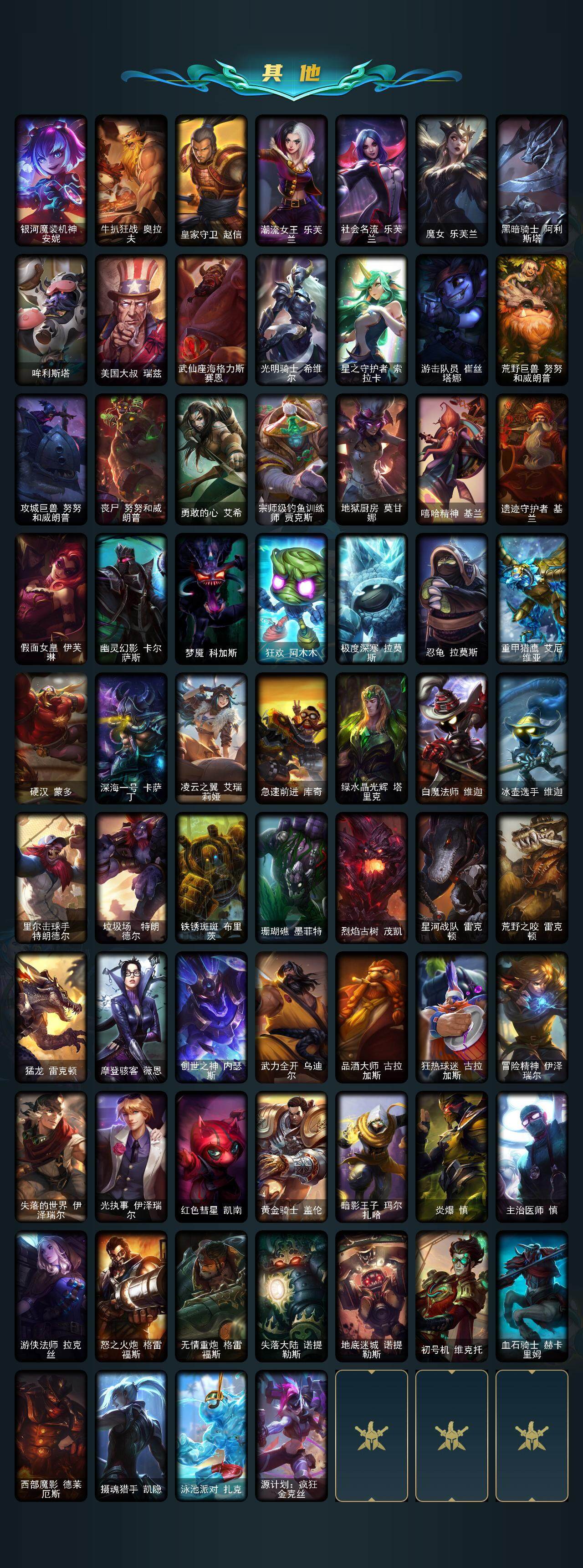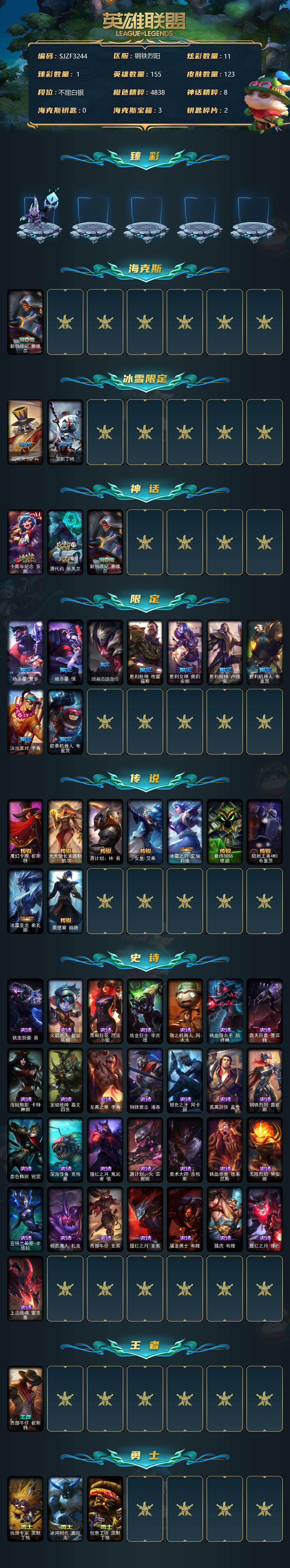 【11008035】【SJZF3244】155英雄/123皮肤/3神话/11限定/1臻彩/11炫彩/9传说/29史诗/白银/最终BOSS维迦里大魔王/新创战纪希维尔/胡桃夹子萨科/雪默丁格/十周年纪念安妮/源代码乐芙兰/暗杀星蒙多/暗杀星慎/暗裔英雄盖伦/胜利枪神格雷福斯/胜利女神奥莉安娜/胜利枪神卢锡安/胜利机器人布里茨/泳池派对李青/防暴机器人布里茨/魔幻卡牌崔斯特/大天使长米迦勒凯尔/源计