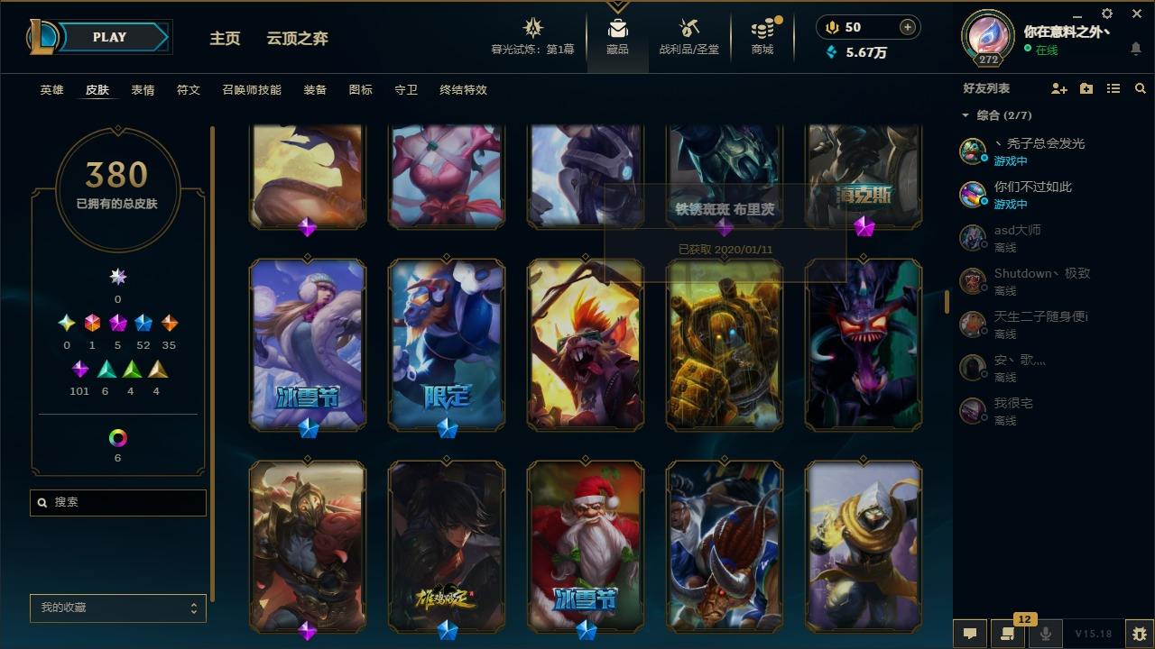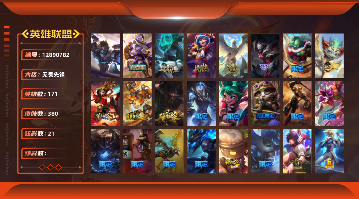 【11008671】[12890782]1终极 5神话 52限定 35传说 101史诗 380皮肤 21炫彩 171英雄 可二次 可修改实名 【海克斯】:海克斯 崔丝塔娜【限定】:创星之灵 璐璐【情人节限定】:觅心萝莉 金克丝【赛季限定皮】:胜利之运 崔斯特【冠军限定系列】:S1FNC 迦娜,S2 暗杀星 慎,S3 SKT T1 贾克斯,S4 SSW 图奇,S4 SSW 炼金,S5 SKT T1