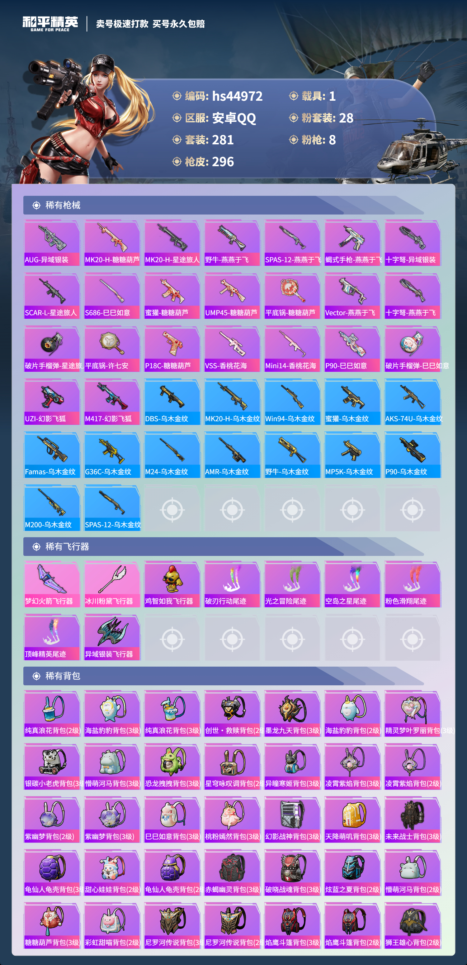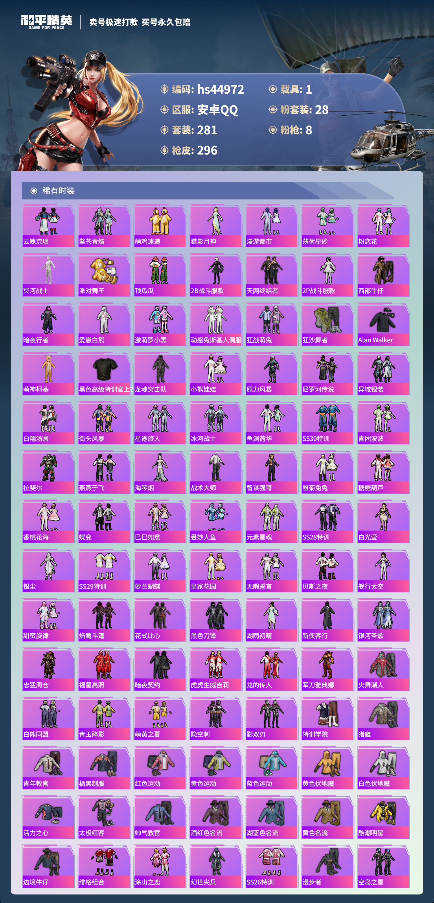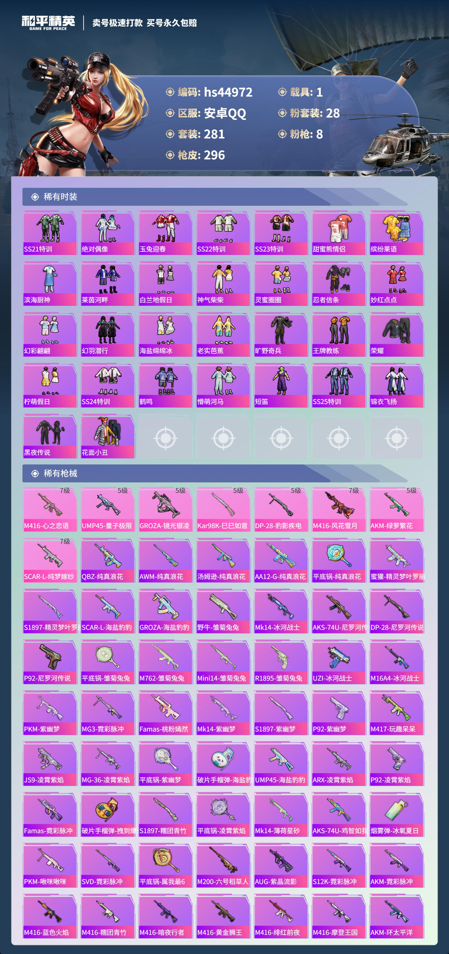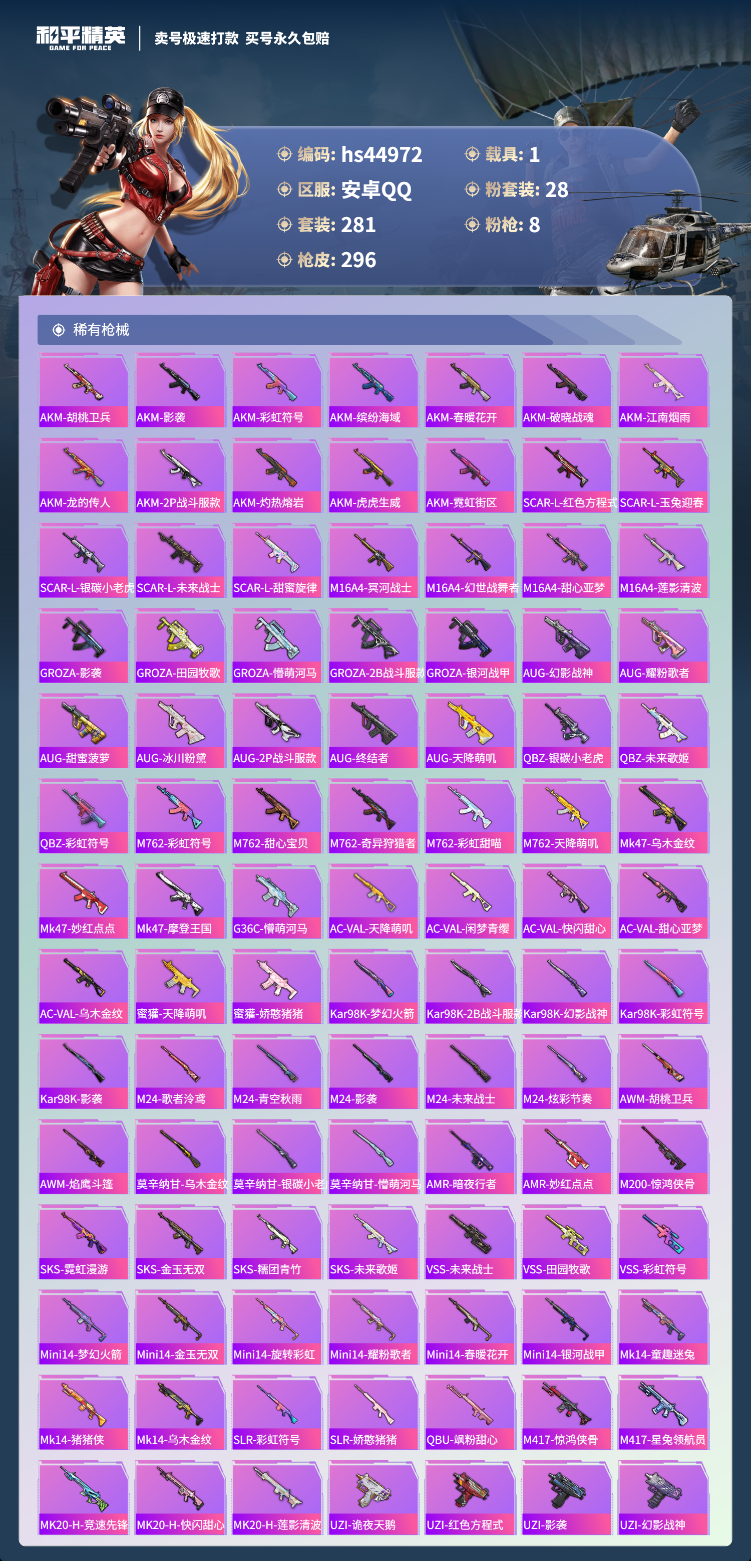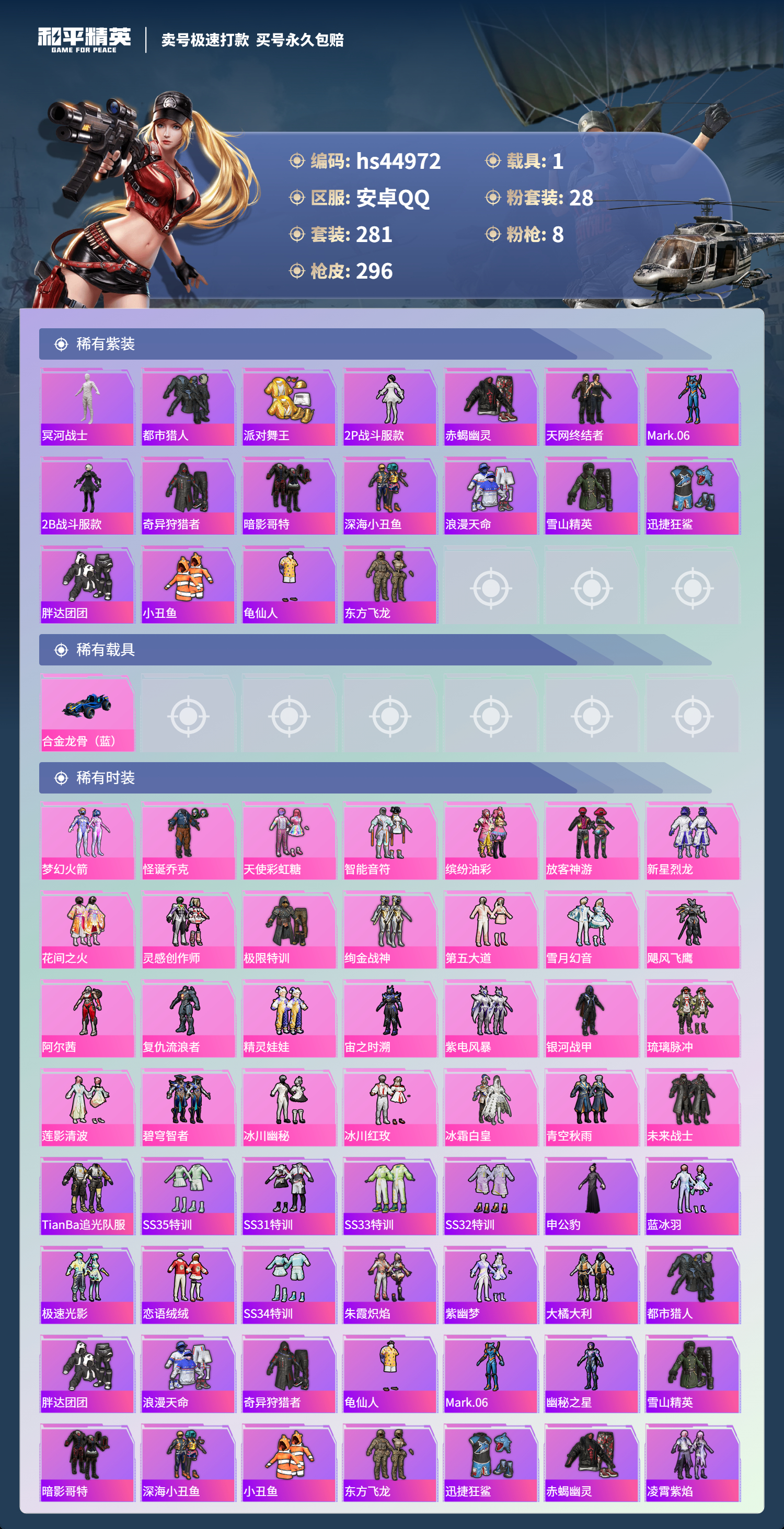 【11017887】【可二次】【安卓QQ】合金龙骨蓝色 龟仙人 AKM-绿萝繁花 水银刺客 漫步者 花间之火 都市猎人 银河战甲 忍者信条 M762-奇异狩猎者 UMP45-量子极限 M416-心之恋语 缤纷油彩 深海小丑鱼 影双刃 智能音符 紫电风暴 飓风飞鹰 怪诞乔克 迅捷狂鲨 黑色刀锋 新侠客行 狂沙舞者 木乃伊 S686-奇异狩猎者 新星烈龙 东方飞龙 极限特训 西部牛仔 极速红龙 赤蝎