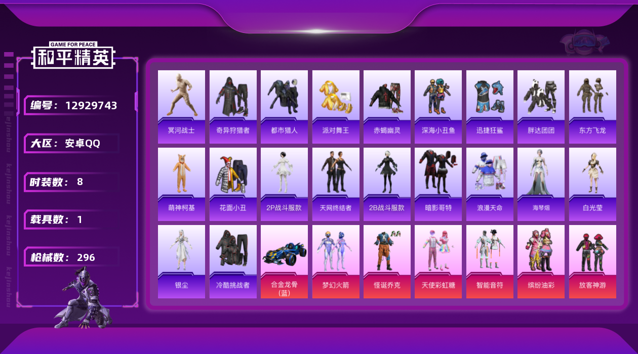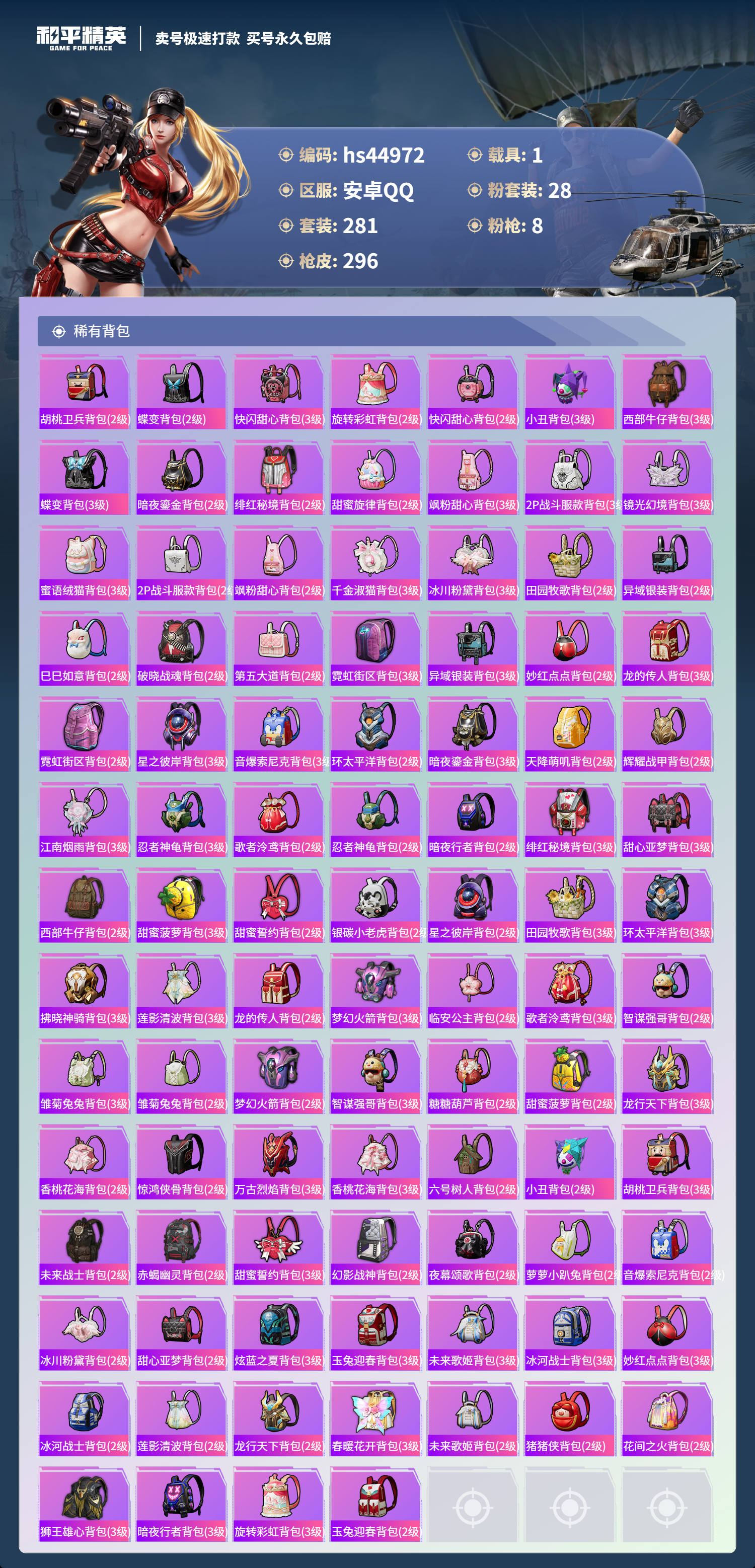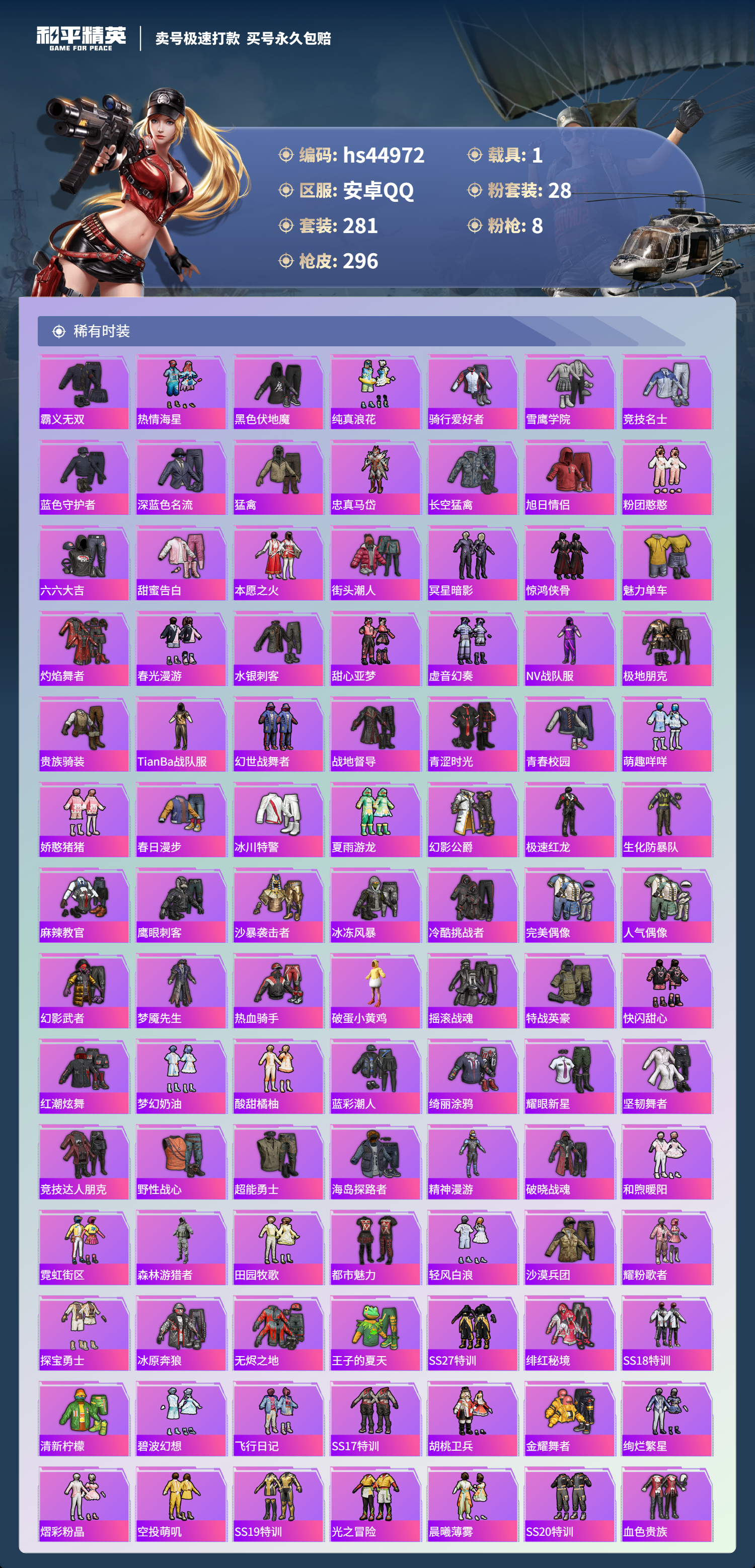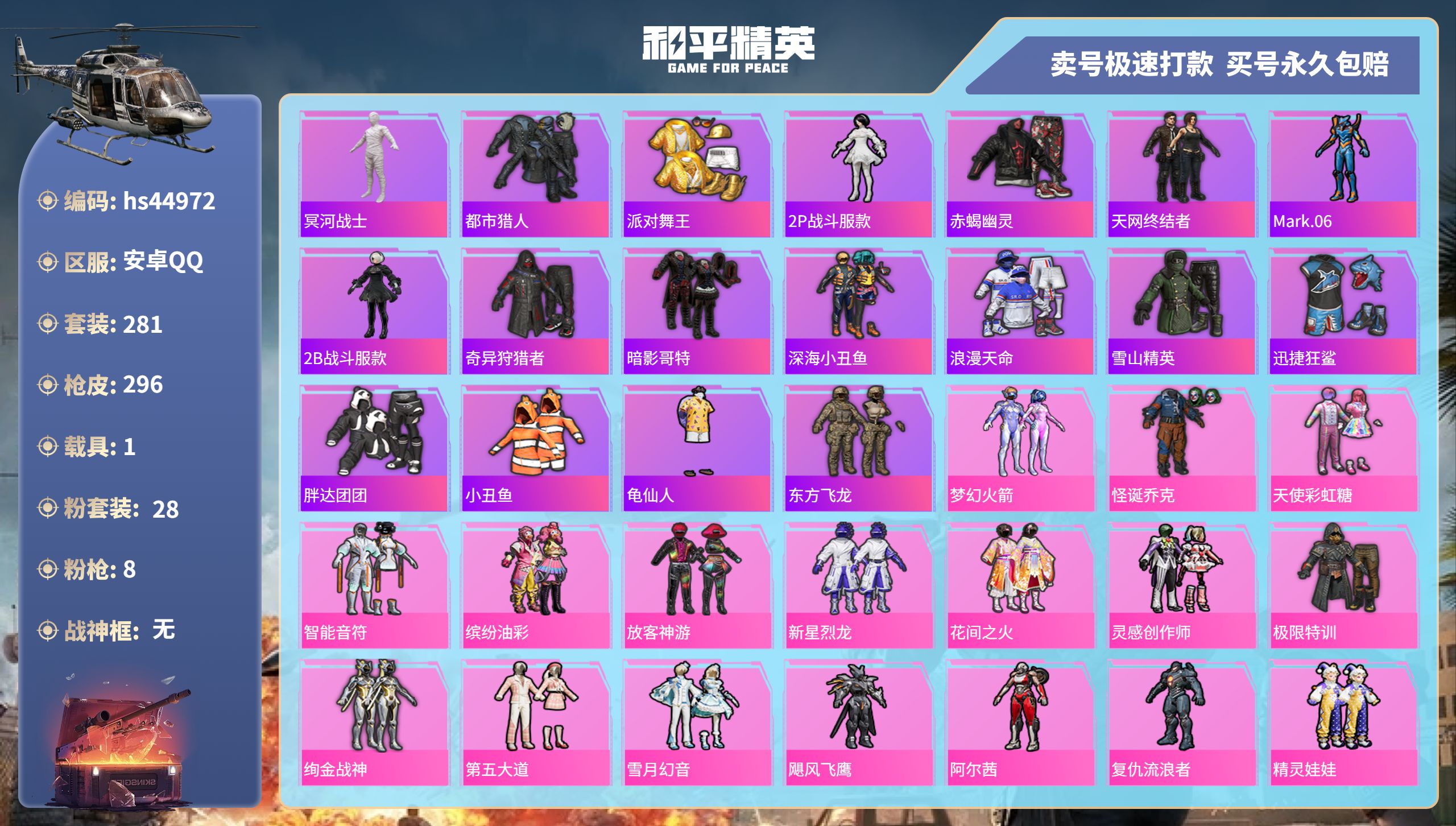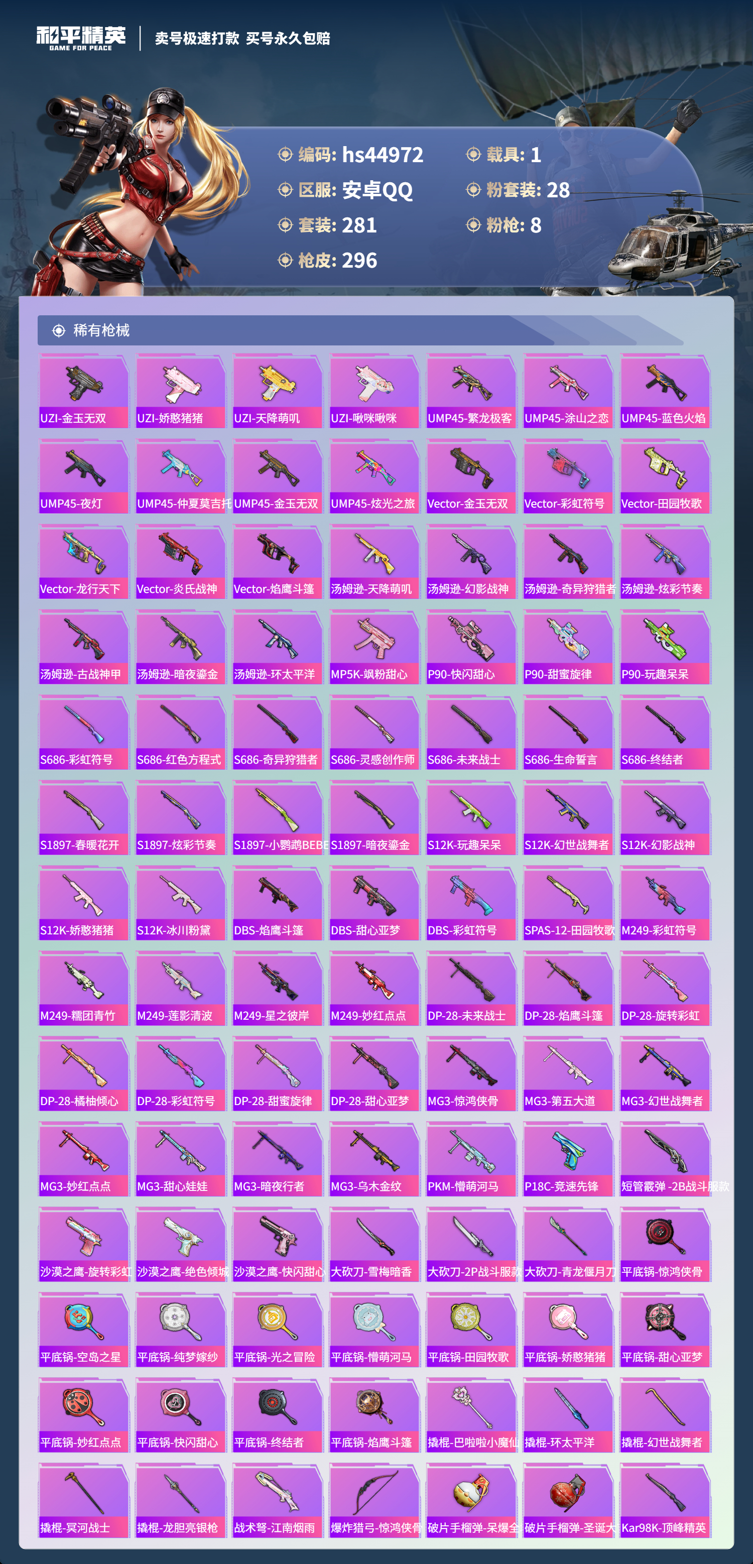 【11017887】【可二次】【安卓QQ】合金龙骨蓝色 龟仙人 AKM-绿萝繁花 水银刺客 漫步者 花间之火 都市猎人 银河战甲 忍者信条 M762-奇异狩猎者 UMP45-量子极限 M416-心之恋语 缤纷油彩 深海小丑鱼 影双刃 智能音符 紫电风暴 飓风飞鹰 怪诞乔克 迅捷狂鲨 黑色刀锋 新侠客行 狂沙舞者 木乃伊 S686-奇异狩猎者 新星烈龙 东方飞龙 极限特训 西部牛仔 极速红龙 赤蝎