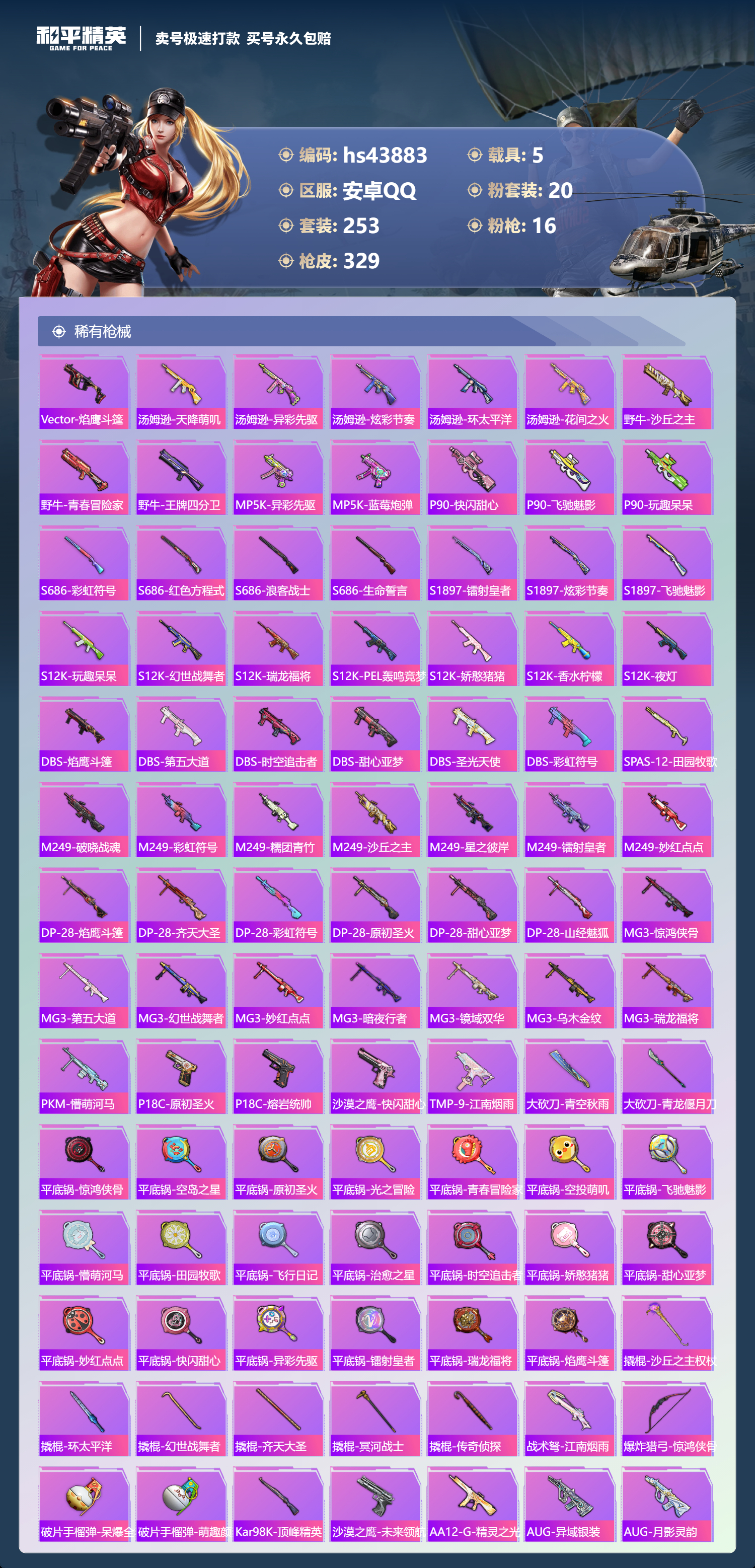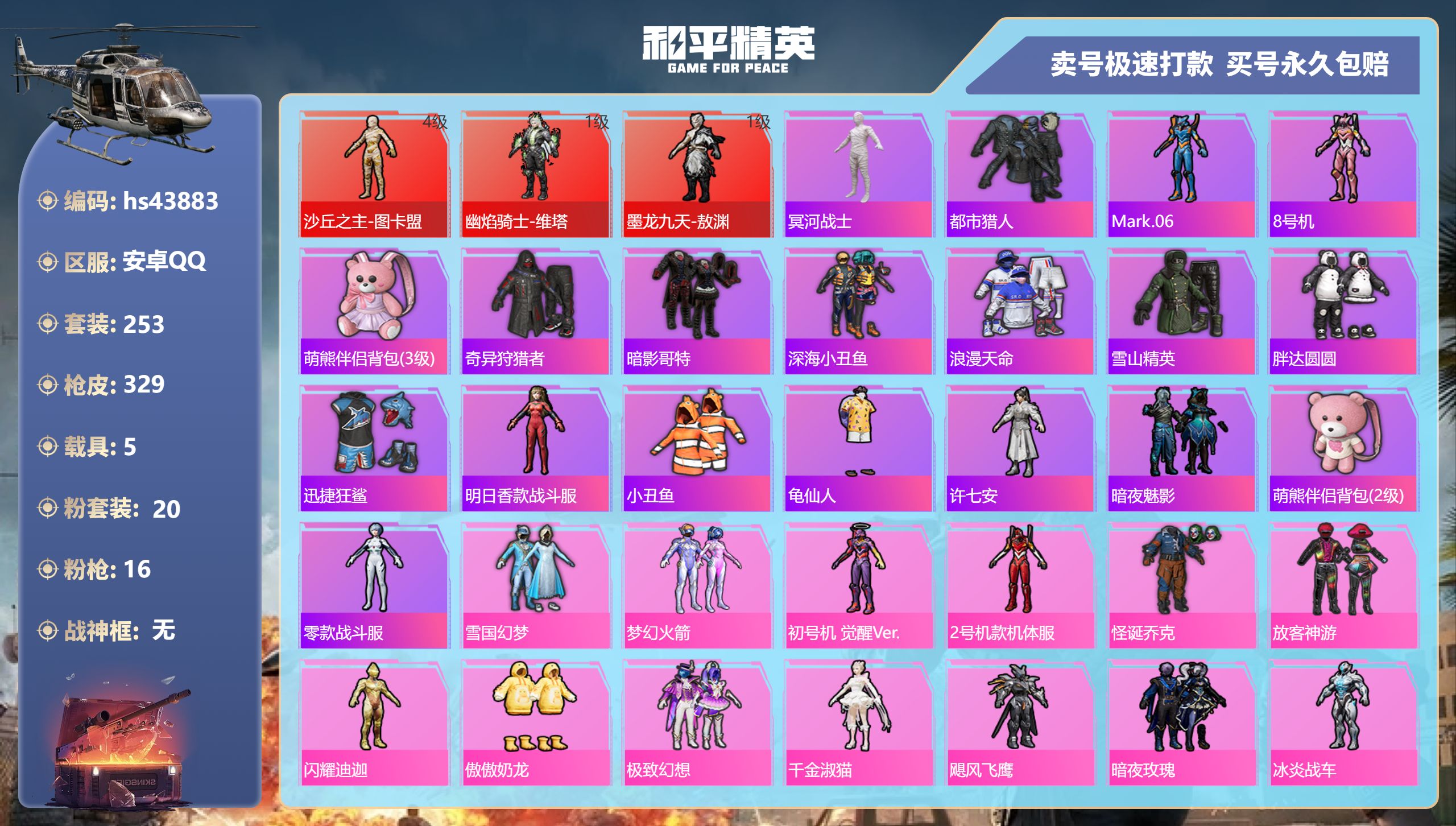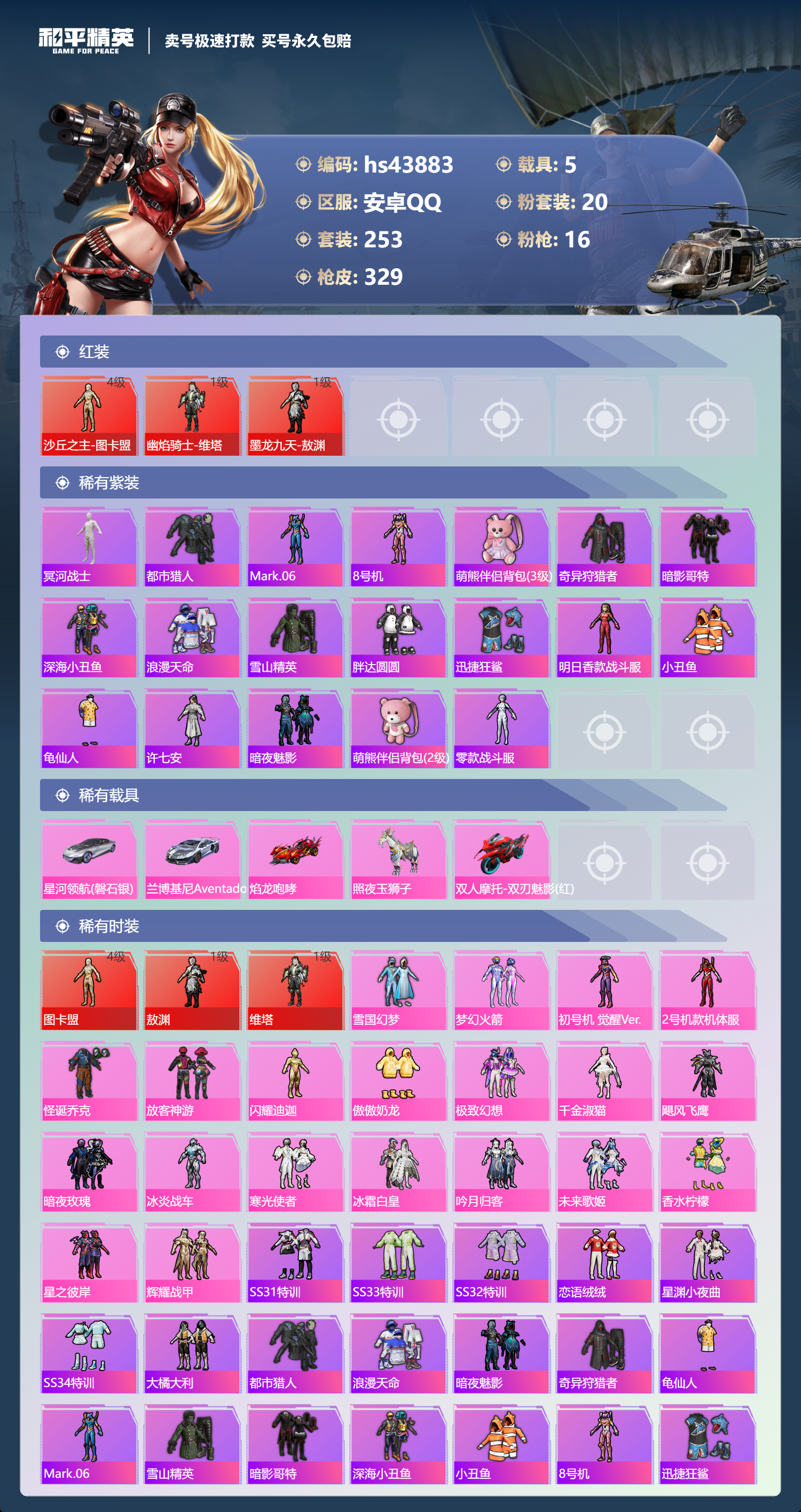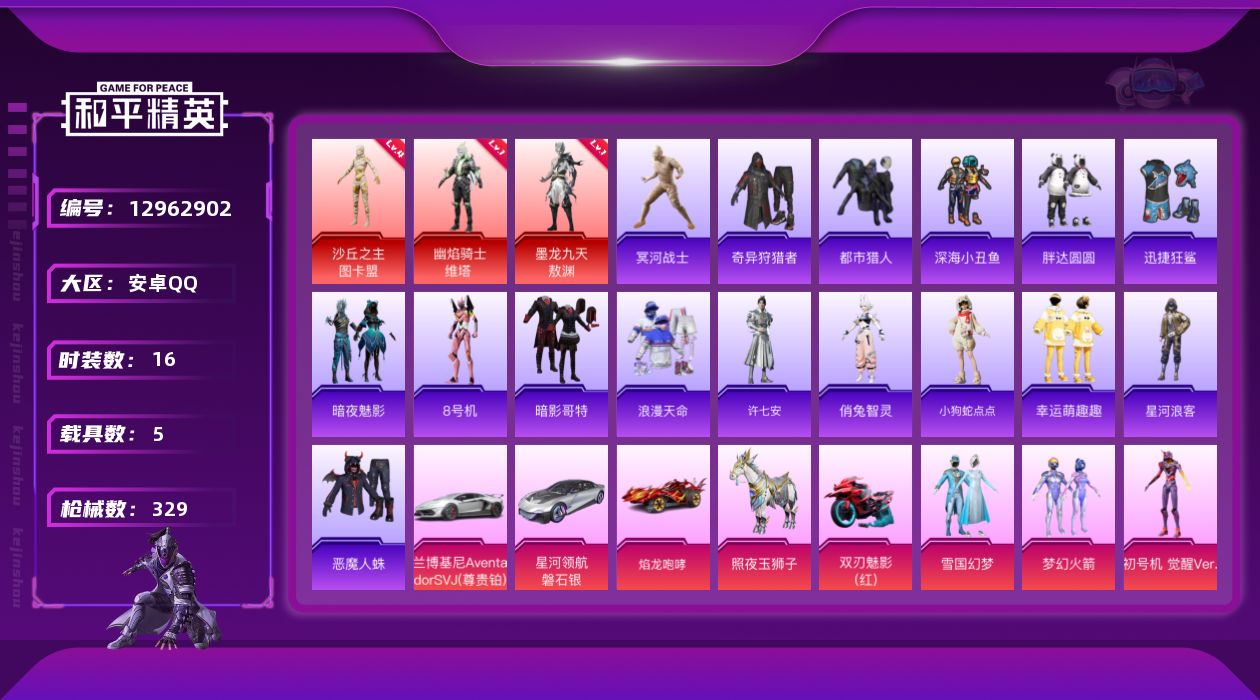 【11024336】【不可二次】【安卓QQ】龟仙人 焰龙咆哮 兰博SVJ尊享铂 漫步者 都市猎人 双刃魅影红色 AKM-白勺歌姬 UMP45-恐龙拽拽 豚鼠丹丹 M762-奇异狩猎者 沙丘之主-图卡盟 M416-至情至圣 星河领航(磐石银) M416-仓鼠灰灰 M416-心之恋语 深海小丑鱼 醒狮腾龙 MG3-梦幻舞会 飓风飞鹰 怪诞乔克 迅捷狂鲨 M762-瑞龙福将 Vector-环太平洋 极