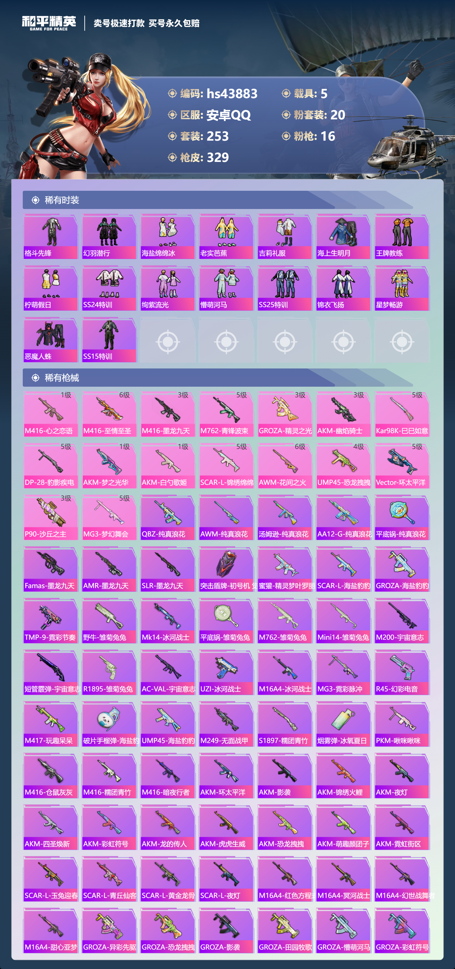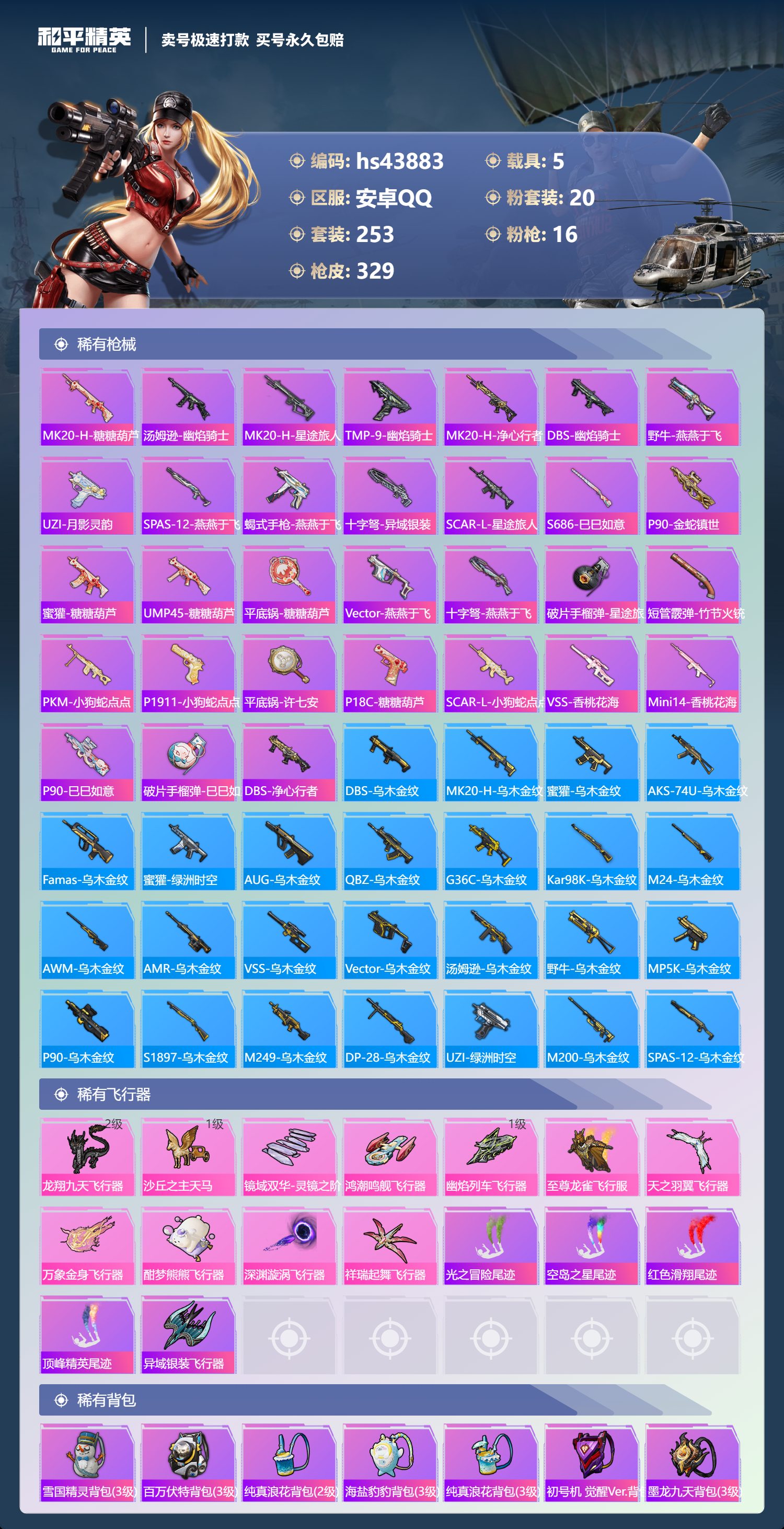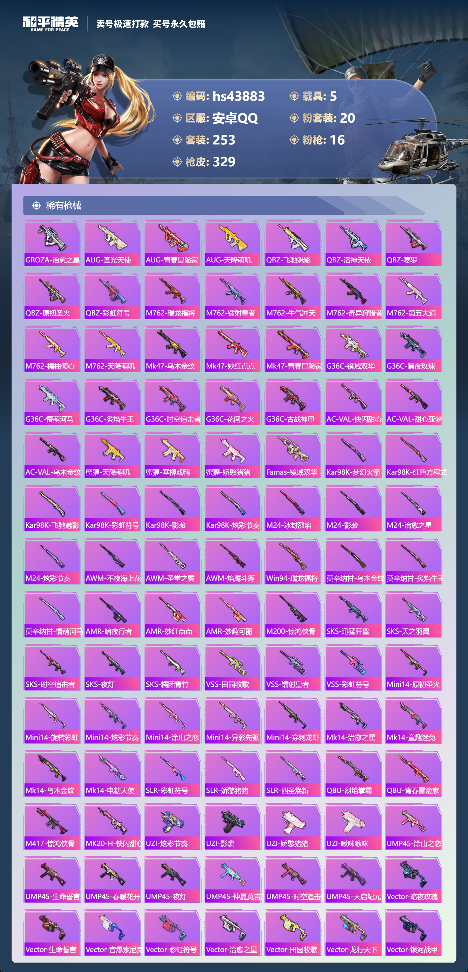 【11024336】【不可二次】【安卓QQ】龟仙人 焰龙咆哮 兰博SVJ尊享铂 漫步者 都市猎人 双刃魅影红色 AKM-白勺歌姬 UMP45-恐龙拽拽 豚鼠丹丹 M762-奇异狩猎者 沙丘之主-图卡盟 M416-至情至圣 星河领航(磐石银) M416-仓鼠灰灰 M416-心之恋语 深海小丑鱼 醒狮腾龙 MG3-梦幻舞会 飓风飞鹰 怪诞乔克 迅捷狂鲨 M762-瑞龙福将 Vector-环太平洋 极