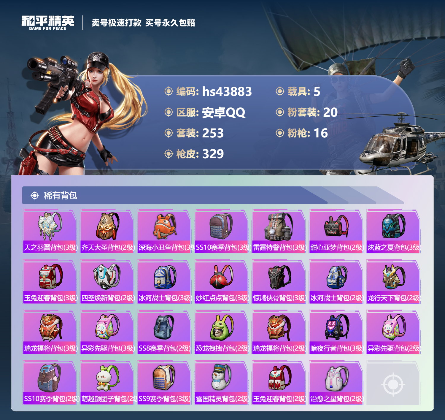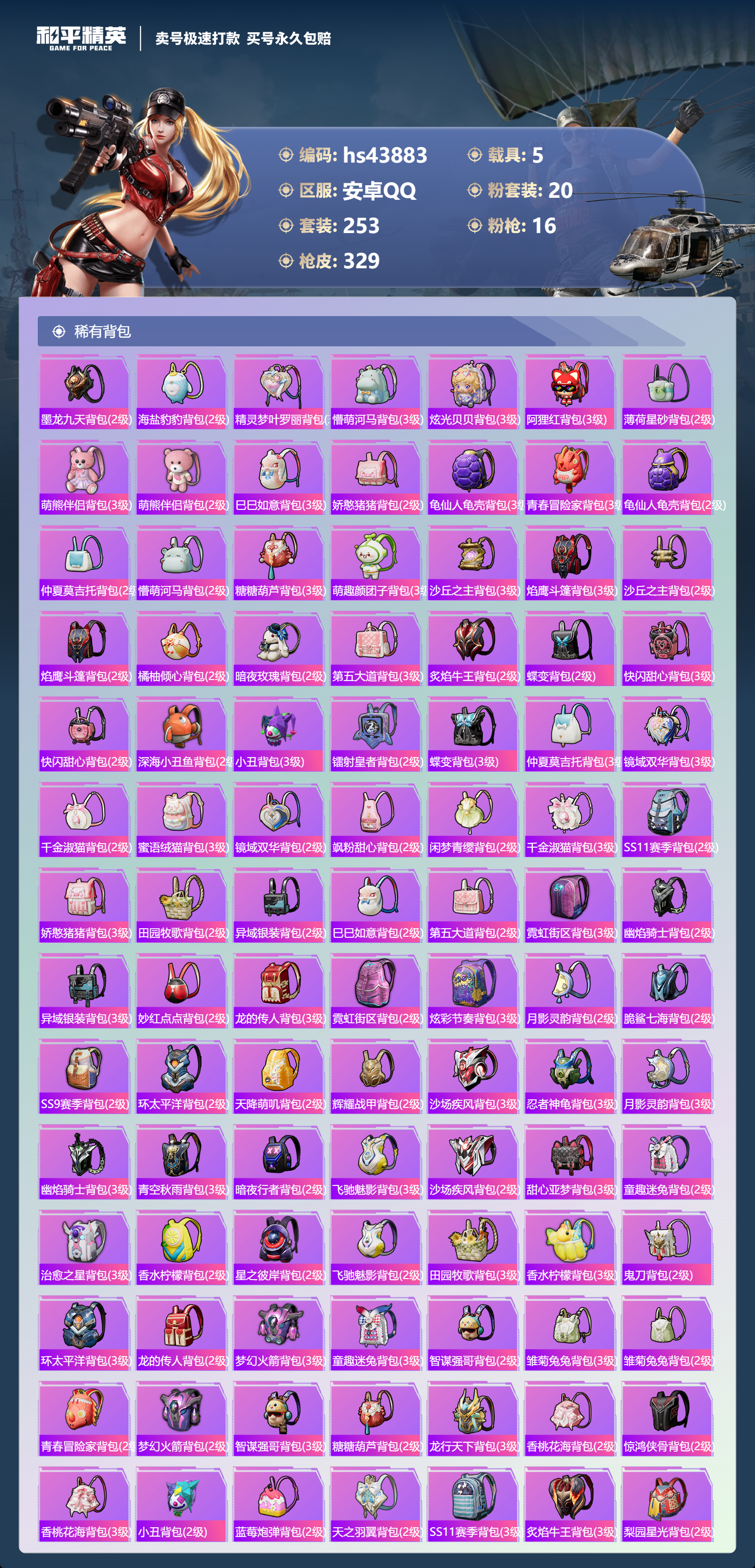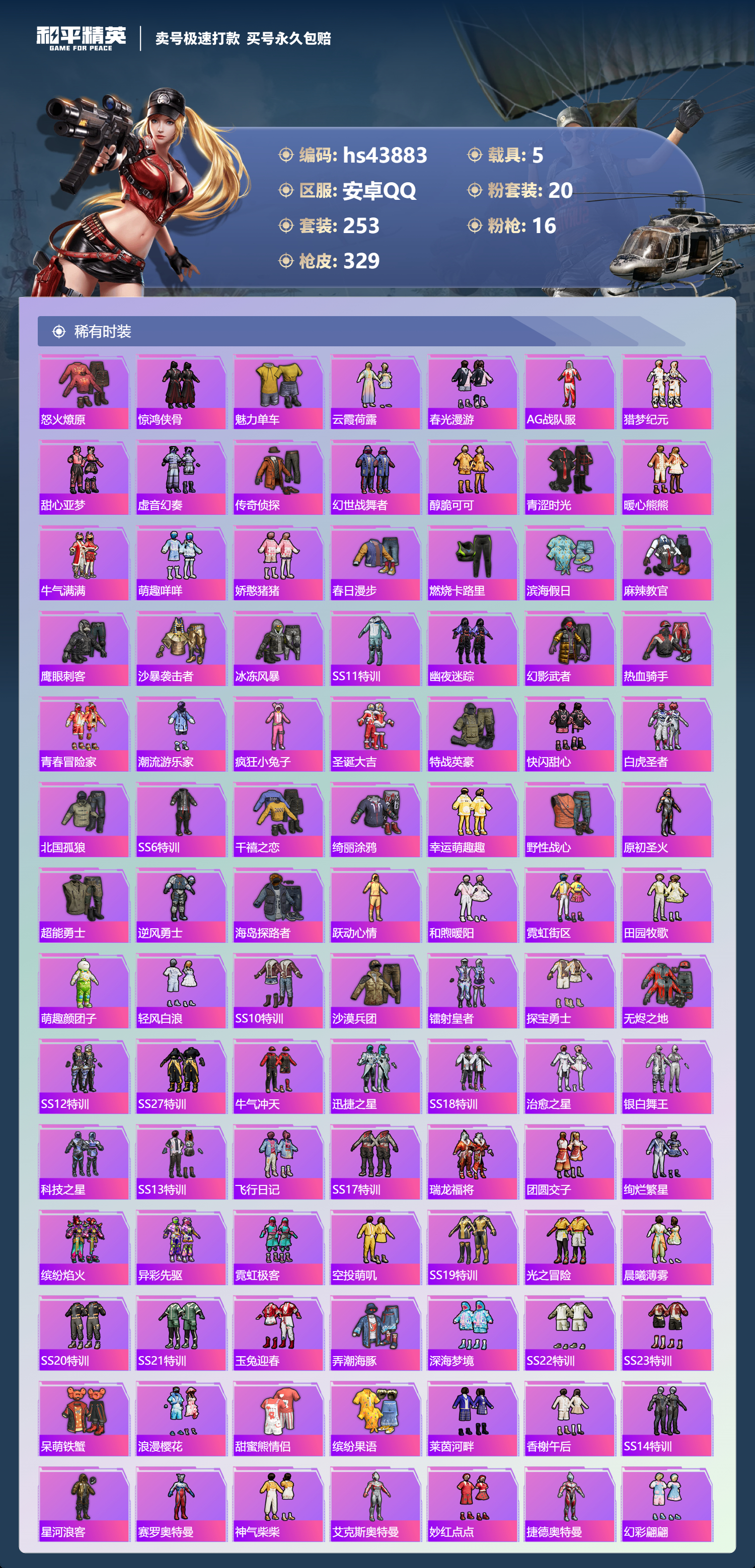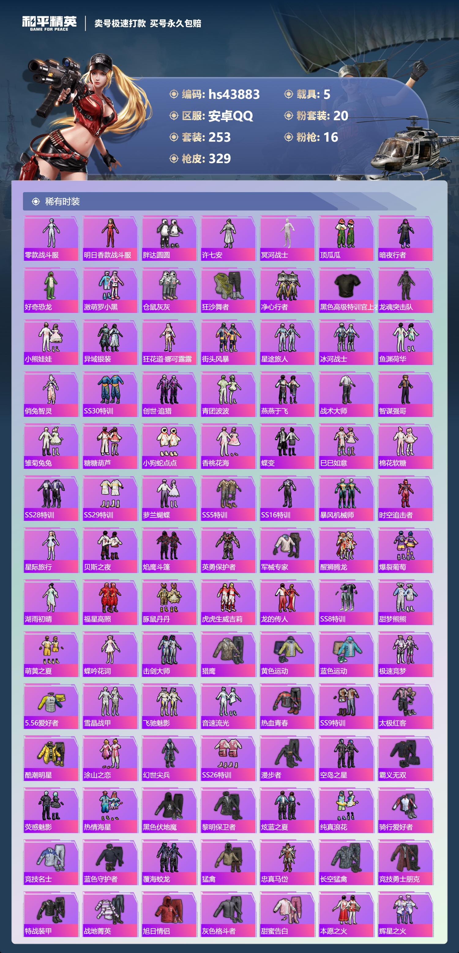 【11024336】【不可二次】【安卓QQ】龟仙人 焰龙咆哮 兰博SVJ尊享铂 漫步者 都市猎人 双刃魅影红色 AKM-白勺歌姬 UMP45-恐龙拽拽 豚鼠丹丹 M762-奇异狩猎者 沙丘之主-图卡盟 M416-至情至圣 星河领航(磐石银) M416-仓鼠灰灰 M416-心之恋语 深海小丑鱼 醒狮腾龙 MG3-梦幻舞会 飓风飞鹰 怪诞乔克 迅捷狂鲨 M762-瑞龙福将 Vector-环太平洋 极