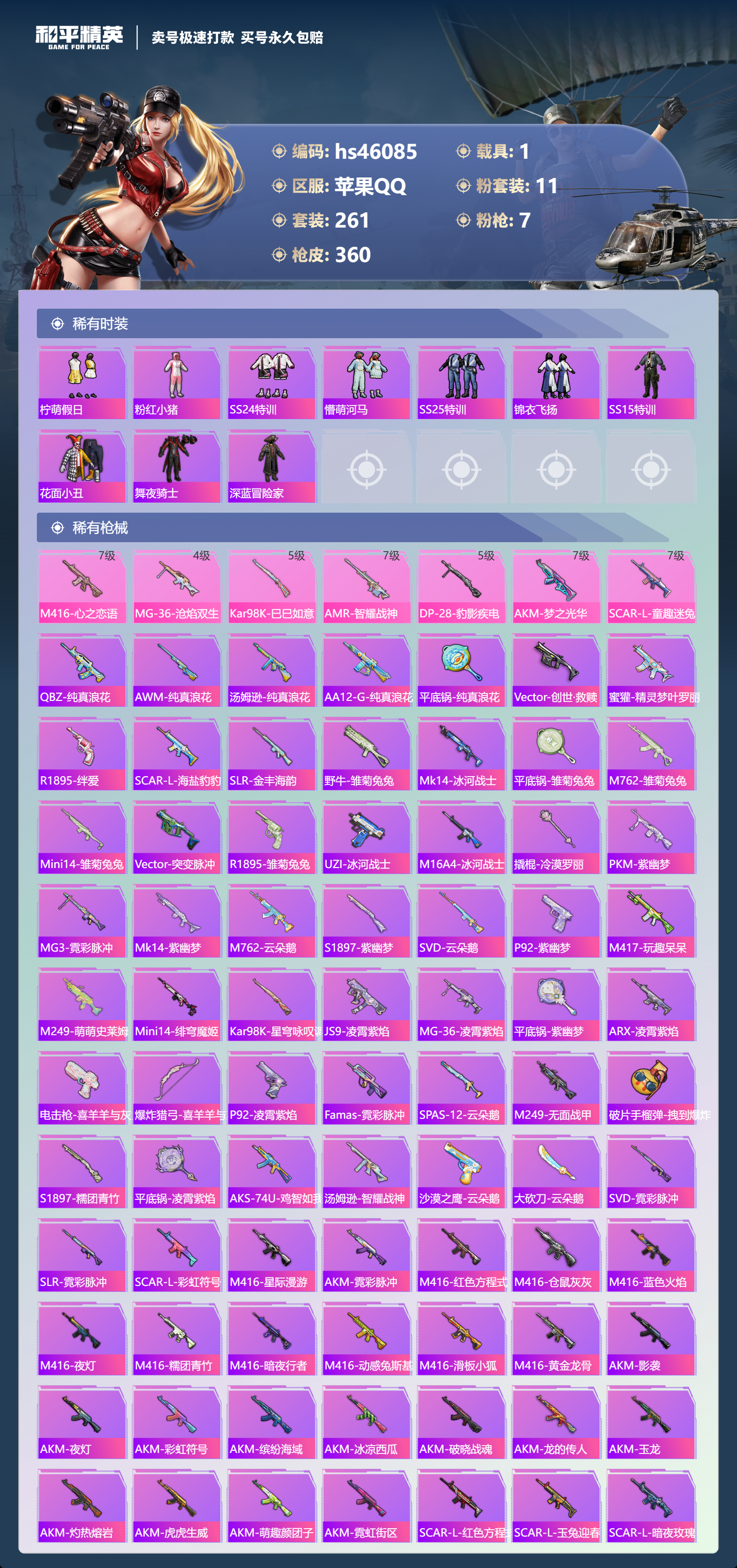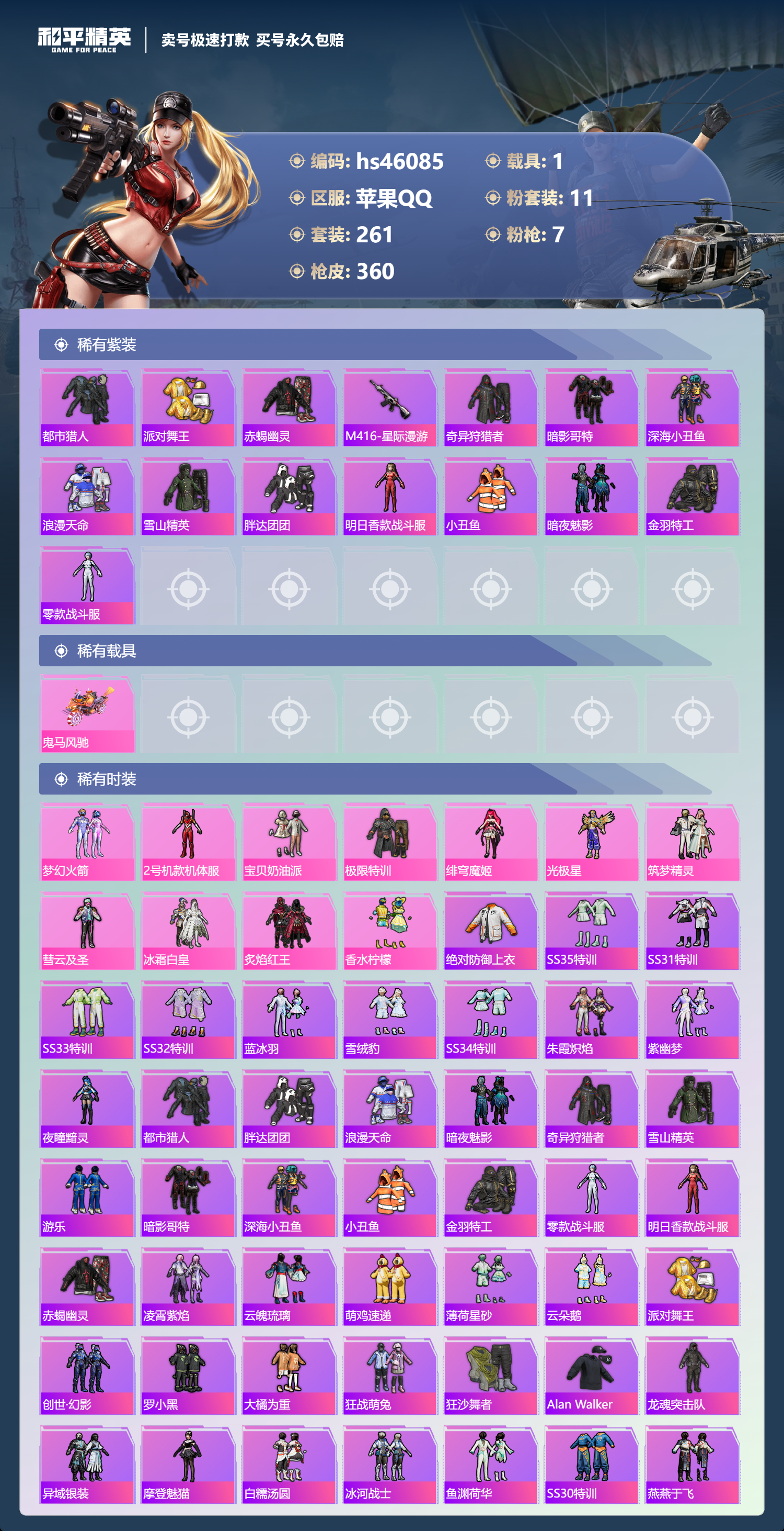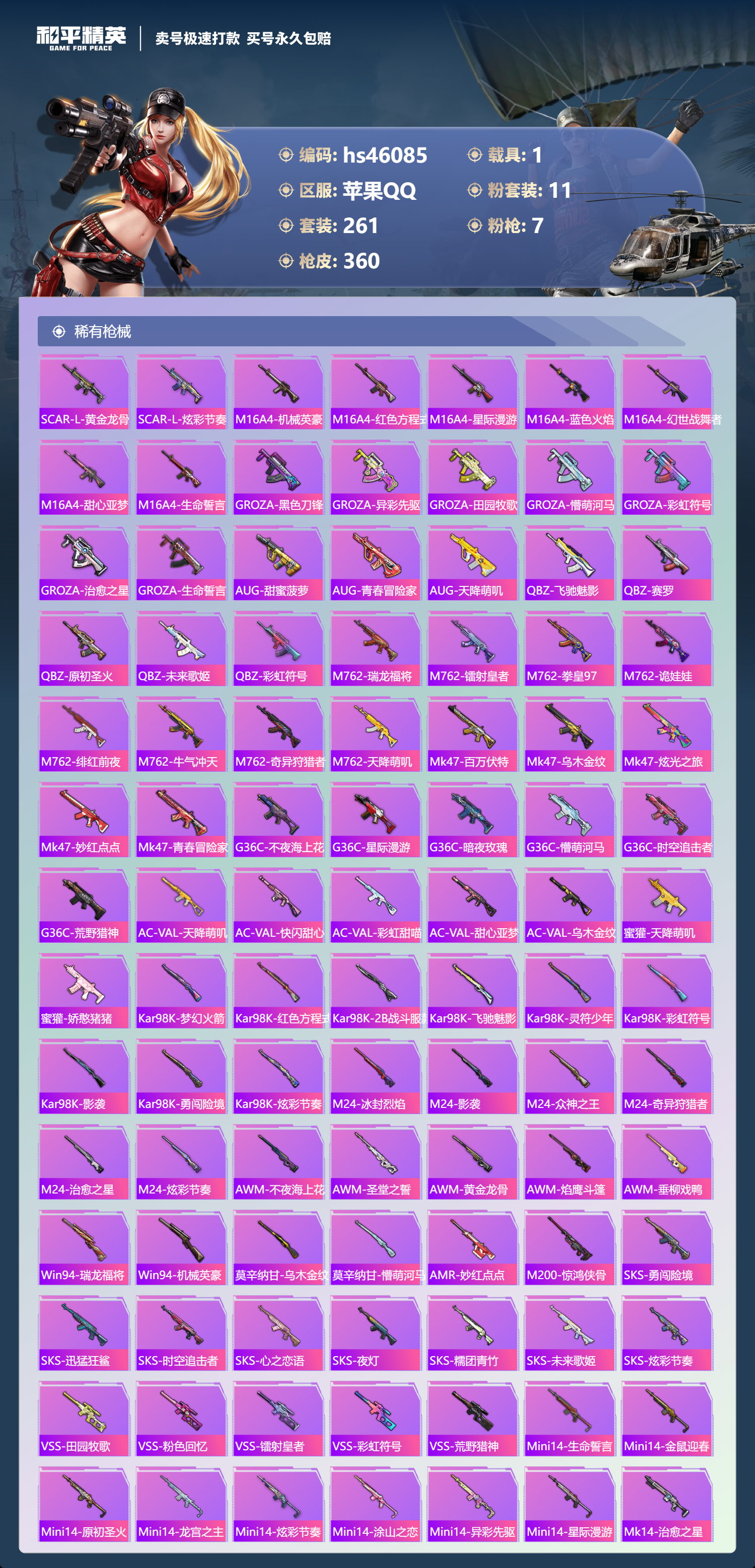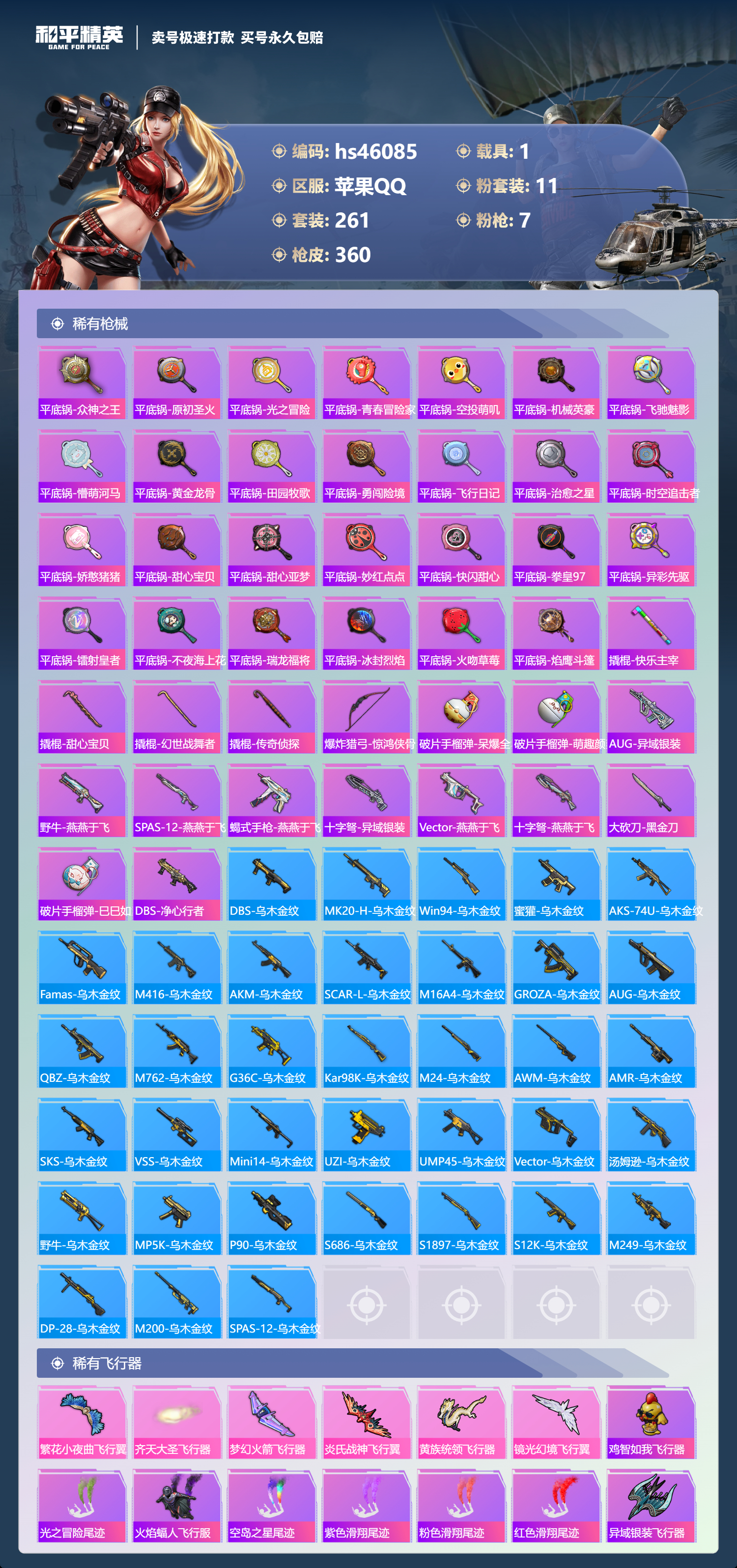 【11032268】【不可二次】【苹果QQ】水银刺客 大橘为重 M416-星际漫游 都市猎人 炎氏战神飞行翼 M762-奇异狩猎者 繁花小夜曲飞行翼 M416-仓鼠灰灰 M416-心之恋语 深海小丑鱼 SCAR-童趣迷兔 AWM-黄金龙骨 镜光幻境飞行翼 纯白誓言 SS1特训 M762-瑞龙福将 齐天大圣飞行器 新侠客行 狂沙舞者 金羽特工 香水柠檬 白月香洋装 AKM-梦之光华 彗云及圣 红螳
