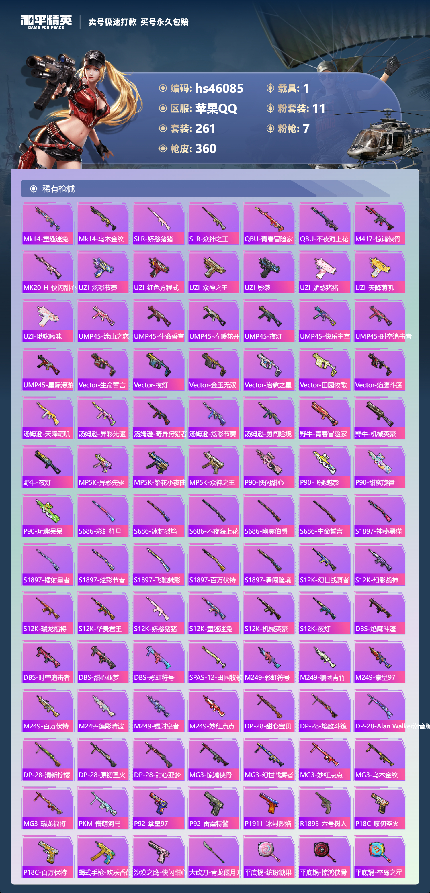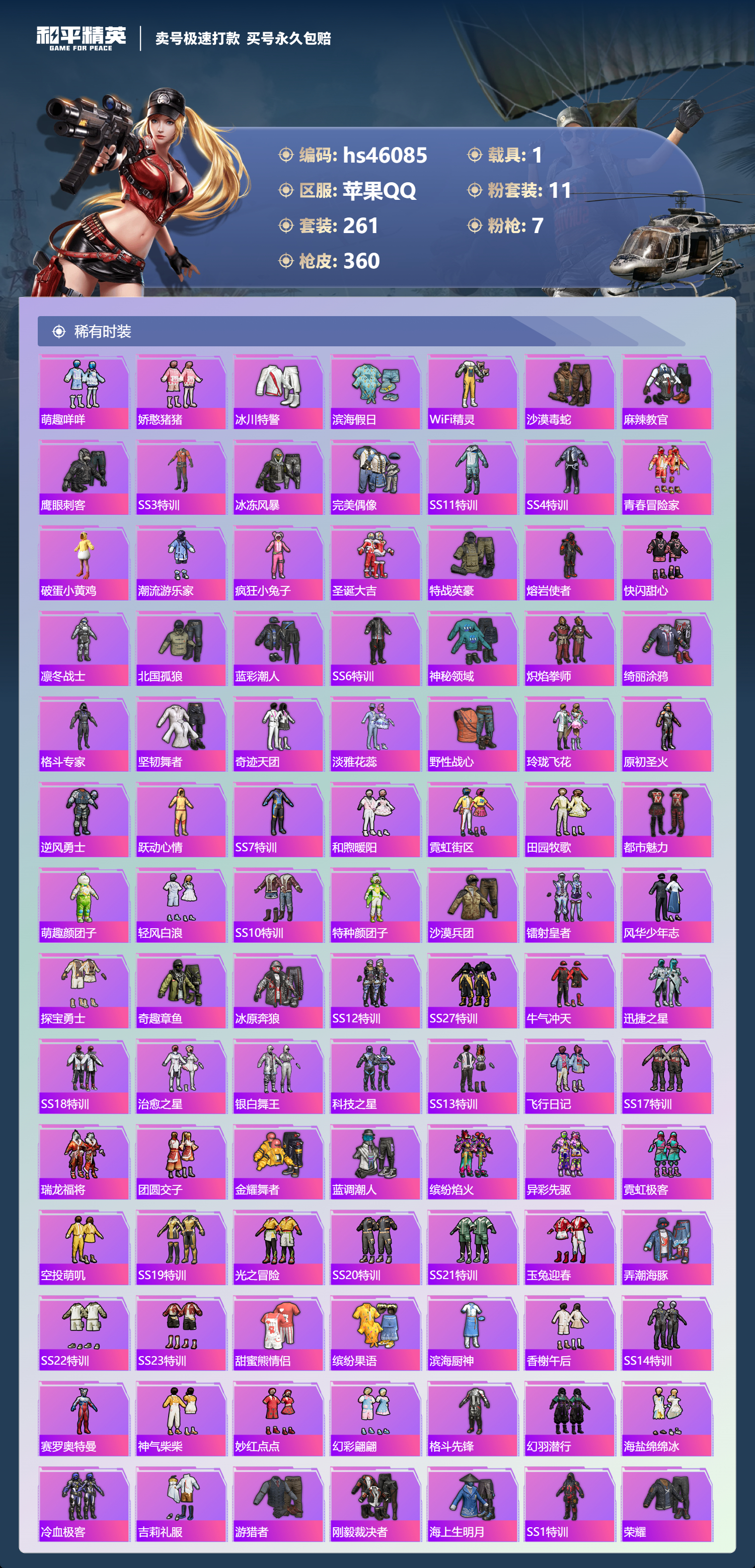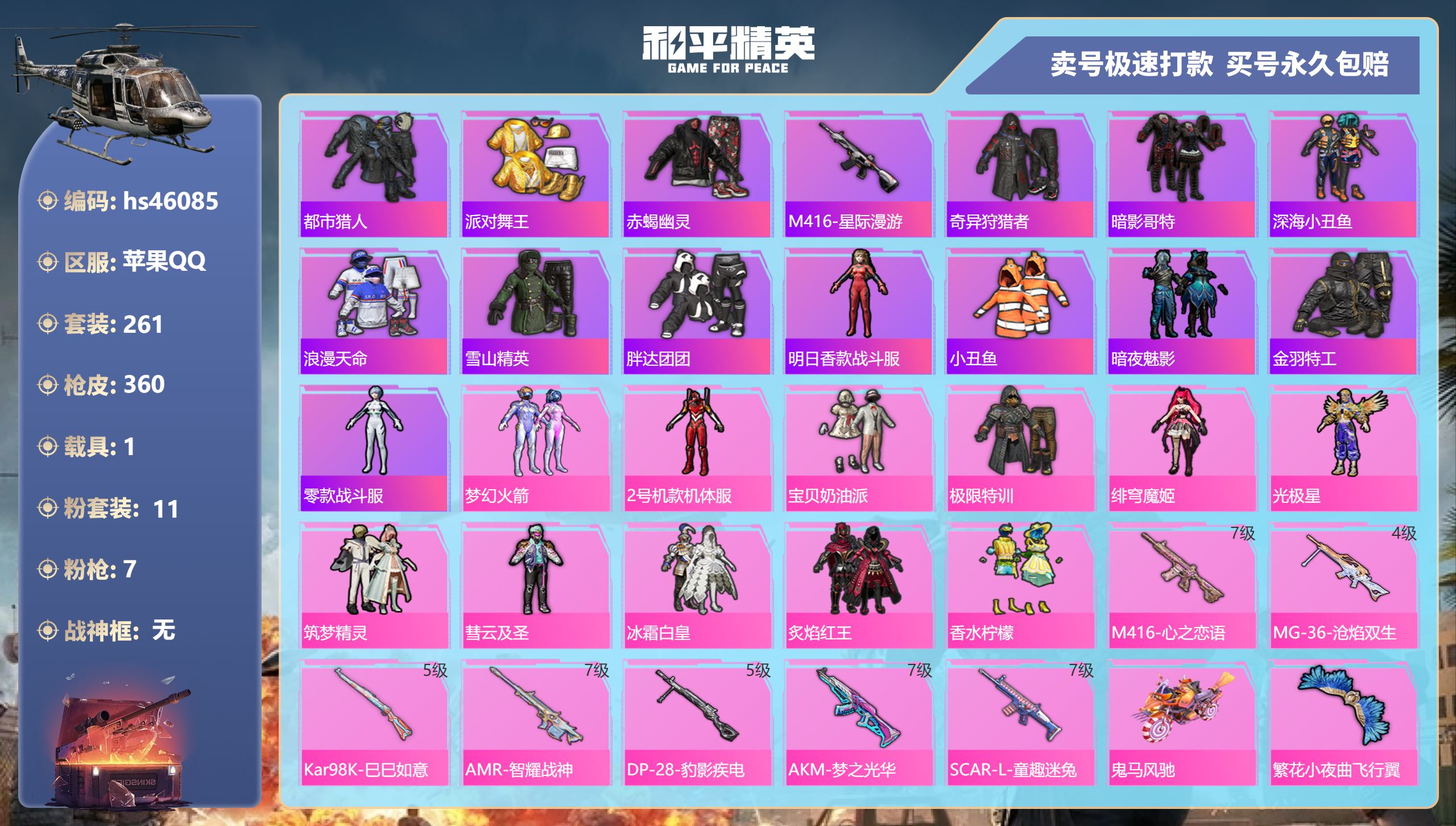 【11032268】【不可二次】【苹果QQ】水银刺客 大橘为重 M416-星际漫游 都市猎人 炎氏战神飞行翼 M762-奇异狩猎者 繁花小夜曲飞行翼 M416-仓鼠灰灰 M416-心之恋语 深海小丑鱼 SCAR-童趣迷兔 AWM-黄金龙骨 镜光幻境飞行翼 纯白誓言 SS1特训 M762-瑞龙福将 齐天大圣飞行器 新侠客行 狂沙舞者 金羽特工 香水柠檬 白月香洋装 AKM-梦之光华 彗云及圣 红螳