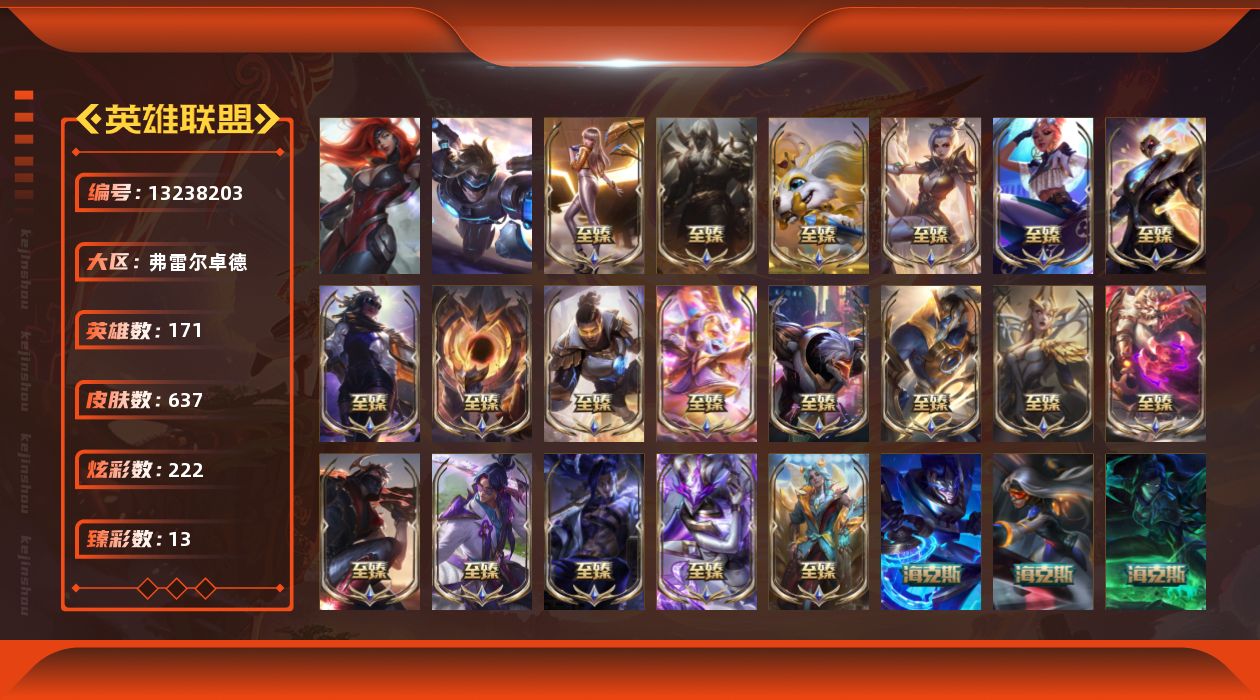 【11089368】[13238203]t27323【弗雷尔卓德】637皮肤 222炫彩 13臻彩 29神话/89限定/84传说/171英雄 账号等级:621 【重要头像】云顶古琴娑娜 爱情之歌 我麦是开的么 披萨鸡 此志无双羽饰骑士 【重要皮肤】天龙之子伊泽瑞尔至臻 斗魂觉醒萨科至臻 墨之影武者亚索至臻 灵魂莲华易至臻 西部魔影猎天使恶魔泰隆至臻 太空律动璐璐至臻 魔女乐芙兰至臻 未来战士卢锡
