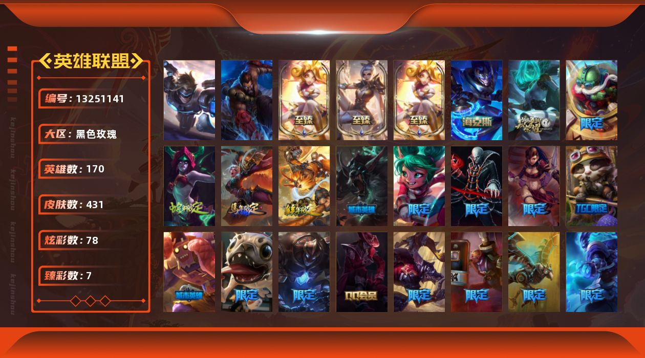 【11089449】[13251141]t23954【黑色玫瑰】431皮肤 78炫彩 7臻彩 5神话/68限定/46传说/170英雄 账号等级:296 【重要头像】电玩女神厄运小姐 电玩女神娑娜 披萨鸡 战斗学院伊泽瑞尔 【重要皮肤】星之守护者妮蔻至臻 玉剑传说武剑仙至臻 海克斯科技嘉文四世 安妮梦游仙境 电玩女神厄运小姐 电玩勇者锐雯 银龙裁决泰隆 替父从军花木兰 碧玉之牙卡西奥佩娅 美猴王孙