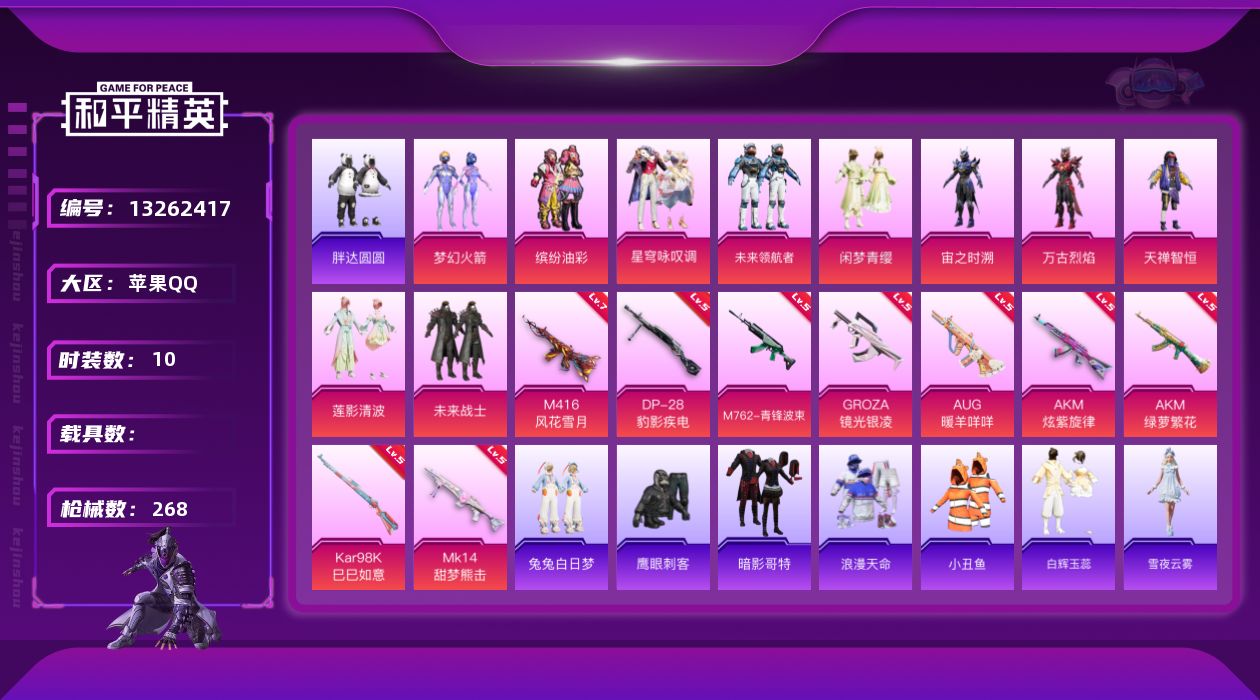 【11090990】【不可二次】【苹果QQ】龟仙人 AKM-绿萝繁花 M762-青锋波束 漫步者 繁龙极客飞行器 天禅智恒 狂沙舞者 极速红龙 AKM-炫紫旋律 M416-风花雪月 梦幻火箭 AKM-缤纷海域 缤纷油彩 浪漫假日 天之羽翼飞行器 未来战士 浪漫天命 梦幻火箭飞行器 暗影哥特 胖达圆圆