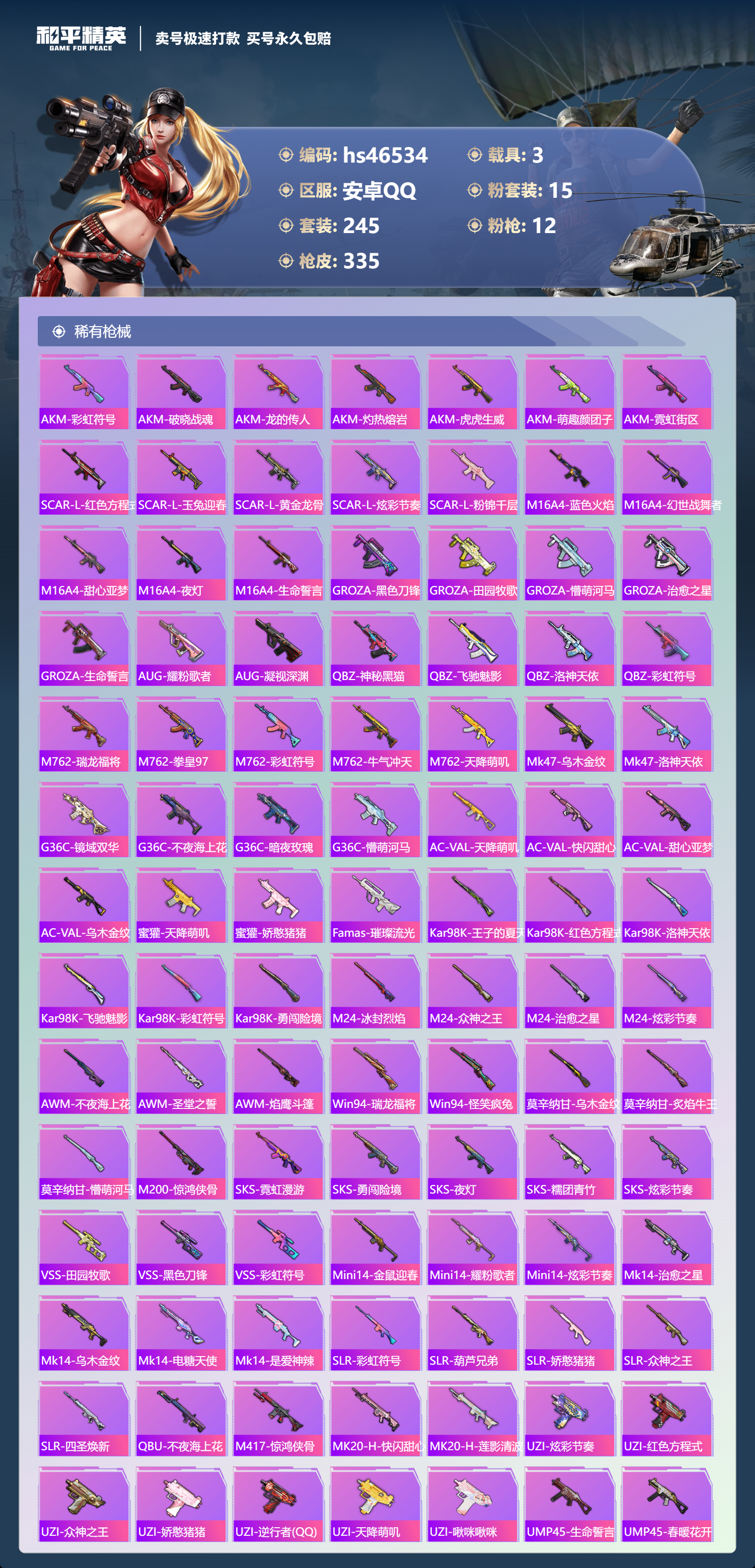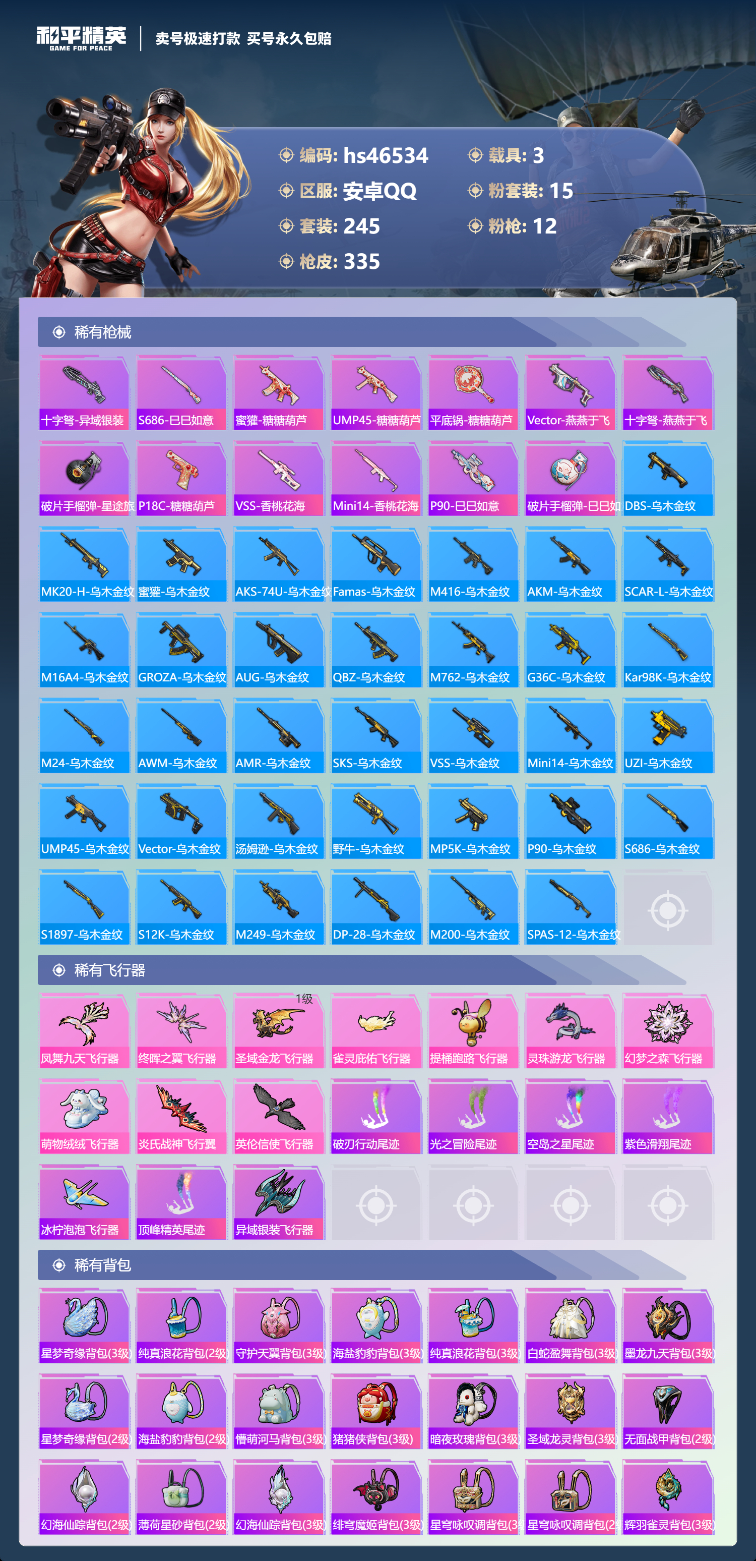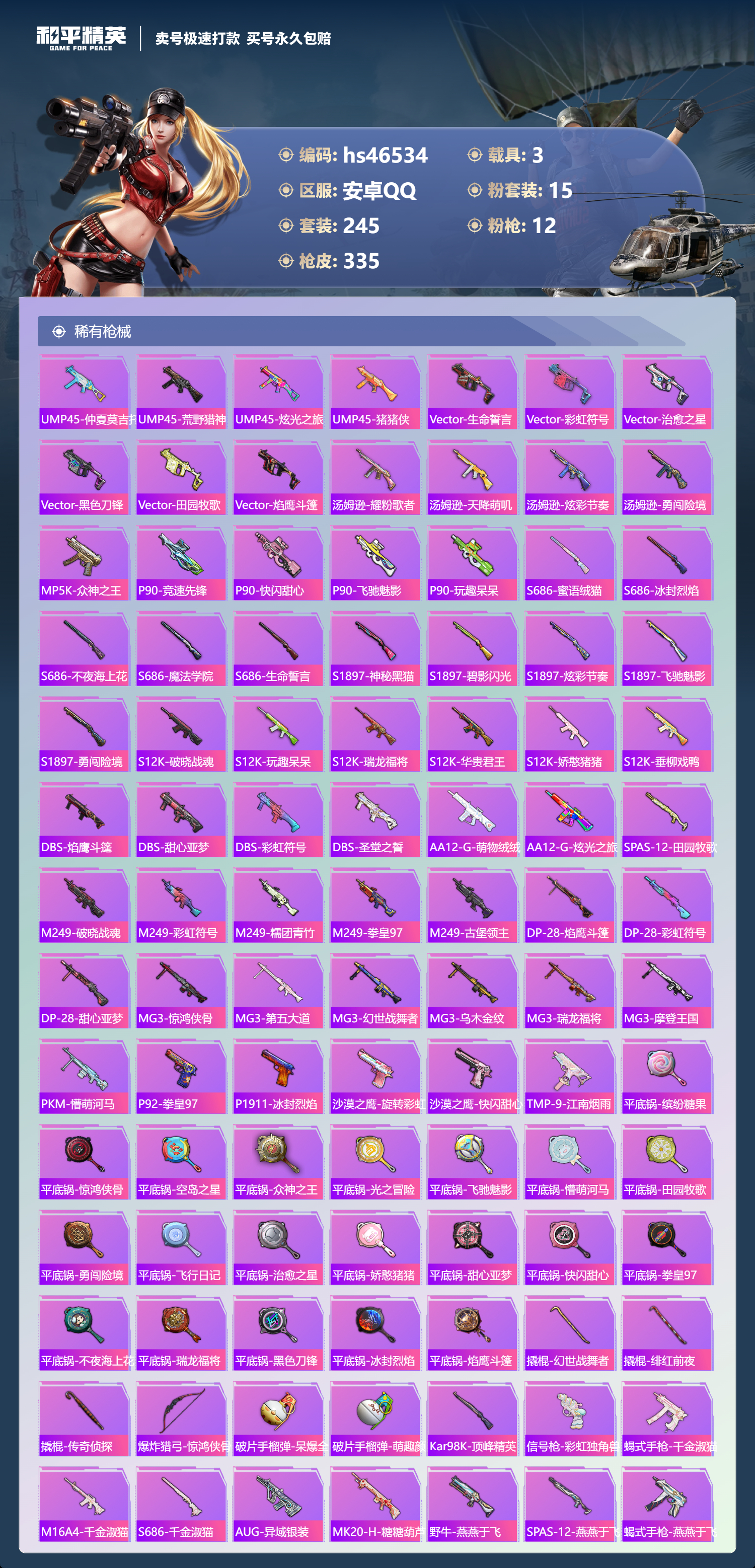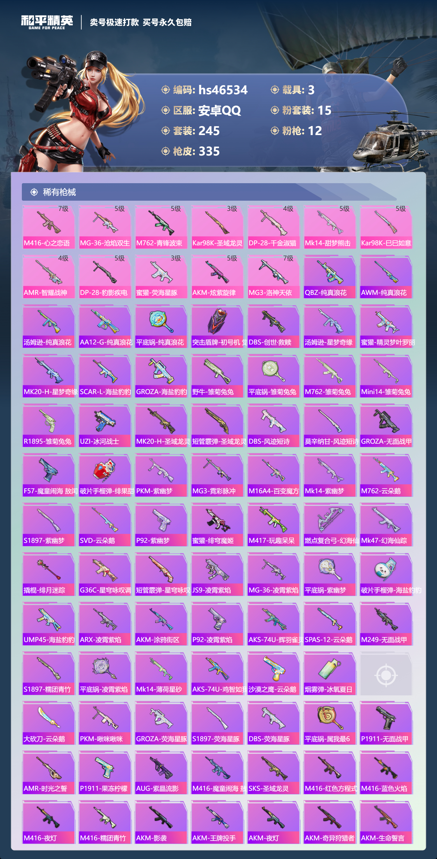 【11091035】【不可二次】【安卓QQ】蓝莓炮弹 龟仙人 水银刺客 M762-青锋波束 M249-古堡领主 海龙奔腾 极速红龙 炎氏战神飞行翼 星河领航(磐石银) M416-心之恋语 浪漫假日 瑞龙福将 醒狮腾龙 团圆交子 AKM-奇异狩猎者 软萌银虎 星梦玉骢 奇异狩猎者 M762-瑞龙福将 黑色刀锋 MG3-洛神天依 萌物绒绒飞行器 金羽特工 AKM-炫紫旋律 白月香洋装 圣域龙灵-瑞拉