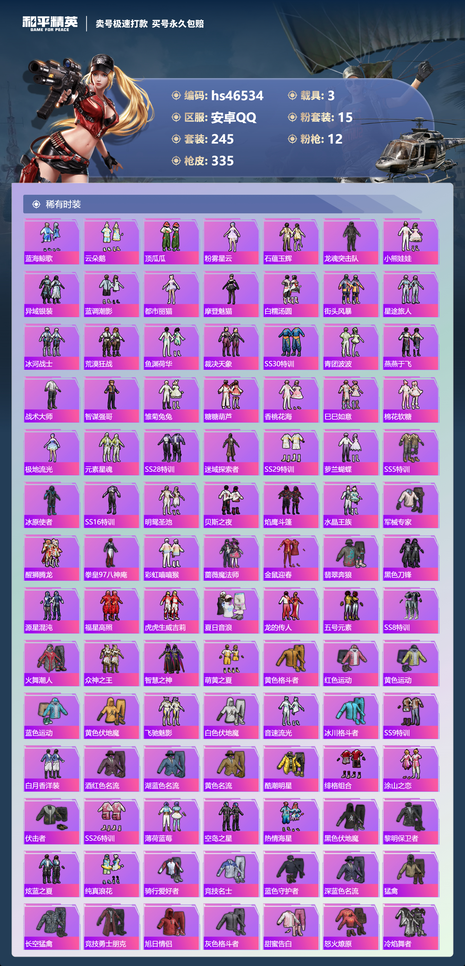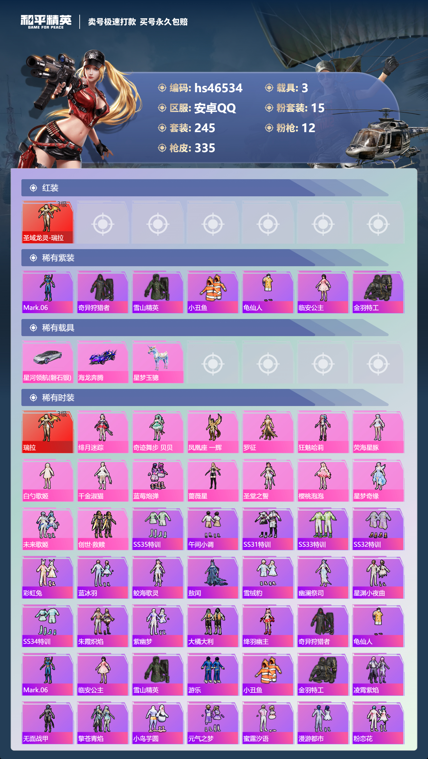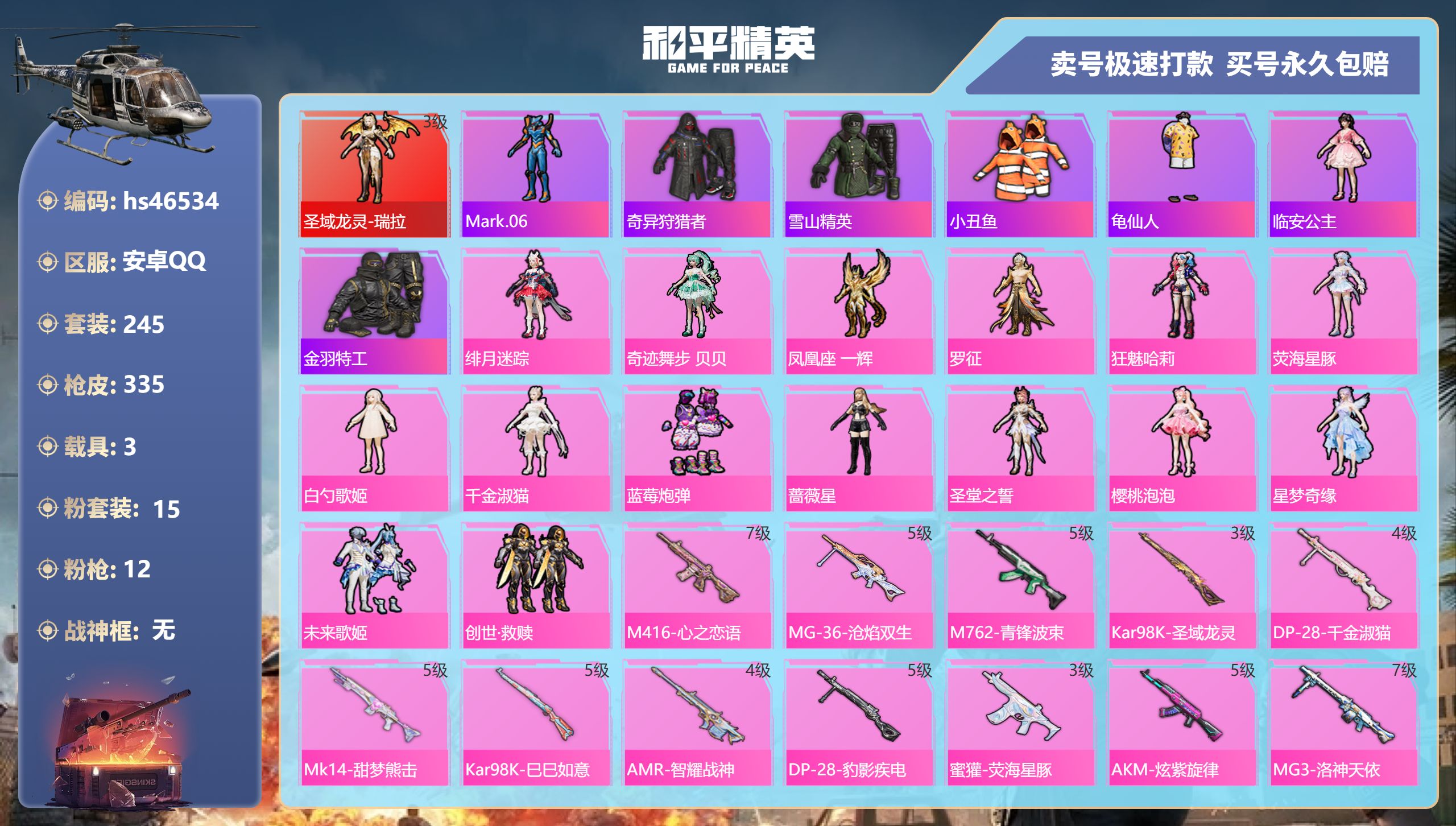 【11091035】【不可二次】【安卓QQ】蓝莓炮弹 龟仙人 水银刺客 M762-青锋波束 M249-古堡领主 海龙奔腾 极速红龙 炎氏战神飞行翼 星河领航(磐石银) M416-心之恋语 浪漫假日 瑞龙福将 醒狮腾龙 团圆交子 AKM-奇异狩猎者 软萌银虎 星梦玉骢 奇异狩猎者 M762-瑞龙福将 黑色刀锋 MG3-洛神天依 萌物绒绒飞行器 金羽特工 AKM-炫紫旋律 白月香洋装 圣域龙灵-瑞拉