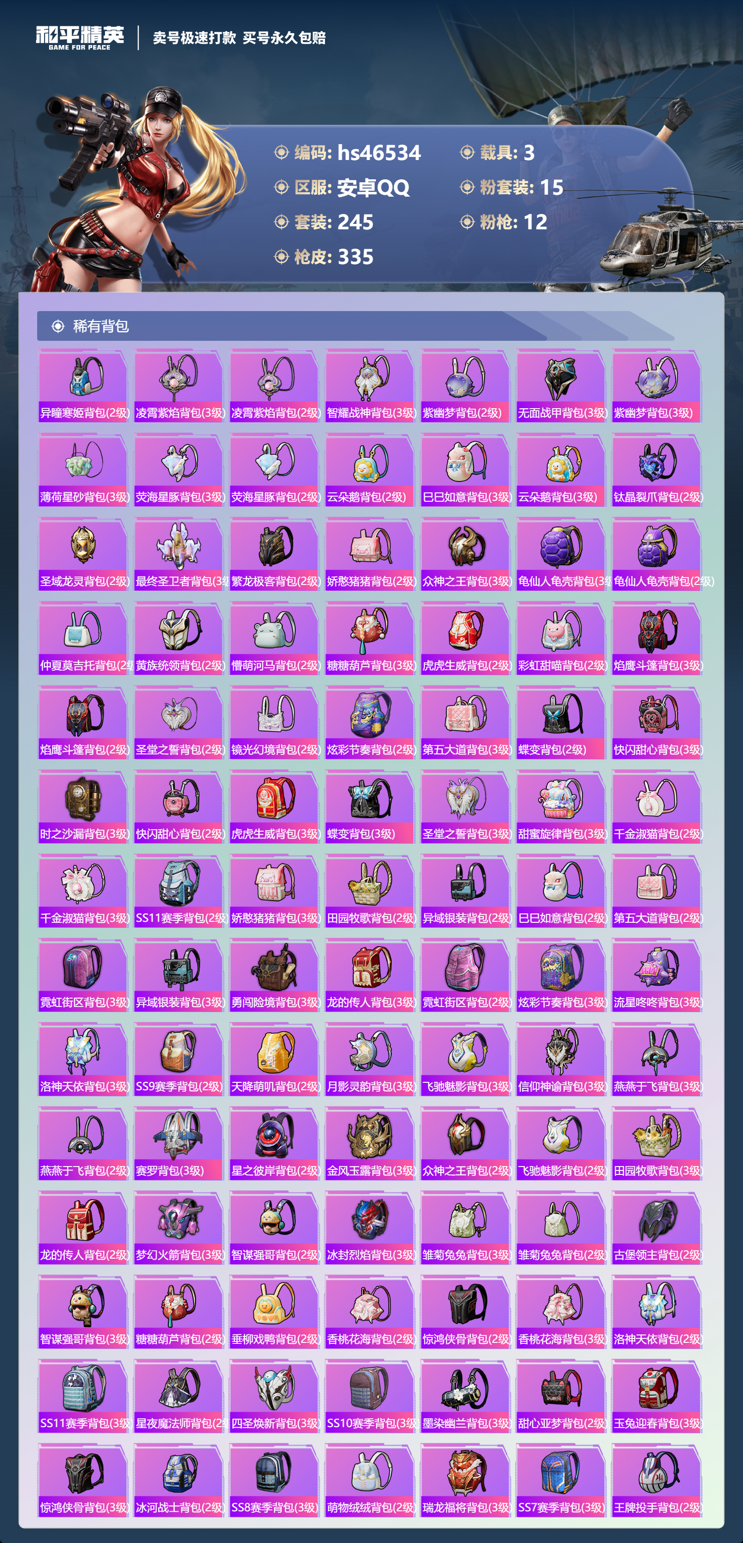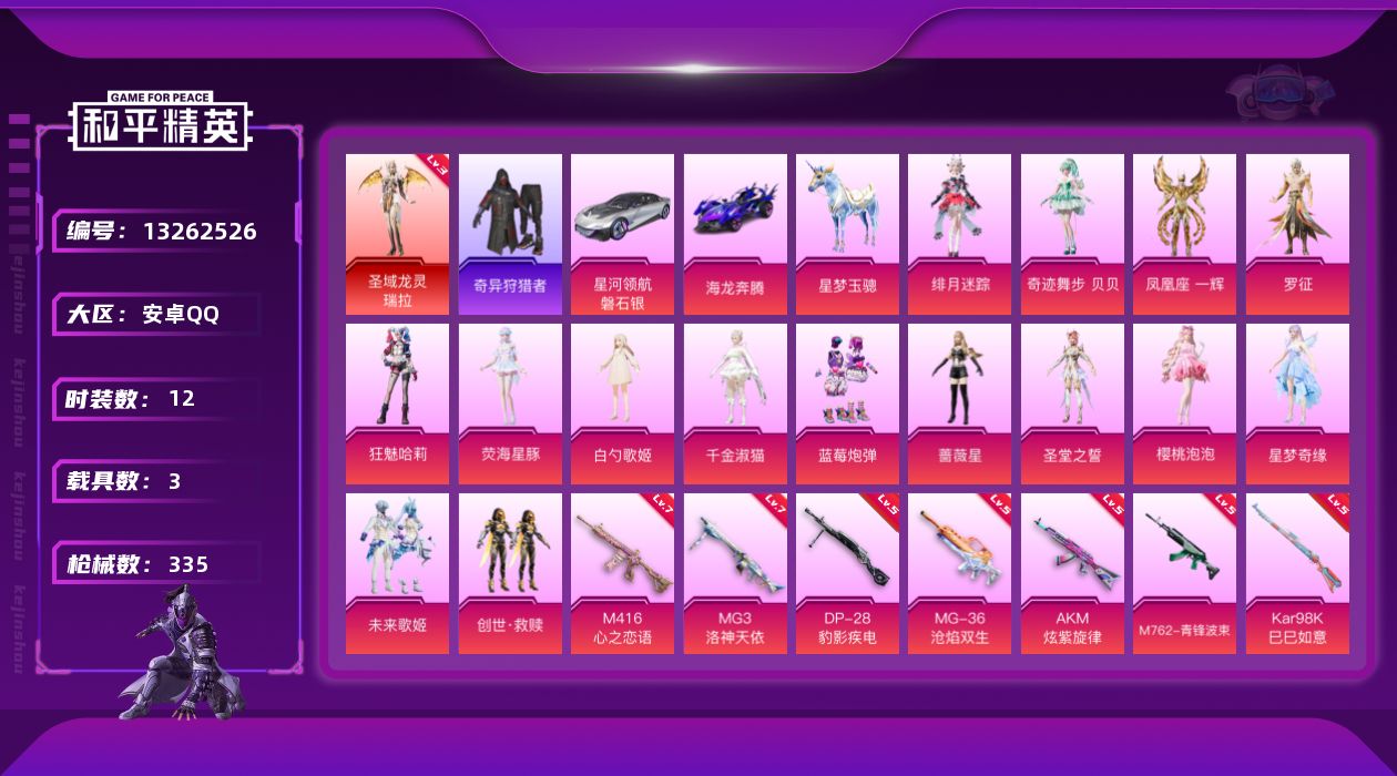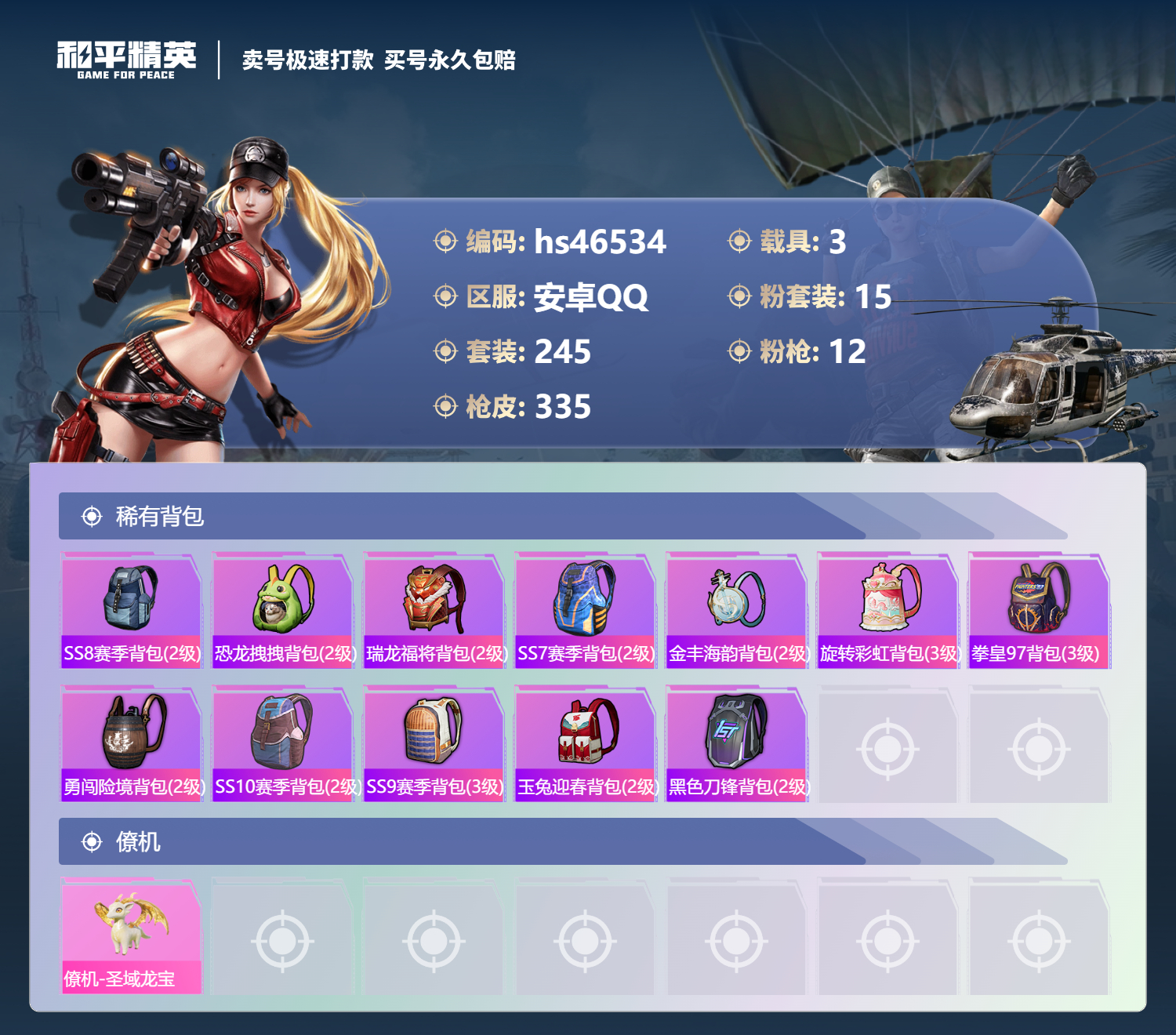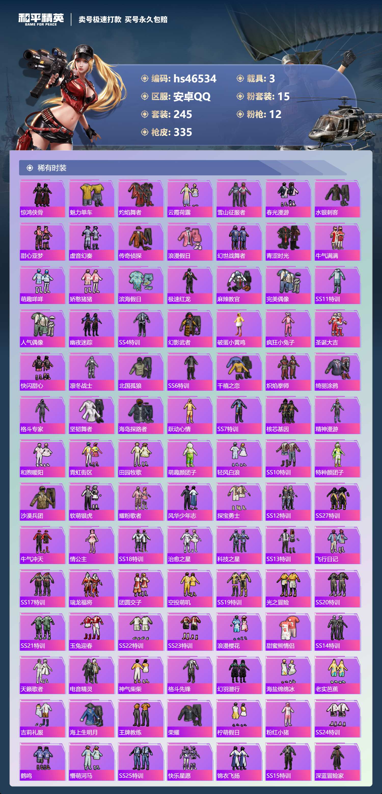 【11091035】【不可二次】【安卓QQ】蓝莓炮弹 龟仙人 水银刺客 M762-青锋波束 M249-古堡领主 海龙奔腾 极速红龙 炎氏战神飞行翼 星河领航(磐石银) M416-心之恋语 浪漫假日 瑞龙福将 醒狮腾龙 团圆交子 AKM-奇异狩猎者 软萌银虎 星梦玉骢 奇异狩猎者 M762-瑞龙福将 黑色刀锋 MG3-洛神天依 萌物绒绒飞行器 金羽特工 AKM-炫紫旋律 白月香洋装 圣域龙灵-瑞拉