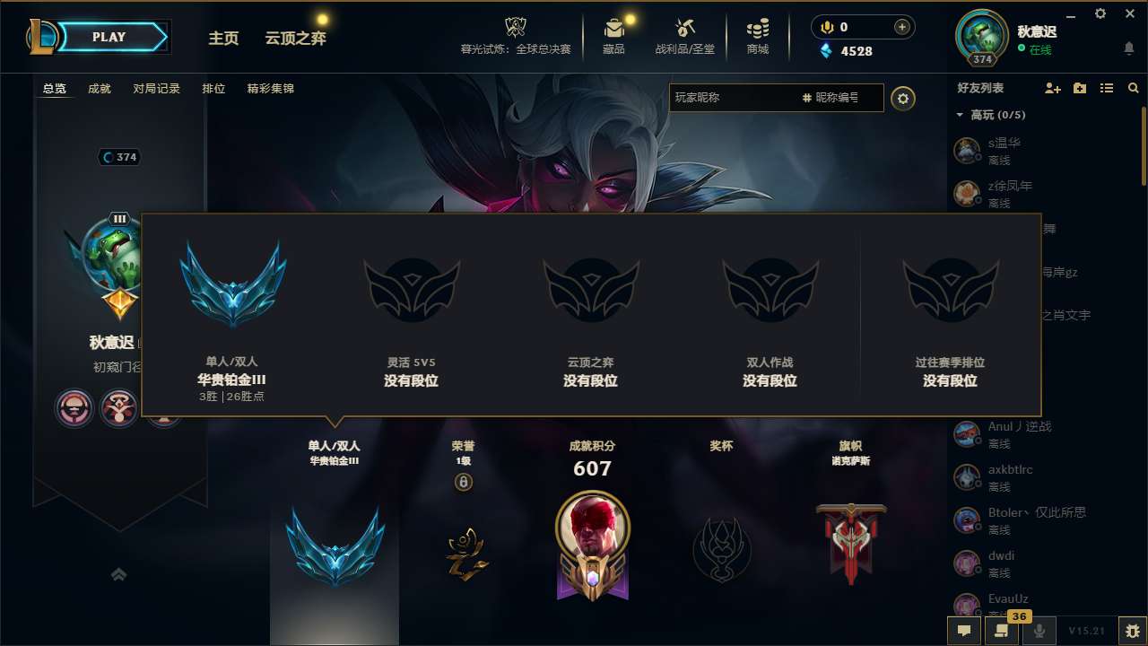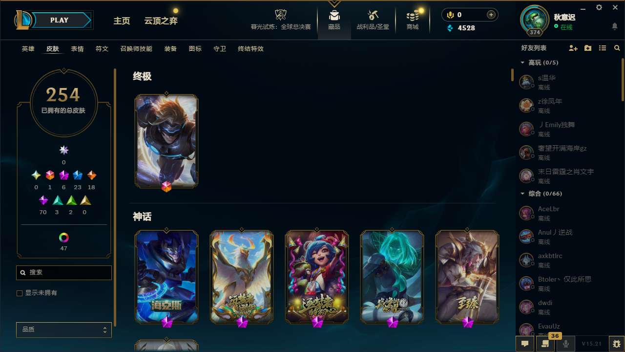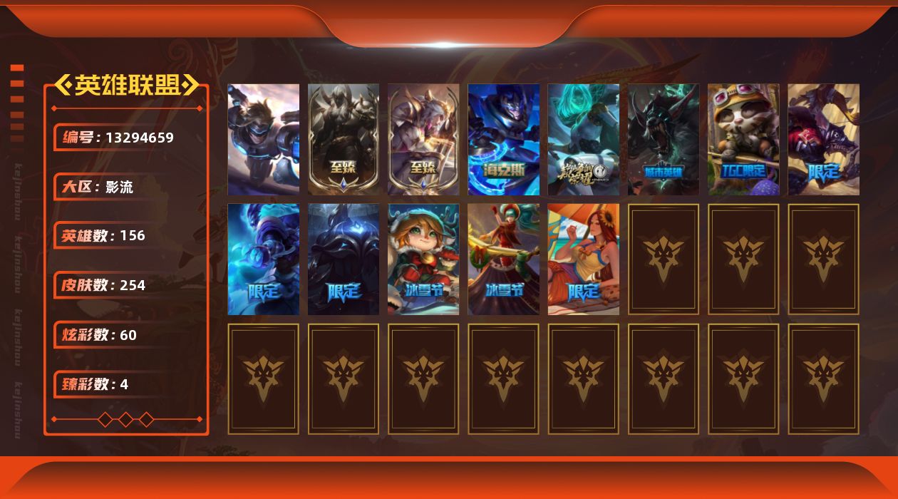 【11097435】[13294659]t29469【影流】 254皮肤 60炫彩 4臻彩 6神话/23限定/18传说/156英雄 账号等级:374 单双排段位:铂金【重要头像】爱情之歌 魔女卡蜜尔炫彩 泳池派对佐伊 KDA萨勒芬妮 【重要皮肤】女帝黛安娜至臻 腥红之月亚托克斯至臻 海克斯科技嘉文四世 胜利女神奥莉安娜 胜利枪神格雷福斯 胜利枪神卢锡安 胜利之剑亚托克斯 雪