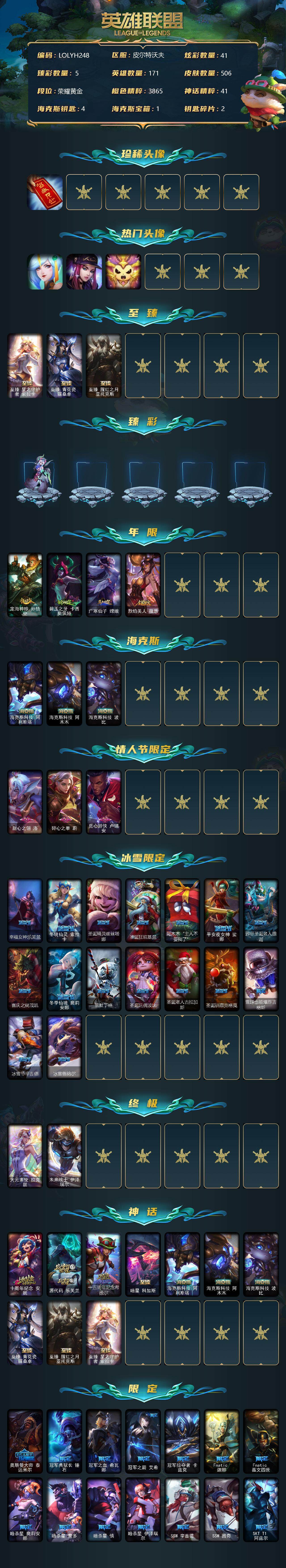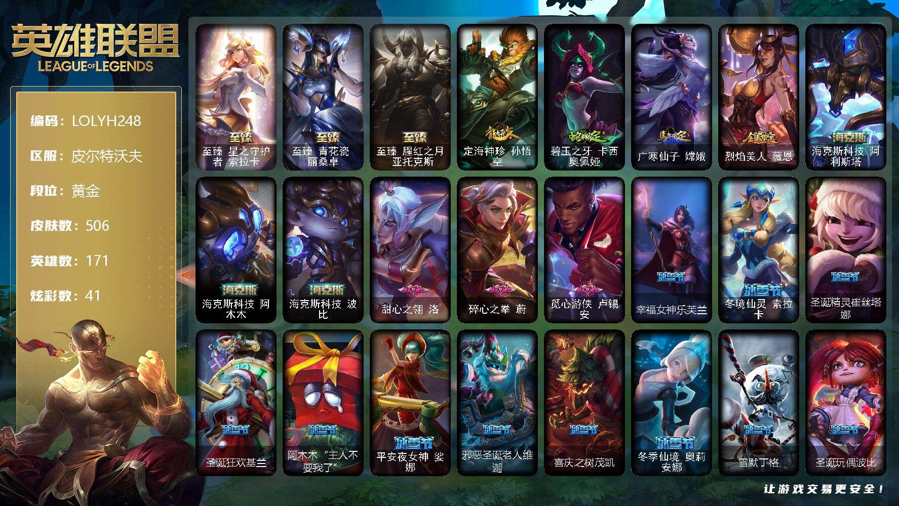 【11123141】【LOLYH248】171英雄/506皮肤/2终极/10神话/84限定/5臻彩/41炫彩/54传说/132史诗/黄金/红包/春晖神女/KDA阿卡丽头像/星守索拉卡/至臻星之守护者索拉卡/至臻青花瓷丽桑卓/至臻腥红之月亚托克斯/天龙之子卡莎飞龙乘云/墨之影武者亚索金墨耀影/幻灵战斗蝠薇恩梦幻强袭/魔女阿卡丽虚荣/净雪之月莫甘娜冬虹/定海神针孙悟空/碧玉之牙卡西奥佩娅/广寒仙子嫦