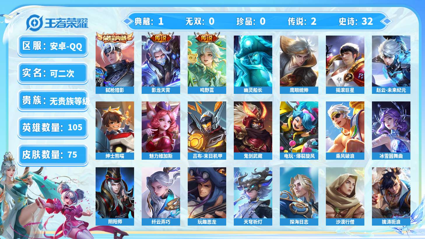 【11137131】【可二次】【QQ(安卓)】鹰眼统帅 影龙天霄 白执事 哥特玫瑰 剑破天穹 命运角斗场 沙漠行僧 探海日志 死亡骑士 龙腾万里 灼热之刃 万事如意 东方不败 激情绿茵 威尼斯狂欢 孤猎 特工魅影 金属风暴 古海寻踪 摇滚巨星 危途狂花 鬼剑武藏 年年有余 阴阳师 冰雪圆舞曲 谧流熔炉 龙域领主 魅力维加斯 破局者 云中旅人 天使之翼 海滩派对 蔷薇王座 地狱燃心 妄想特派 大漠
