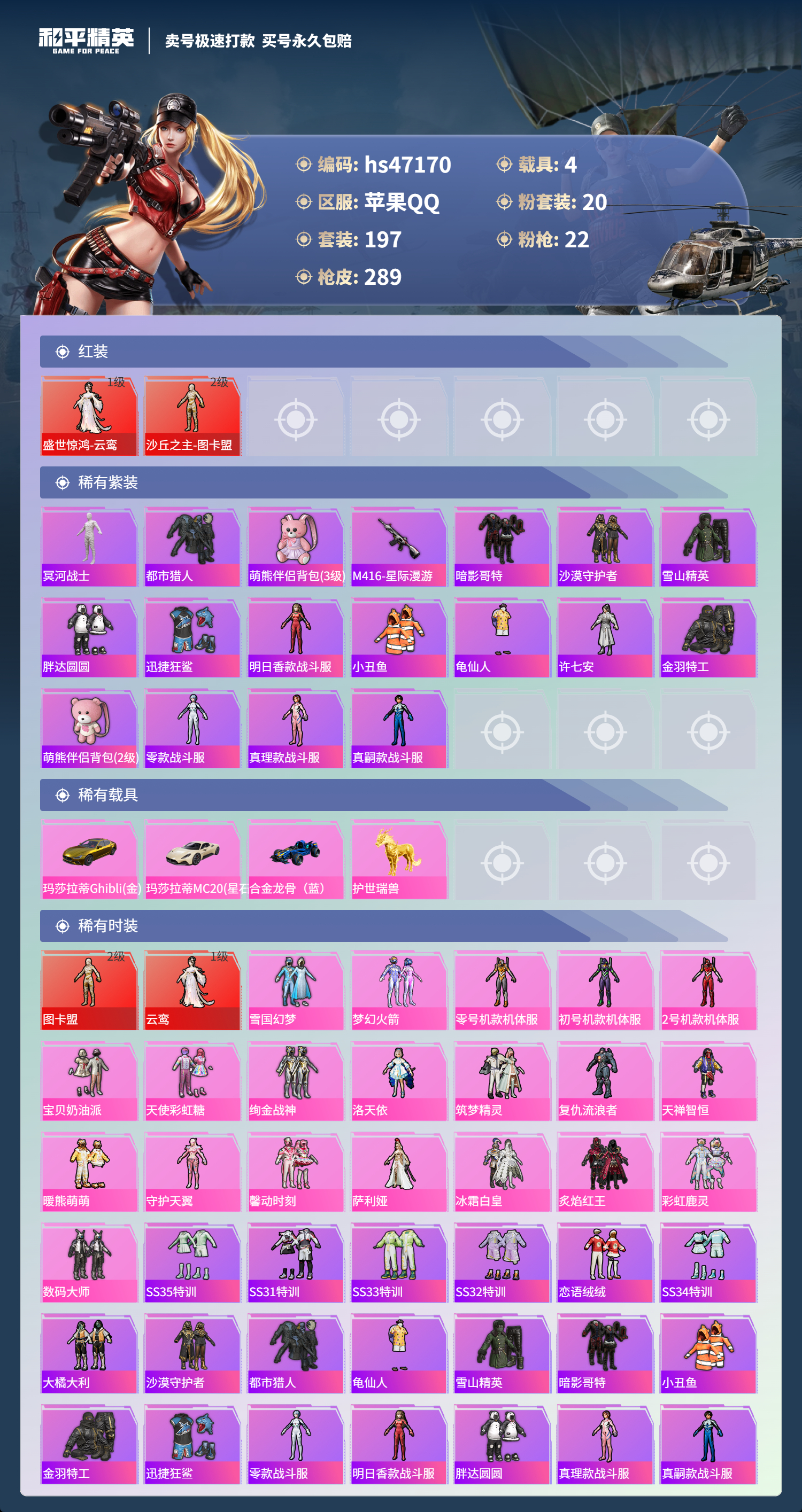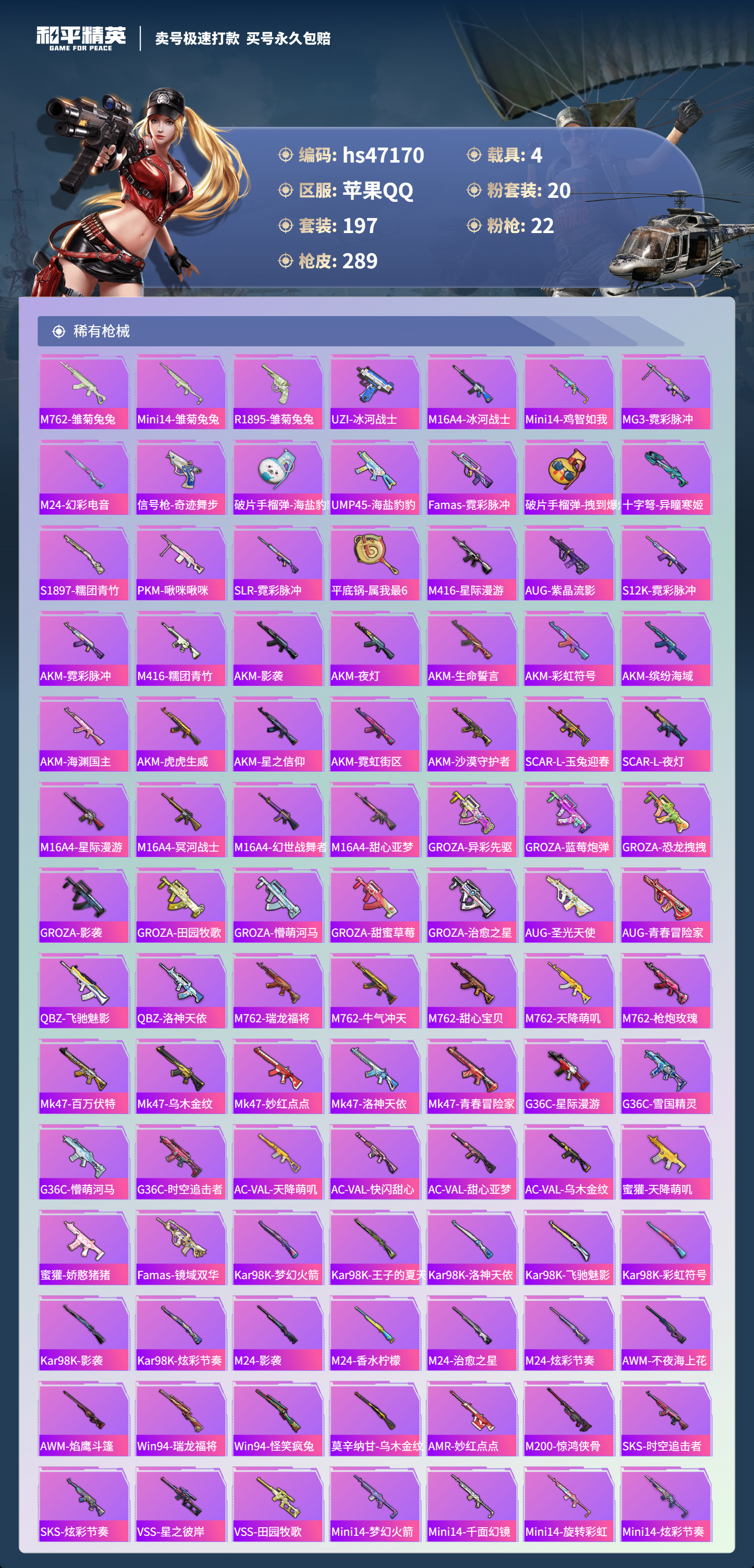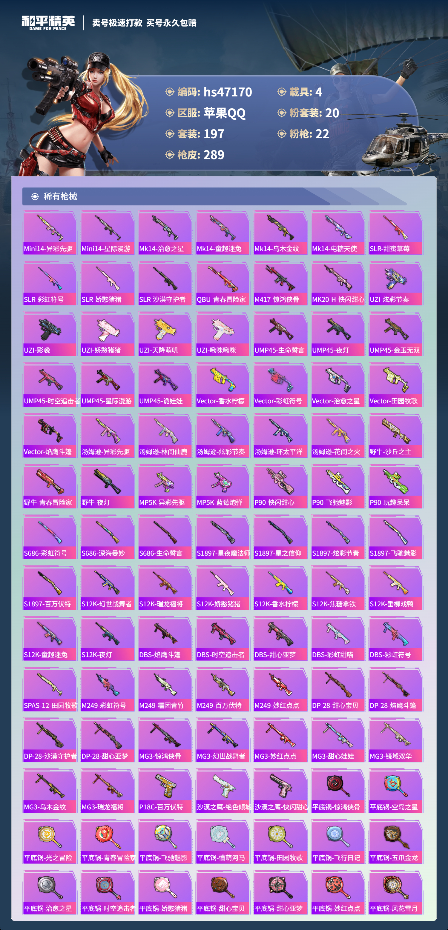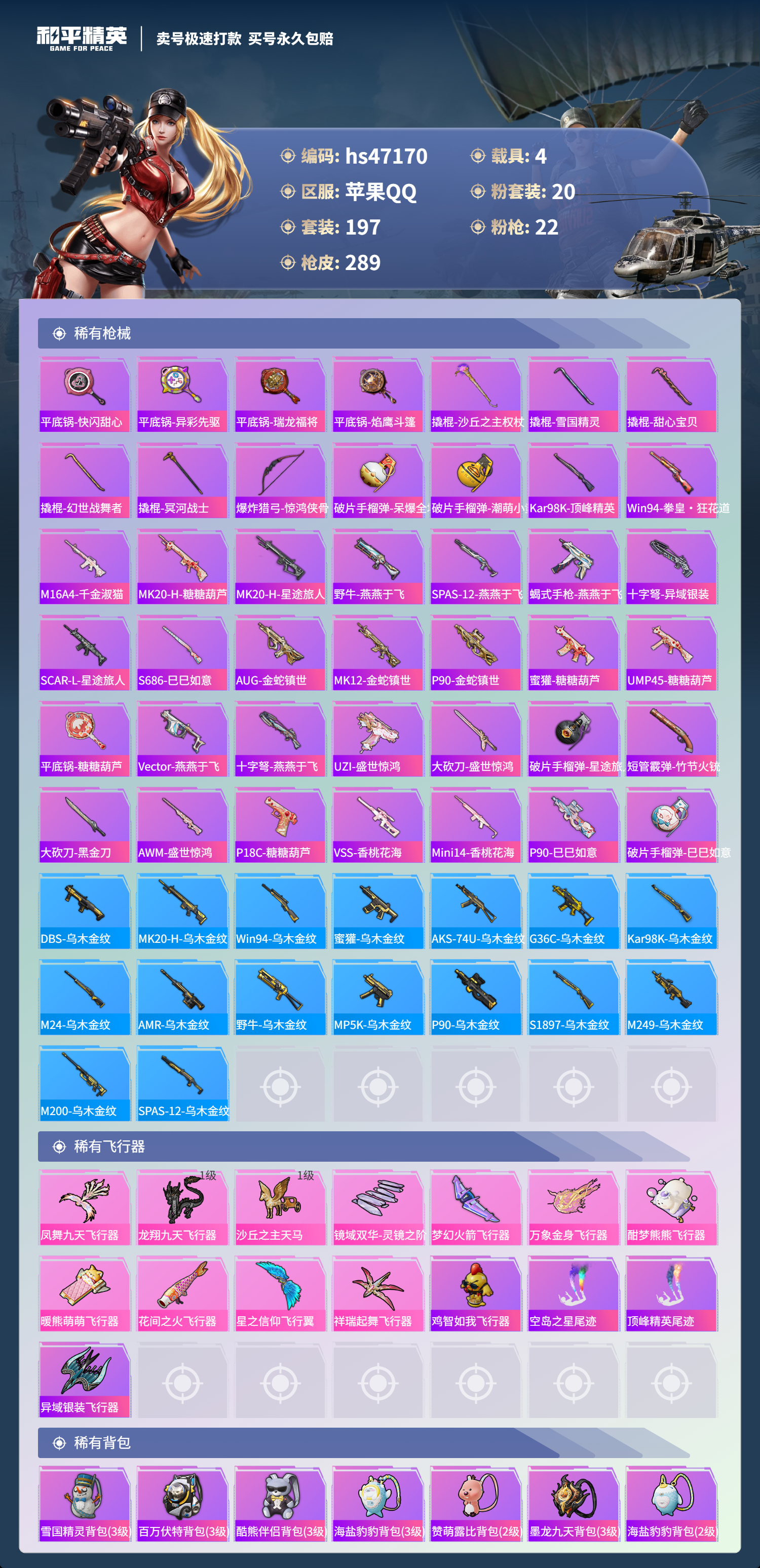 【11146621】【不可二次】【苹果QQ】合金龙骨蓝色 DP-28-枪炮玫瑰 龟仙人 漫步者 M416-星际漫游 都市猎人 忍者信条 沙丘之主-图卡盟 盛世惊鸿-云鸾 黄螳螂 馨动时刻 SCAR-童趣迷兔 花间之火飞行器 Kar98K-伏魔团 AKM-甜心宝贝 SCAR-L-梦幻火箭 M24-镜域双华 迅捷狂鲨 M762-瑞龙福将 狂沙舞者 龙翔九天飞行器 金羽特工 AKM-炫紫旋律 AKM-