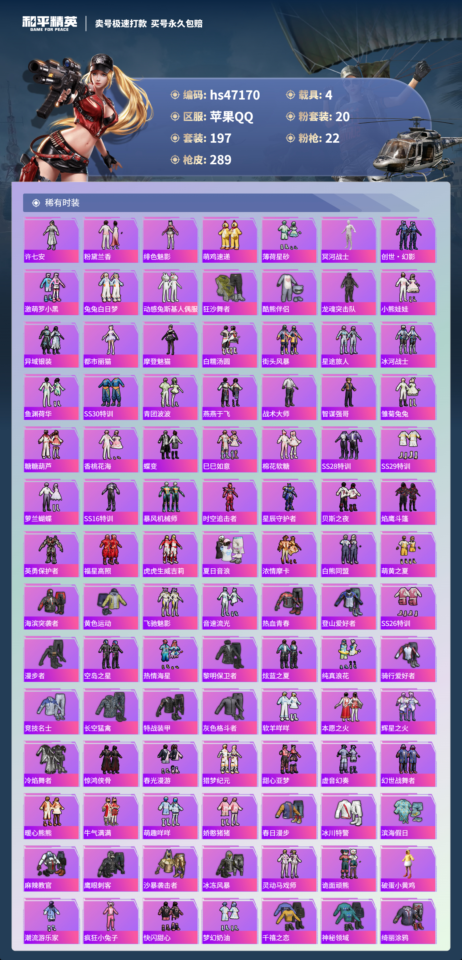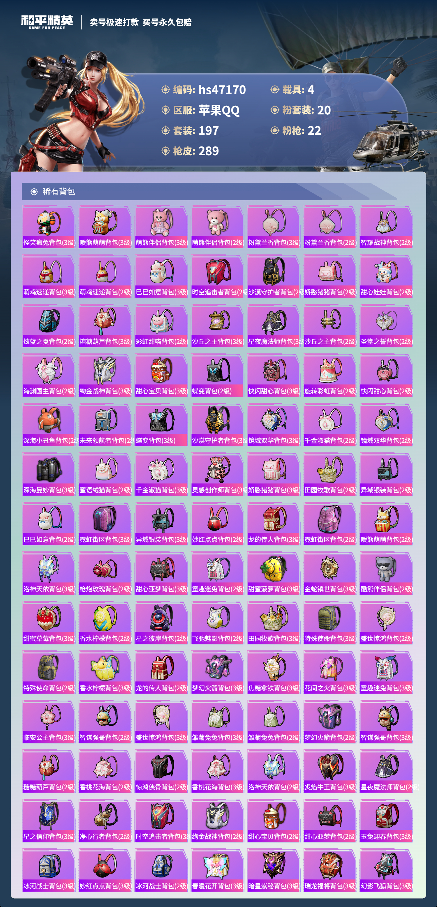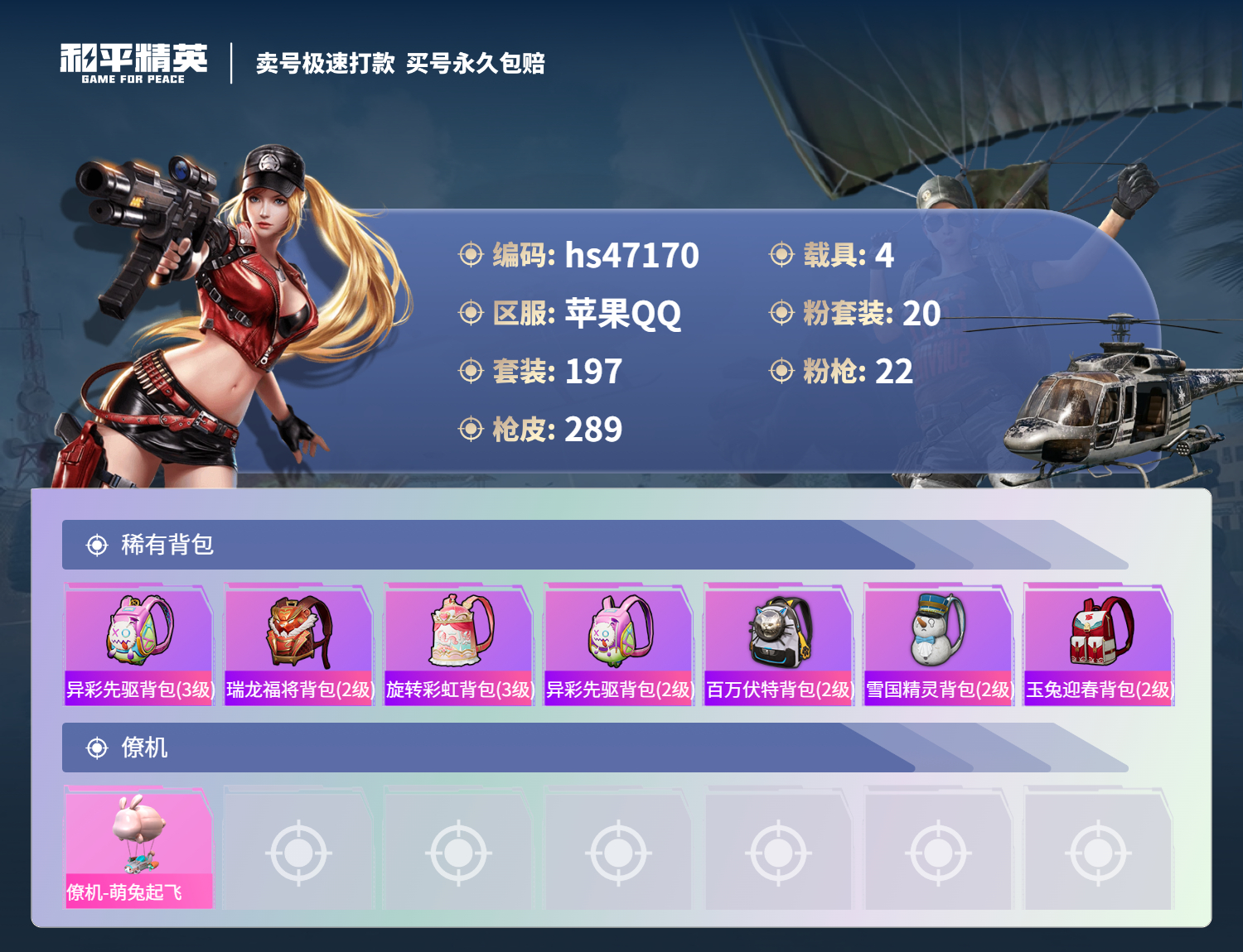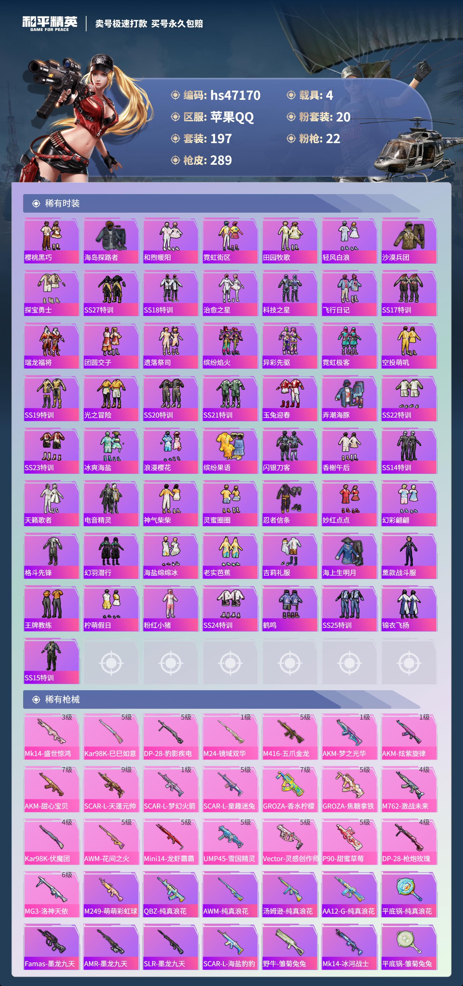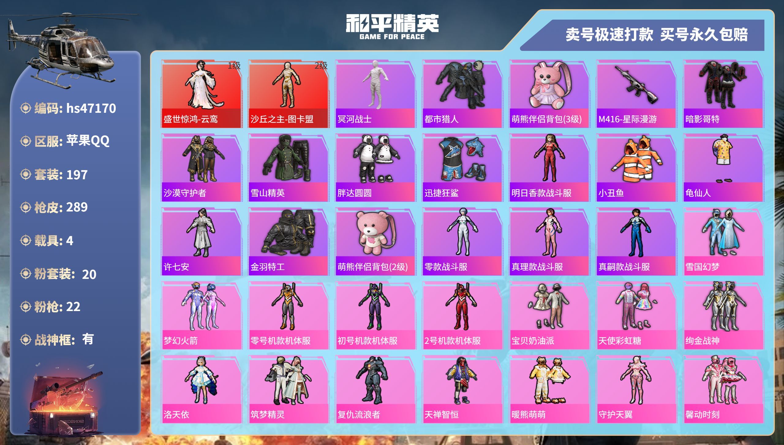 【11146621】【不可二次】【苹果QQ】合金龙骨蓝色 DP-28-枪炮玫瑰 龟仙人 漫步者 M416-星际漫游 都市猎人 忍者信条 沙丘之主-图卡盟 盛世惊鸿-云鸾 黄螳螂 馨动时刻 SCAR-童趣迷兔 花间之火飞行器 Kar98K-伏魔团 AKM-甜心宝贝 SCAR-L-梦幻火箭 M24-镜域双华 迅捷狂鲨 M762-瑞龙福将 狂沙舞者 龙翔九天飞行器 金羽特工 AKM-炫紫旋律 AKM-