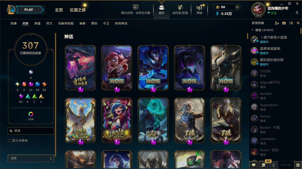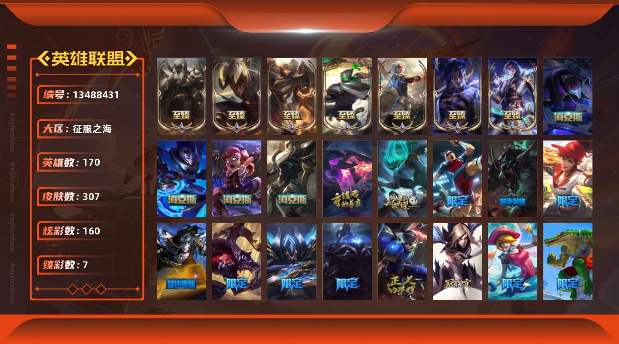 【11147143】[13488431]t29861【征服之海】307皮肤 160炫彩 7臻彩 15神话/39限定/38传说/170英雄 账号等级:761【重要头像】可爱悠米 披萨鸡 战斗学院伊泽瑞尔神话炫彩 此志无双羽饰骑士 【重要皮肤】机神玄武盖伦至臻 心之钢永恩至臻 至高天奎桑提至臻 黑夜使者凯隐至臻 征服者贾克斯至臻 腥红之月亚托克斯至臻 黑夜使者李青至臻 海克斯科