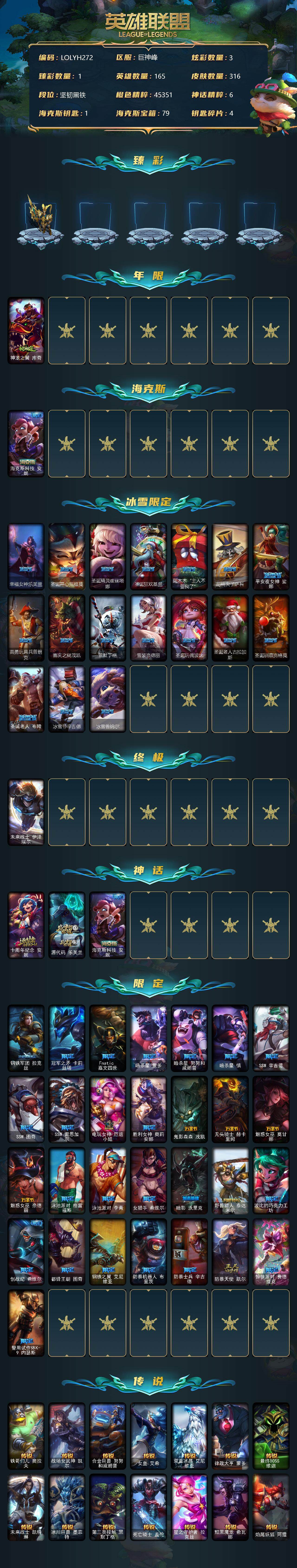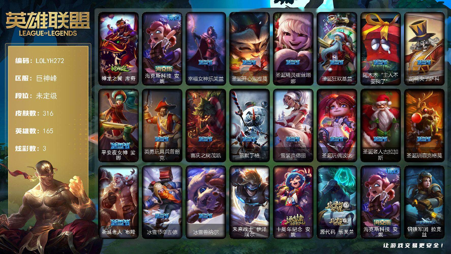 【11151282】【LOLYH272】165英雄/316皮肤/1终极/3神话/47限定/1臻彩/3炫彩/20传说/78史诗/未定级/吕布奉先炫金战神/神龙之翼库奇/海克斯科技安妮/幸福女神乐芙兰/圣诞开心鬼提莫/圣诞精灵崔丝塔娜/圣诞狂欢基兰/阿木木:“主人不要我了”/胡桃夹子萨科/平安夜女神娑娜/英勇玩具兵普朗克/喜庆之树茂凯/雪默丁格/雪装奈德丽/圣诞玩偶波比/圣诞老人古拉加斯/圣诞驯鹿克