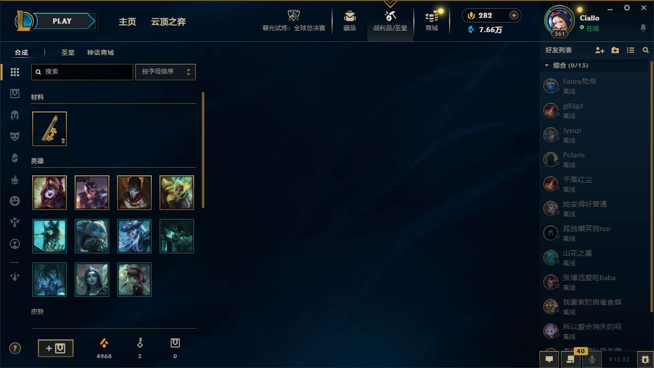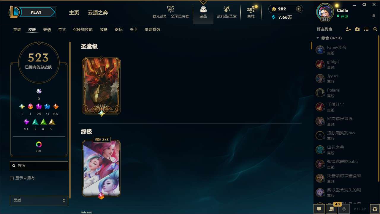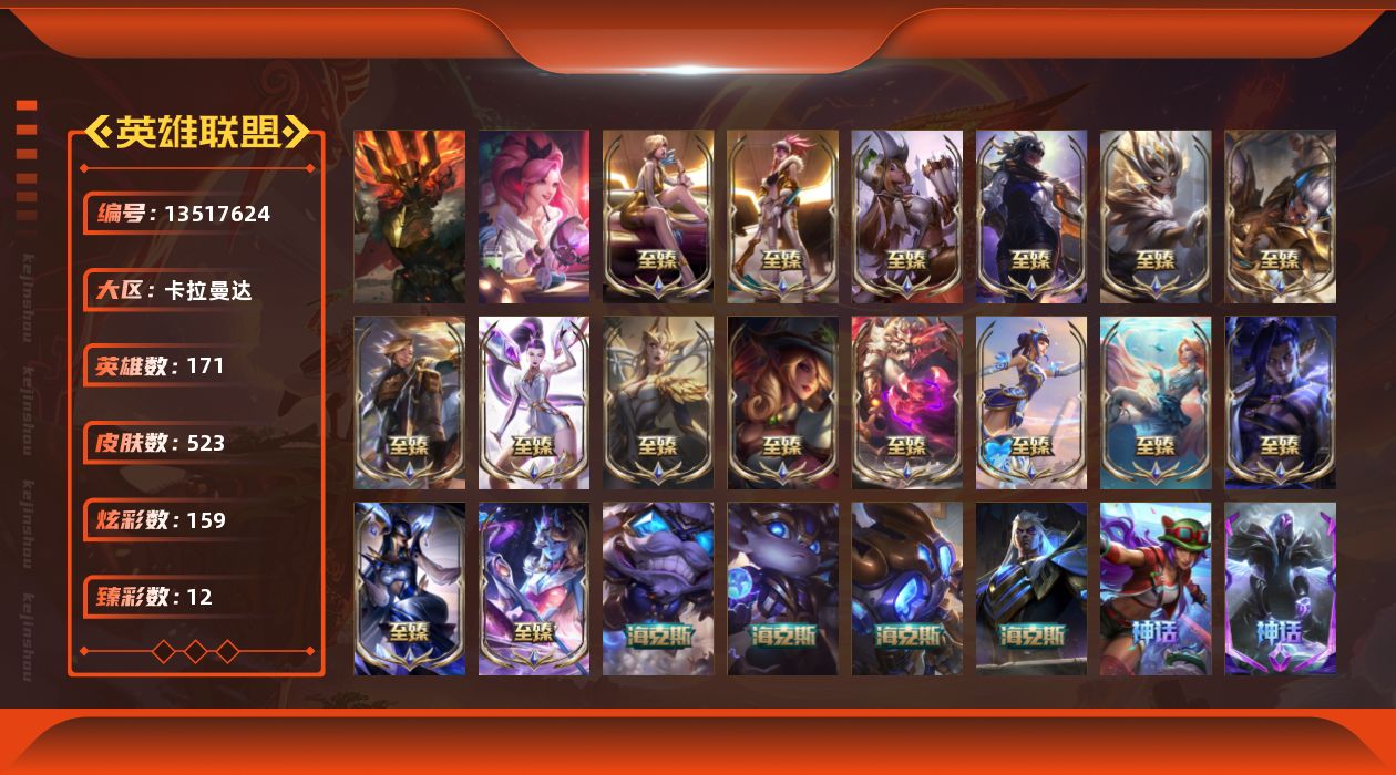 【11155283】[13517624]t29946【卡拉曼达】萨恩乌祖尔莫德凯撒 523皮肤 159炫彩 12臻彩 24神话/71限定/65传说/171英雄 账号等级:361 云顶神话:2 单双排段位:青铜【重要头像】云顶古琴娑娜 大家伙 萨勒芬妮超级巨星 萨勒芬妮独立音乐人 我麦是开的么 击拳 幼犬沃里克 西部天使赛娜神话炫彩 此志无双羽饰骑士 不错哦 至臻青花瓷丽桑卓