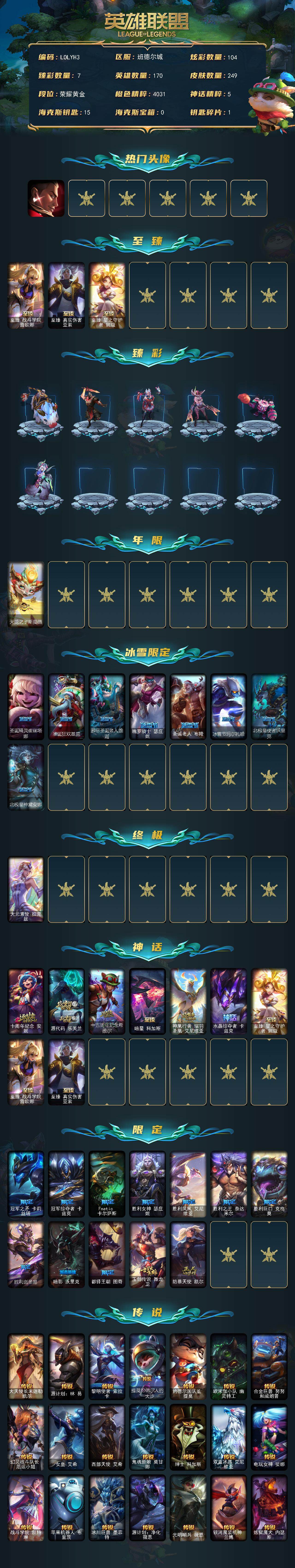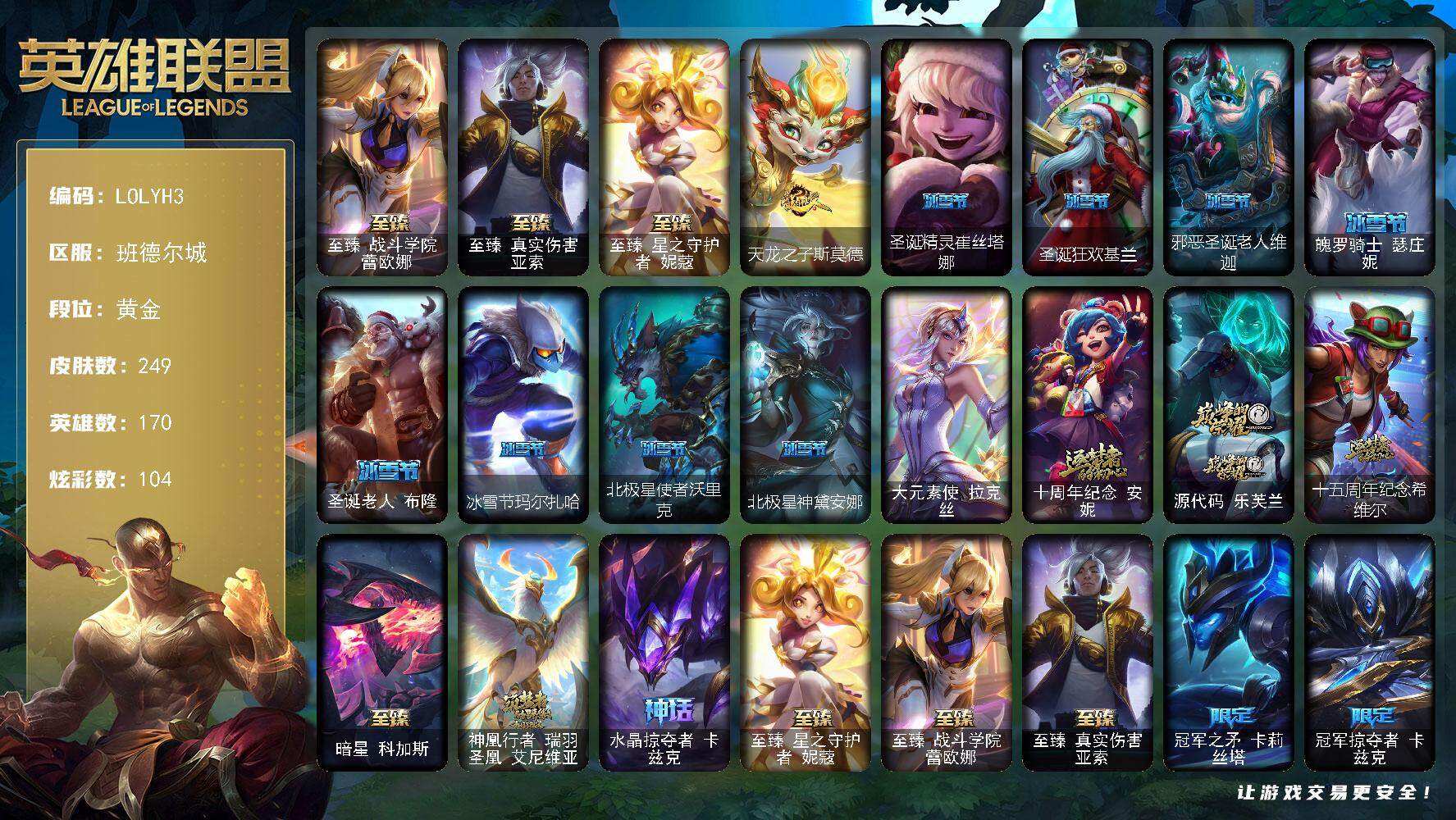 【11155668】【LOLYH290】170英雄/249皮肤/1终极/9神话/22限定/7臻彩/104炫彩/31传说/66史诗/黄金账号等级:474/觅心游侠卢锡安/至臻战斗学院蕾欧娜/至臻真实伤害亚索/至臻星之守护者妮蔻/无畏骑士瑟庄妮赤子初心/灰烬守护者慎余烬觉醒/星之守护者卡莎热情之光/破败军团厄运小姐灵岛征伐使/可爱可爱粉红红布里茨/魔女阿卡丽虚荣/净雪之月莫甘娜冬虹/天龙之子斯莫德/