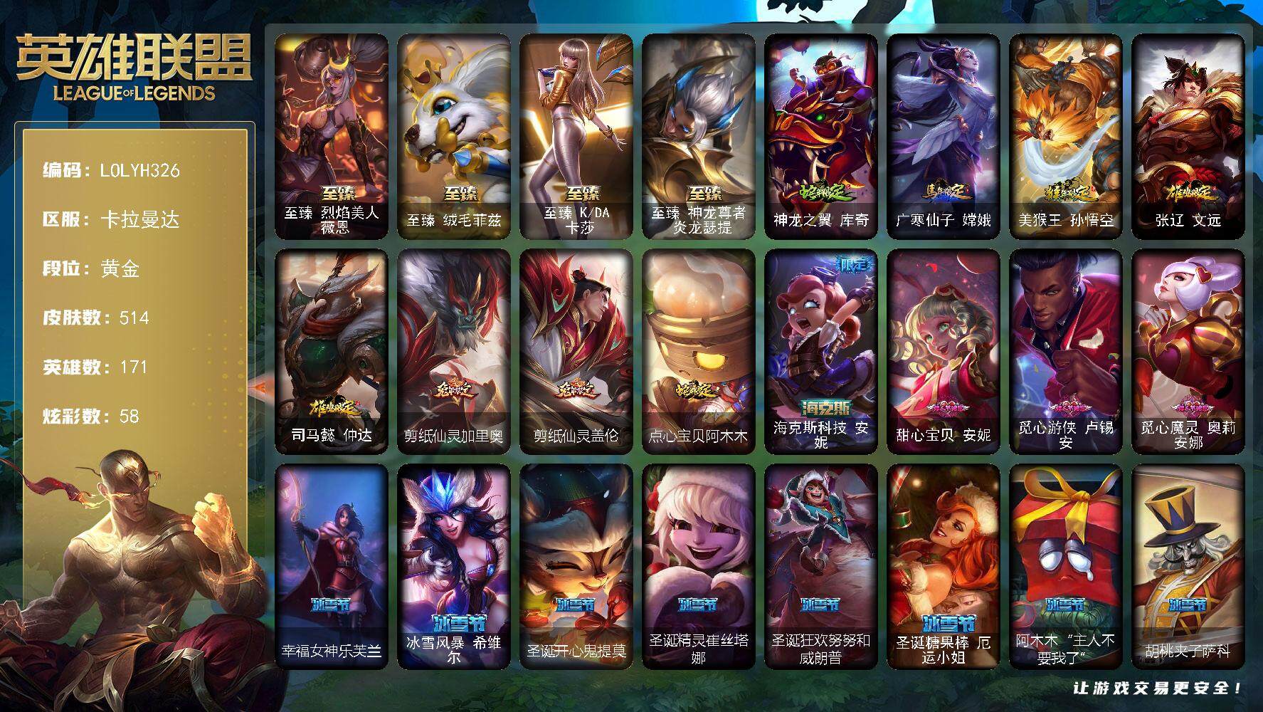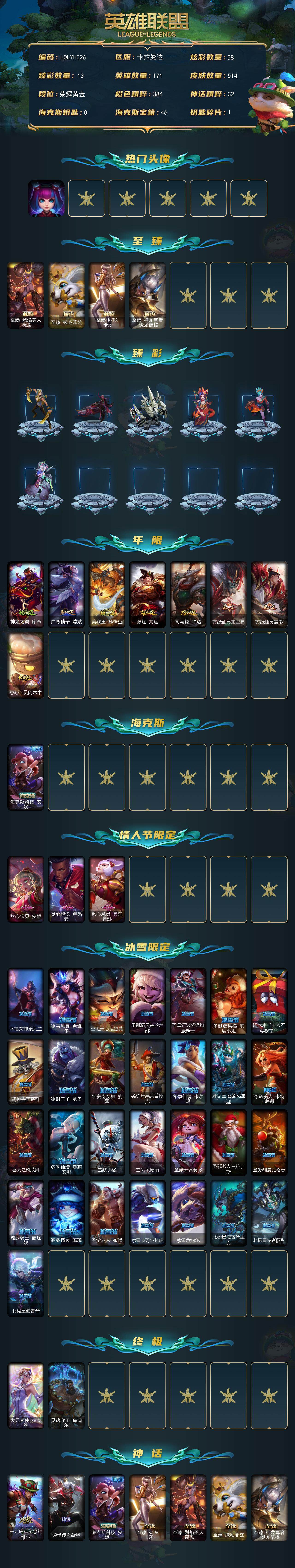 【11164236】【LOLYH326】171英雄/514皮肤/2终极/7神话/116限定/13臻彩/58炫彩/55传说/111史诗/黄金/银河魔装机神安妮/至臻烈焰美人薇恩/至臻绒毛菲兹/至臻K/DA卡莎/至臻神龙尊者炎龙瑟提/天龙之子卡莎飞龙乘云/墨之影武者亚索金墨耀影/闭月之颜貂蝉炫金莲华/西部天使赛娜贝利尔之怠/霸天巨兽雪崩墨菲特/灵魂莲华卡西奥佩娅流火/灵魂莲华锐雯流火/魔女阿卡丽虚荣