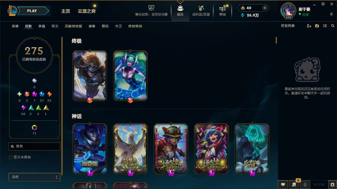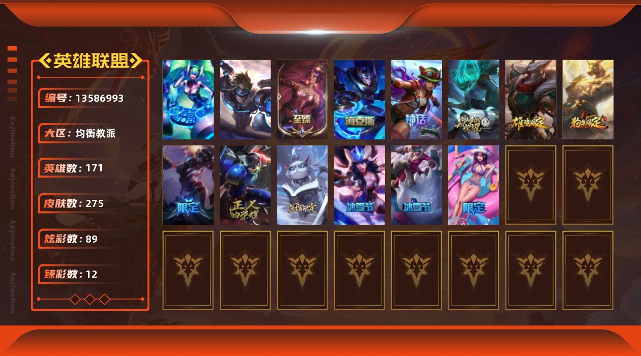 【11168272】[13586993]t30064 皇冠账号【均衡教派】275皮肤 89炫彩 12臻彩 7神话/27限定/25传说/171英雄 账号等级:692 单双排段位:白银 【重要头像】爱意绵绵 泳池派对凯特琳 万圣节卡特琳娜 魄罗宇航员 【重要皮肤】暗裔英雄嘉文四世至臻 剪纸仙灵希维尔至臻 海克斯科技嘉文四世 胜利剑圣易 胜利女神希维尔 胜利之王泰达米尔 胜利巨口