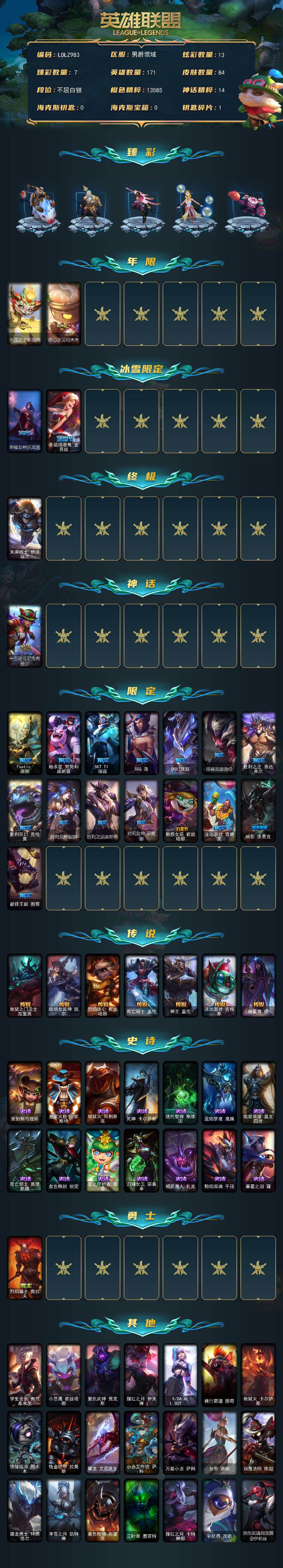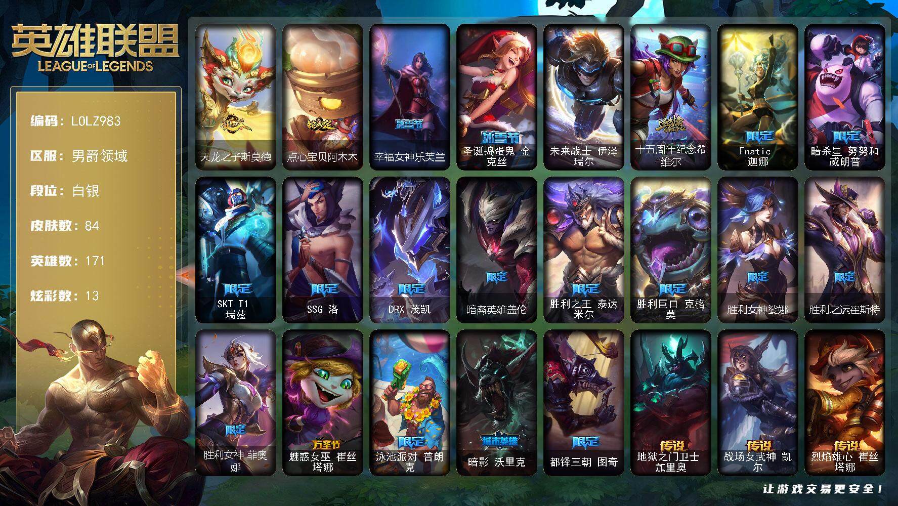 【11169769】【LOLZ983】171英雄/84皮肤/1终极/1神话/19限定/7臻彩/13炫彩/7传说/14史诗/白银/无畏骑士瑟庄妮赤子初心/冠军之志瑞兹凯旋圣装/玉剑传说无影竞星/泳池派对辛德拉荔枝枝连击/可爱可爱粉红红布里茨/海之歌艾希冰爽浪花/星之守护者阿卡丽未来之光/天龙之子斯莫德/点心宝贝阿木木/幸福女神乐芙兰/圣诞捣蛋鬼金克丝/未来战士伊泽瑞尔/十五周年纪念希维尔/Fnat