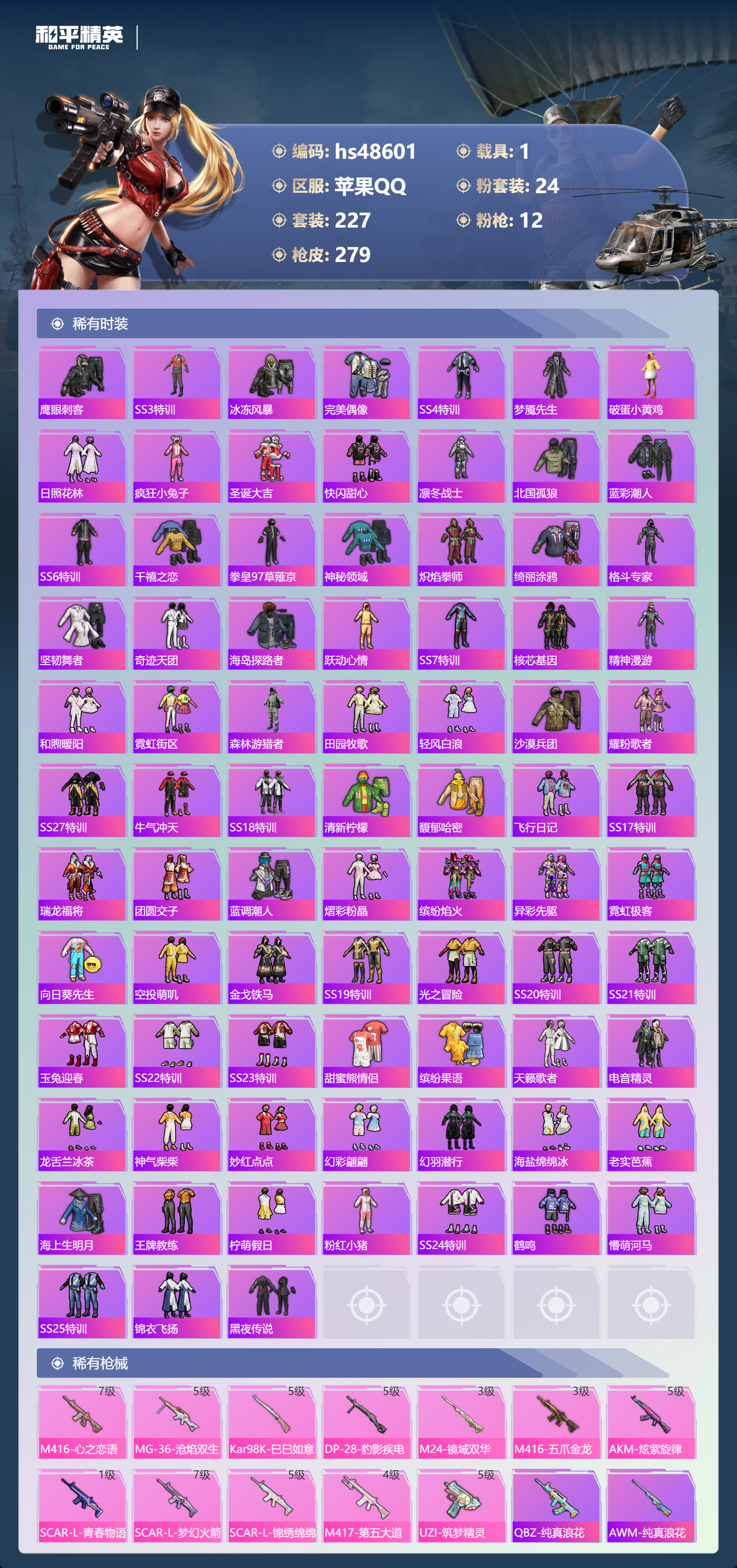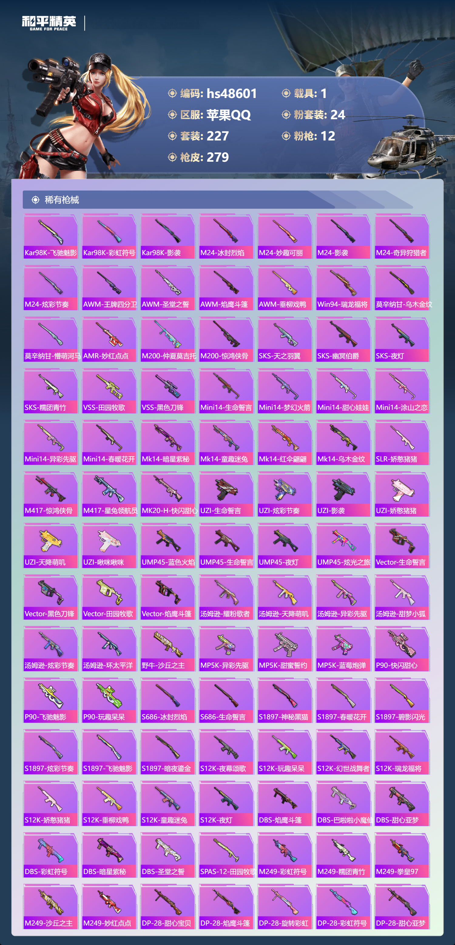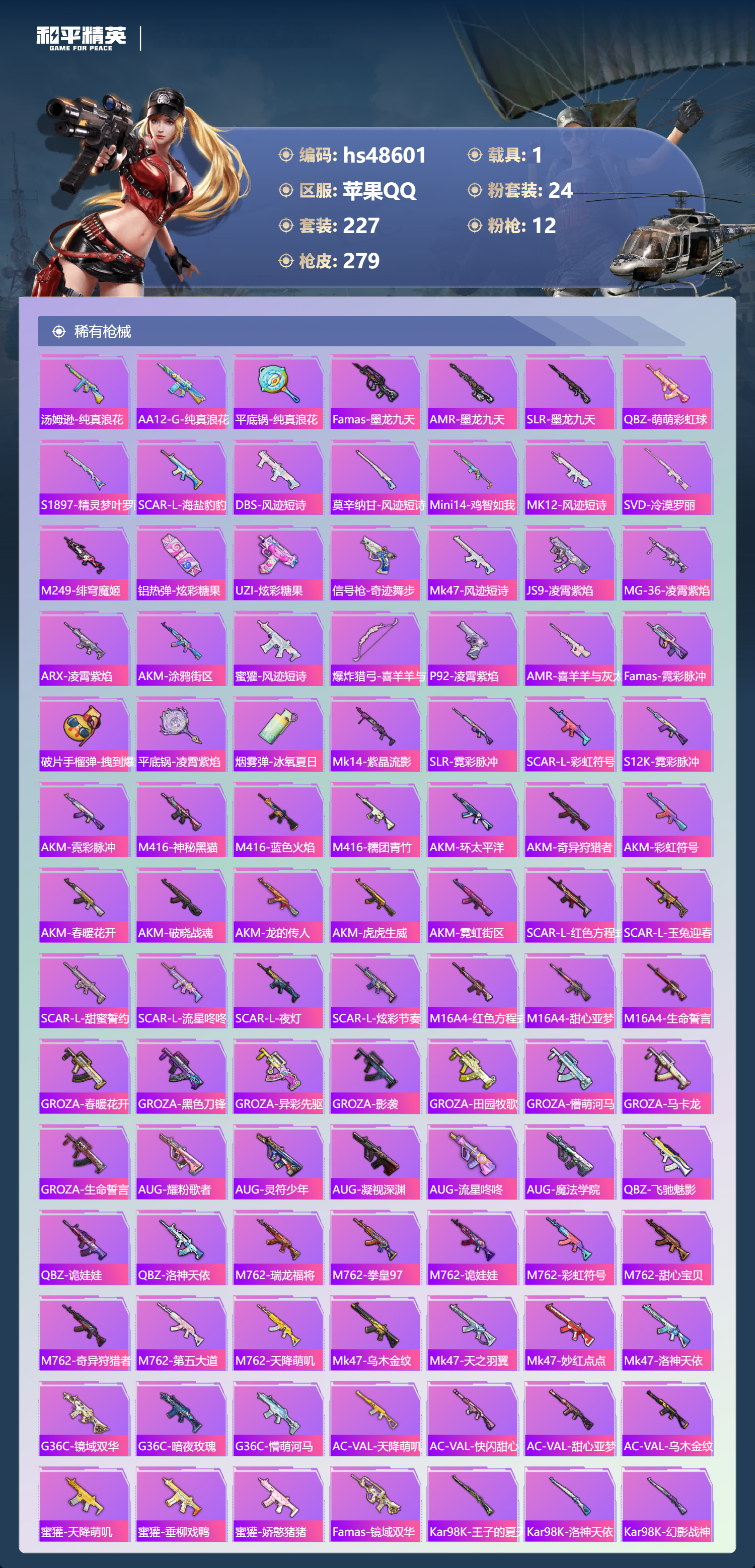 【11175847】【不可二次】【苹果QQ】龟仙人 金曜白虎 漫步者 流星咚咚 M762-奇异狩猎者 M416-心之恋语 缤纷油彩 浪漫波比 天之羽翼 纯白誓言 AKM-奇异狩猎者 SCAR-L-梦幻火箭 M24-镜域双华 M762-瑞龙福将 潮萌小黄鸭 黑色刀锋 M417射手步枪 龙翔九天飞行器 齐天大圣 SCAR-L-锦绣绵绵 AKM-炫紫旋律 暗夜玫瑰 金耀白虎 天之羽翼飞行器 M417-