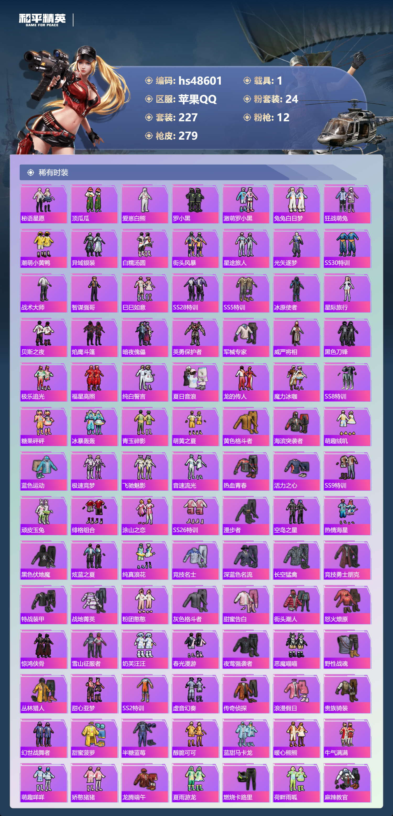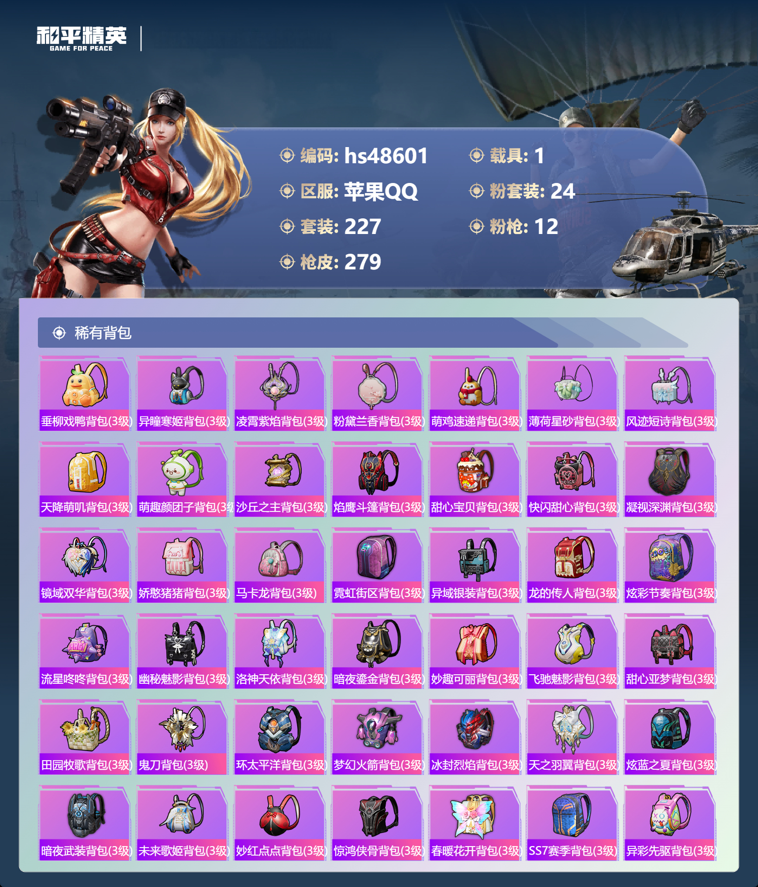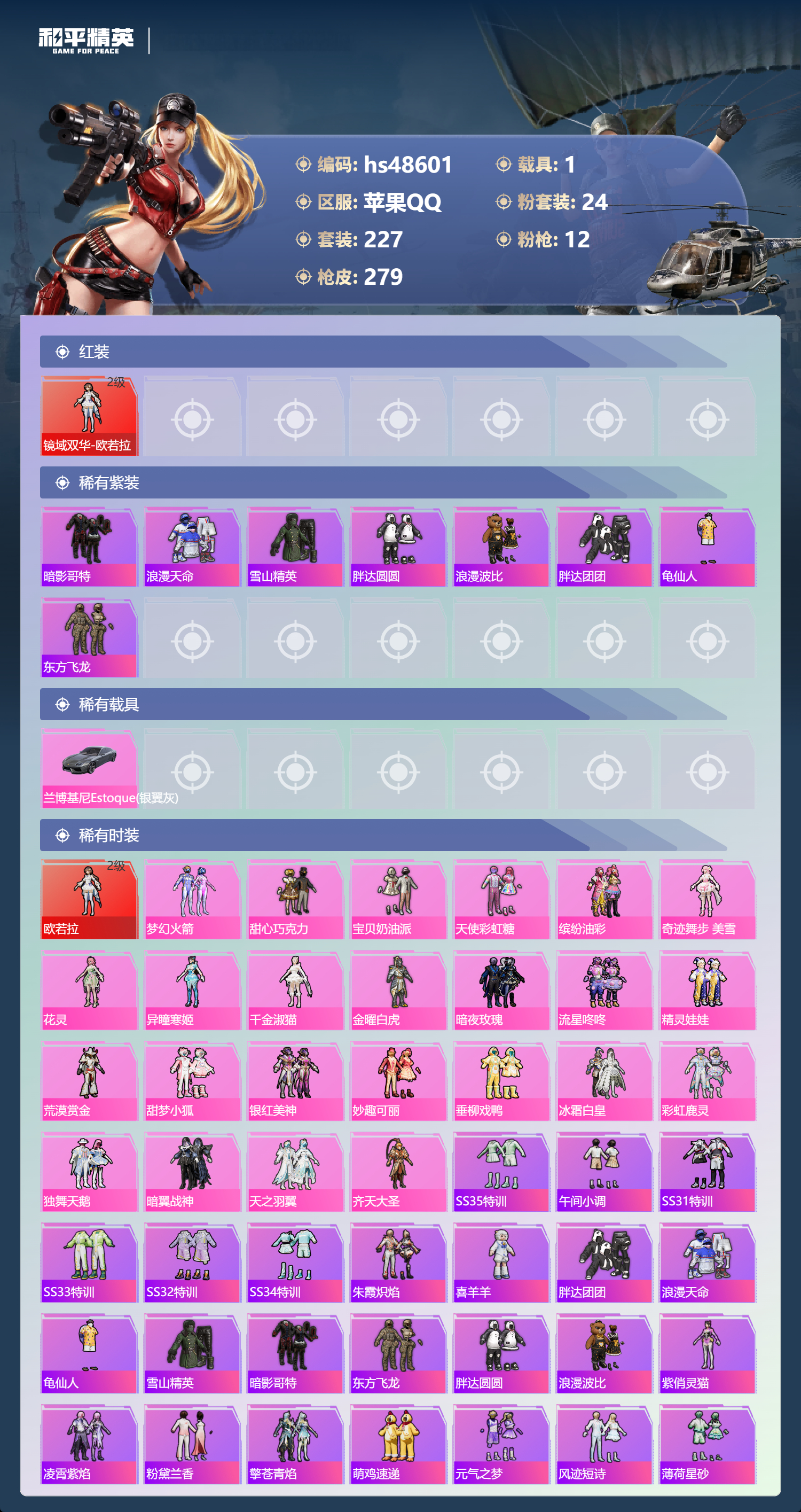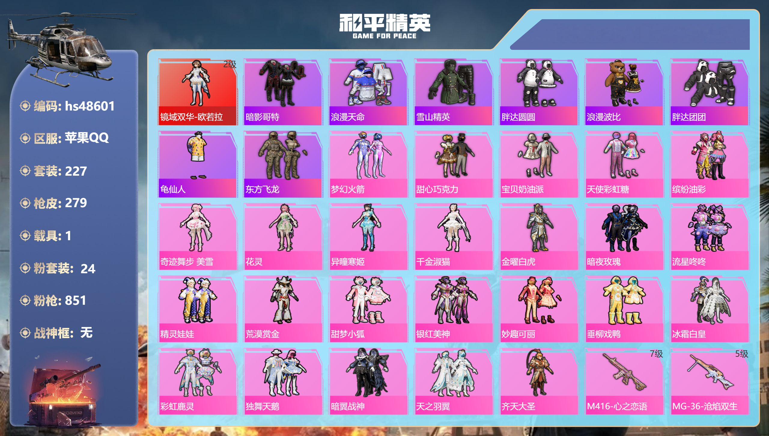【11175847】【不可二次】【苹果QQ】龟仙人 金曜白虎 漫步者 流星咚咚 M762-奇异狩猎者 M416-心之恋语 缤纷油彩 浪漫波比 天之羽翼 纯白誓言 AKM-奇异狩猎者 SCAR-L-梦幻火箭 M24-镜域双华 M762-瑞龙福将 潮萌小黄鸭 黑色刀锋 M417射手步枪 龙翔九天飞行器 齐天大圣 SCAR-L-锦绣绵绵 AKM-炫紫旋律 暗夜玫瑰 金耀白虎 天之羽翼飞行器 M417-