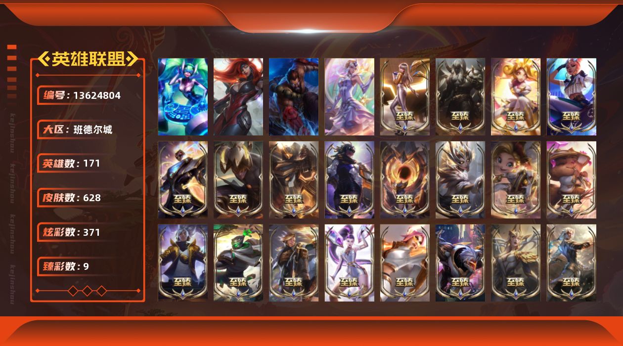 【11177282】[13624804]t30092【班德尔城】628皮肤 371炫彩 9臻彩 40神话/82限定/60传说/171英雄 账号等级:1344 单双排段位:翡翠【重要头像】雪花 两仪无极 我麦是开的么 魔女丽桑卓炫彩 魄罗宇航员 源计划艾瑞莉娅 星守金克丝炫彩 烈焰美人薇恩炫彩 披萨鸡 战斗学院伊泽瑞尔神话炫彩 不错哦 至臻青花瓷拉克丝 至臻神凰行者霞 至