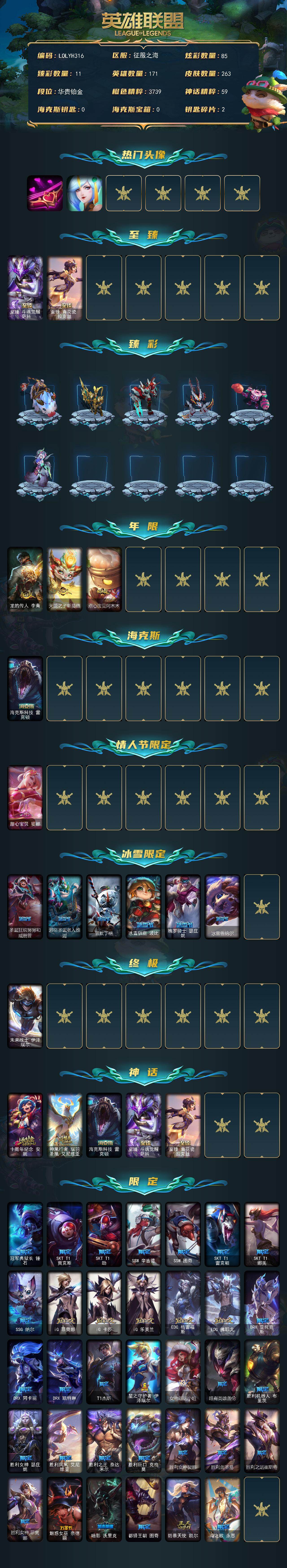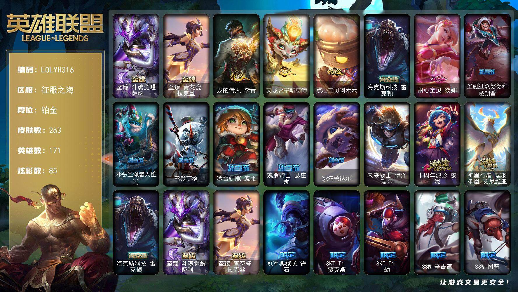 【11177609】【LOLYH316】171英雄/263皮肤/1终极/5神话/44限定/11臻彩/85炫彩/28传说/48史诗/铂金账号等级:771/爱情之歌/春晖神女/至臻斗魂觉醒萨科/至臻青花瓷拉克丝/无畏骑士瑟庄妮赤子初心/吕布奉先炫金战神/霸天战士雷恩加尔星啸天火/战斗学院卡特琳娜盛典礼服/星之守护者奥莉安娜未来之光/霸天异形卡兹克刹那银光/可爱可爱粉红红布里茨/战斗学院盖伦不死鸟/魔