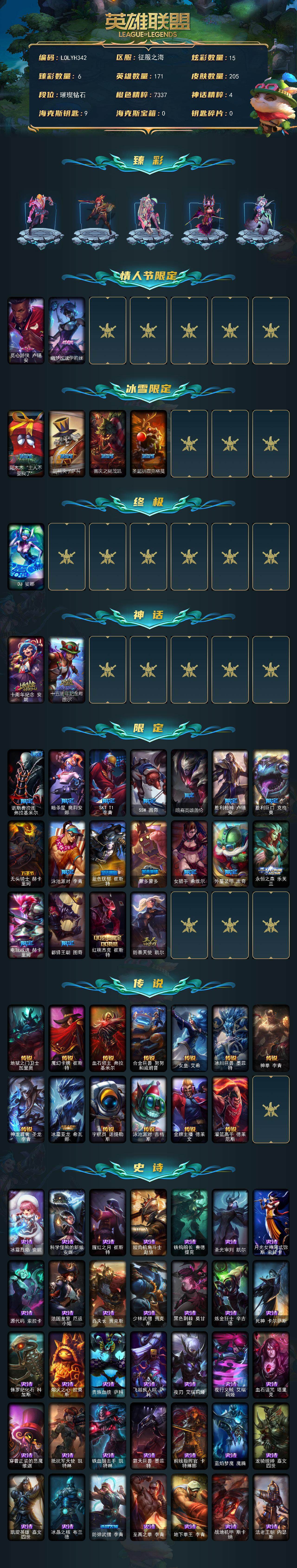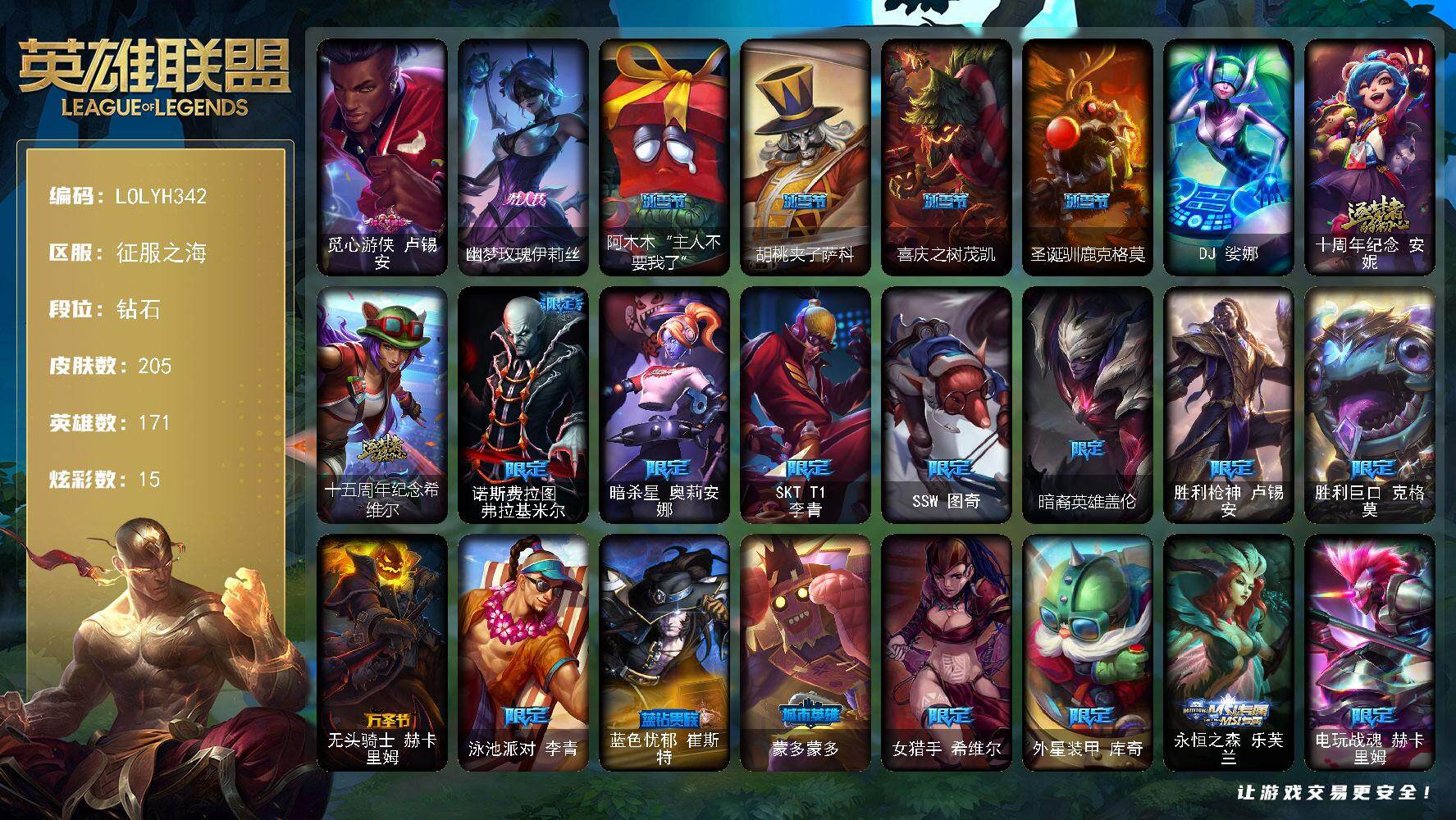 【11178048】【LOLYH342】171英雄/205皮肤/1终极/2神话/24限定/6臻彩/15炫彩/13传说/51史诗/钻石/神龙尊者圣龙李青登龙/黎明使者锐雯黑夜使者/幻灵战斗猫金克丝梦幻强袭/星之吞噬者莫甘娜热情之末/魔女阿卡丽虚荣/净雪之月莫甘娜冬虹/觅心游侠卢锡安/幽梦玫瑰伊莉丝/阿木木:“主人不要我了”/胡桃夹子萨科/喜庆之树茂凯/圣诞驯鹿克格莫/DJ娑娜/十周年纪念安妮/十五