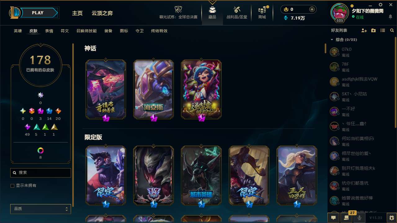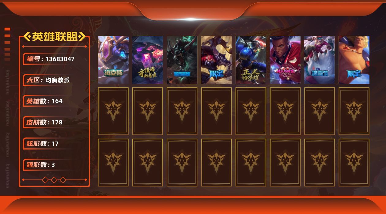 【713】[13683047]t30236【均衡教派】 178皮肤 17炫彩 3臻彩 3神话/14限定/20传说/164英雄 账号等级:525【重要头像】爱意绵绵 觅心游侠卢锡安 【重要皮肤】海克斯科技克格莫 暗星科加斯 荣誉使者玛尔扎哈 胜利机器人布里茨 胜利之剑亚托克斯 魄罗骑士瑟庄妮 泳池派对塔里克 SSW泰隆 暗杀星蒙多 防暴天使凯尔 圣诞狂欢基兰 圣诞驯鹿克格