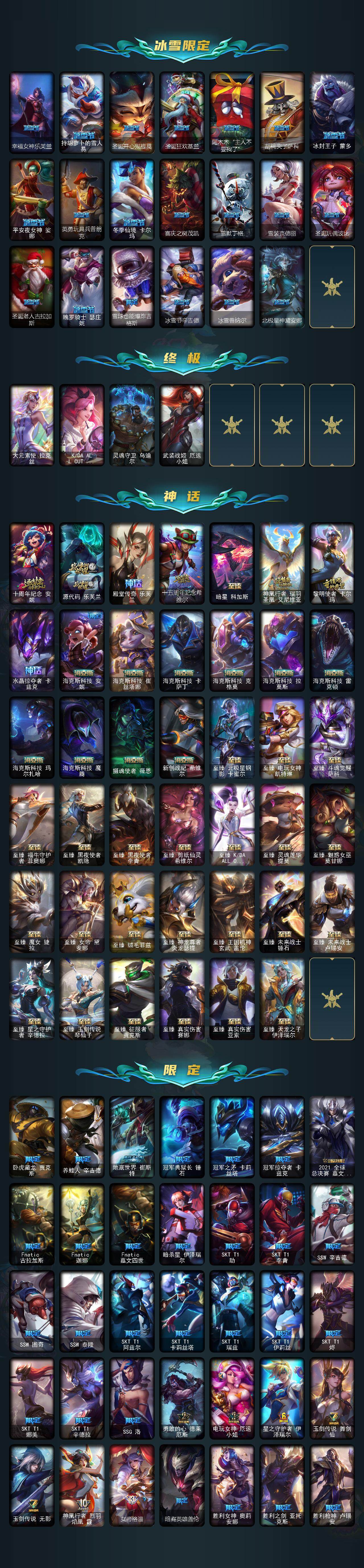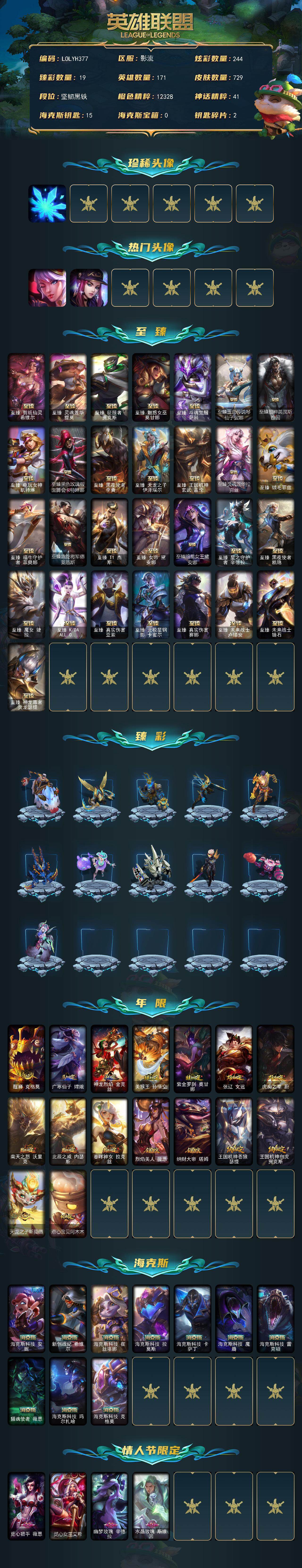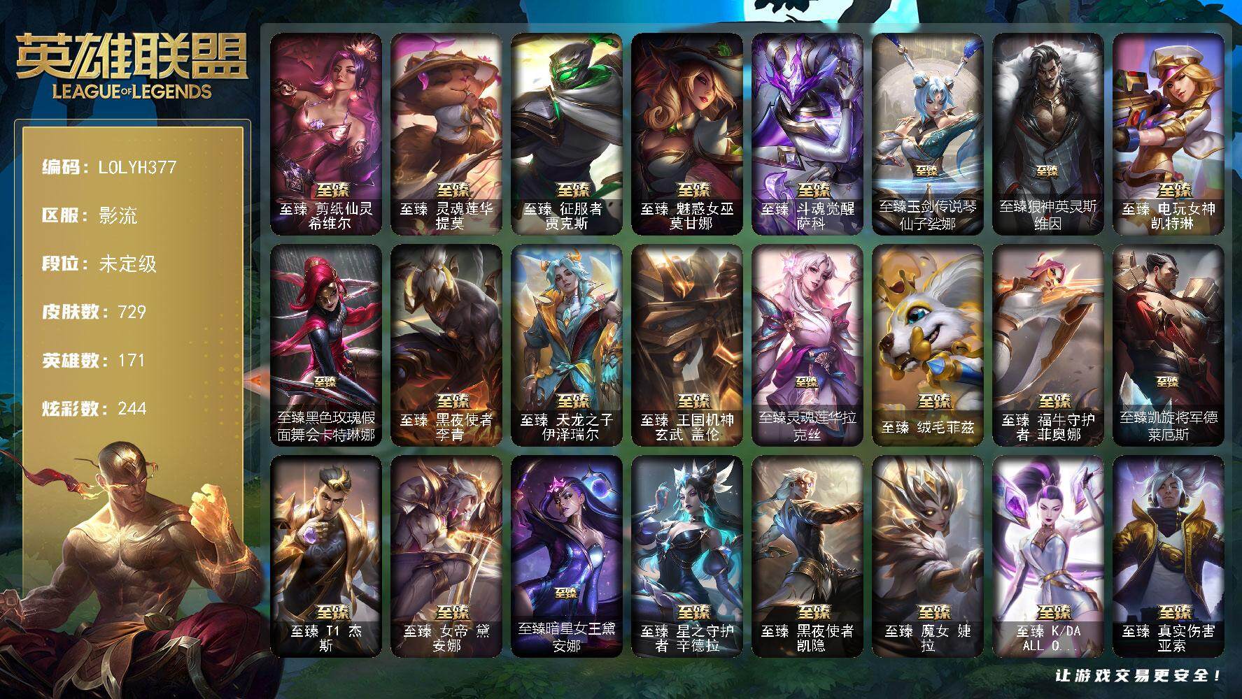 【7227】【LOLYH377】171英雄/729皮肤/6终极/47神话/114限定/19臻彩/244炫彩/73传说/133史诗/未定级/雪花/觅心之翼奎因/KDA阿卡丽头像/至臻剪纸仙灵希维尔/至臻灵魂莲华提莫/至臻征服者贾克斯/至臻魅惑女巫莫甘娜/至臻斗魂觉醒萨科/至臻玉剑传说琴仙子/至臻狼神英灵斯维因/至臻电玩女神凯特琳/至臻黑色玫瑰假面舞会卡特琳娜/至臻黑夜使者李青/至臻天龙之子伊泽瑞尔