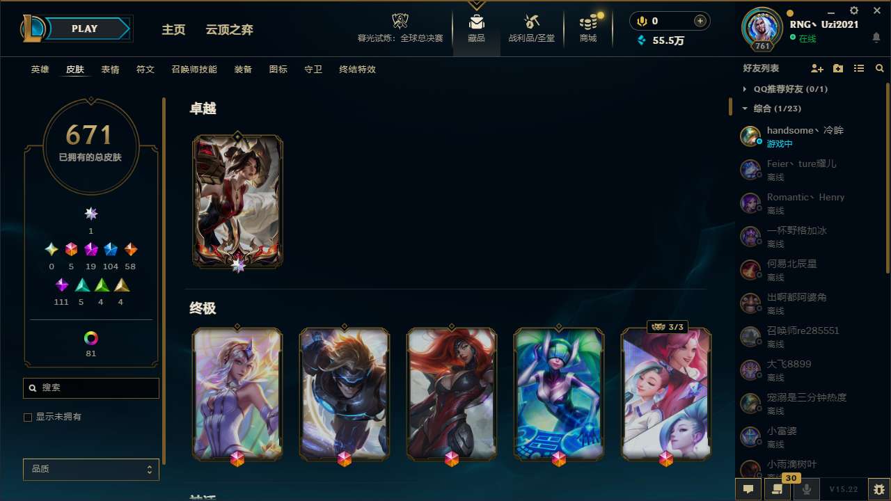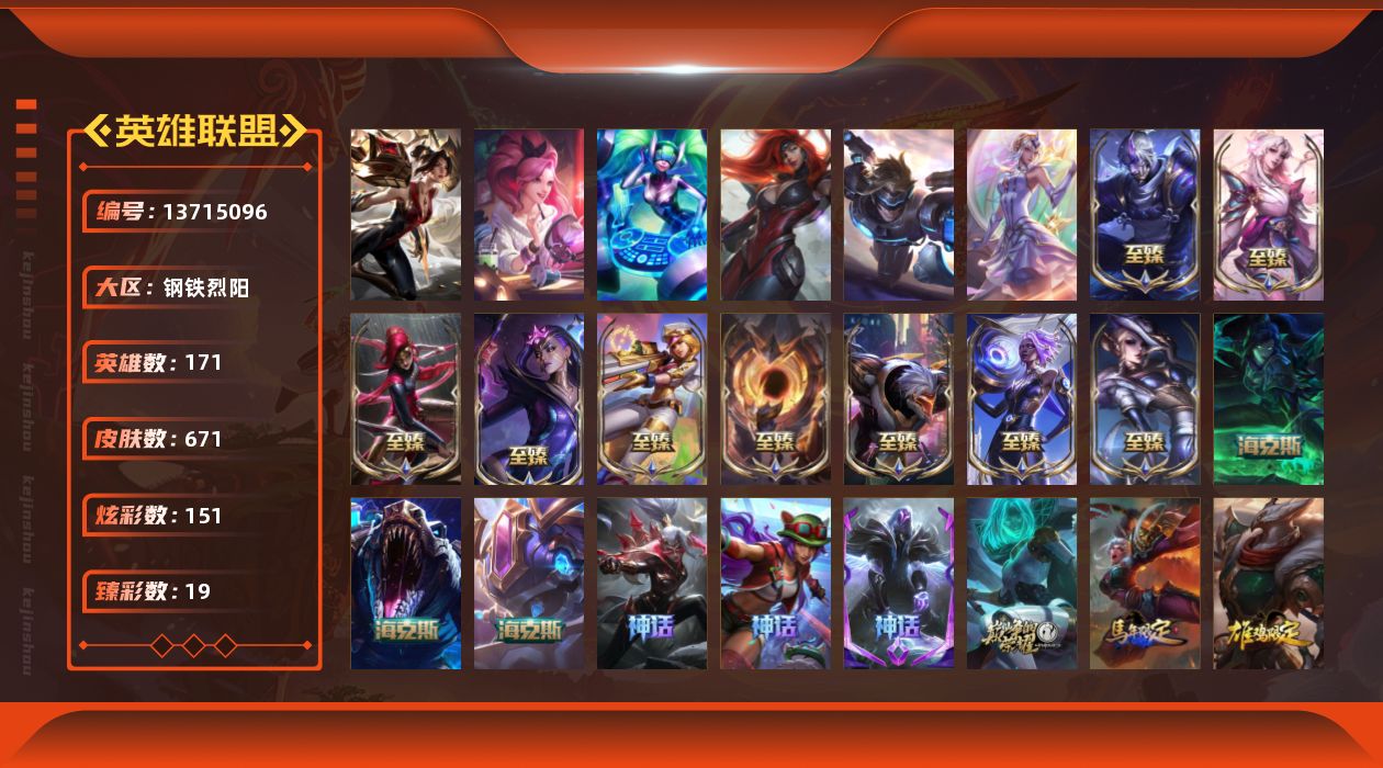【7391】[13715096]t30305 皇冠账号【钢铁烈阳】殿堂传奇卡莎 671皮肤 151炫彩 19臻彩 19神话/104限定/58传说/171英雄 账号等级:761 单双排段位:铂金【重要头像】大家伙 萨勒芬妮超级巨星 萨勒芬妮独立音乐人 披萨鸡 【重要皮肤】殿堂传奇卡莎 暗裔英雄嘉文四世至臻 灵魂莲华劫至臻 灵魂莲华拉克丝至臻 黑色玫瑰假面舞会卡特琳娜至臻 暗星女王